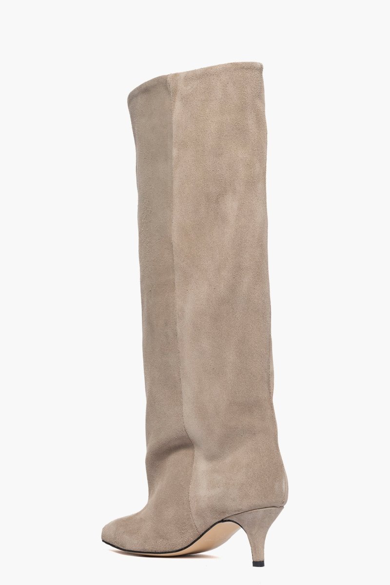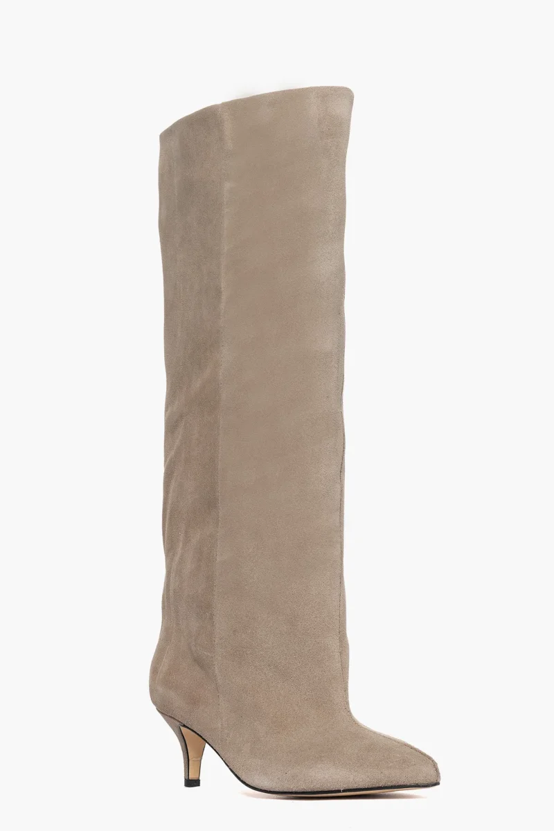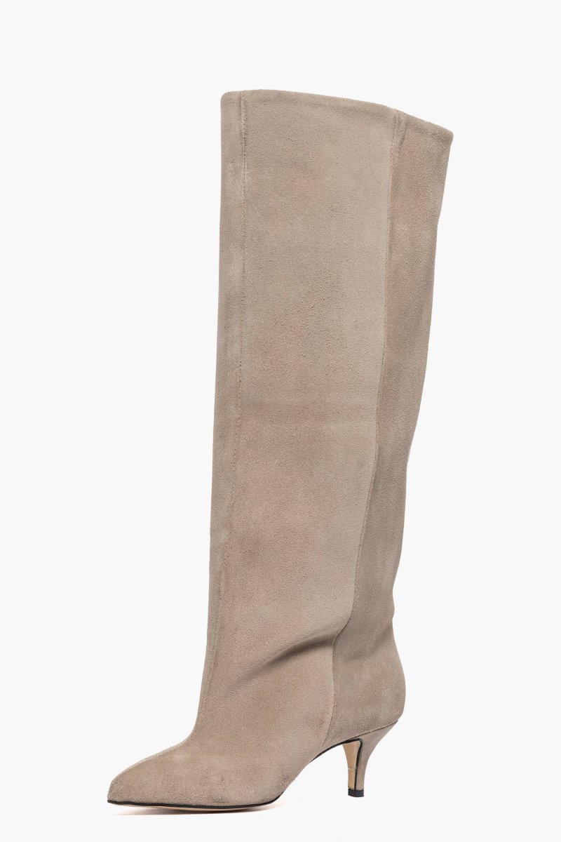 Stivale con gambale ampio circa 46/48 cm in camoscio taupè, privo di cerniera, interni i similpelle, tacco rivestito, altezza 6. Calzano giusti, punta stretta. Calzature artigianali, made in Italy.