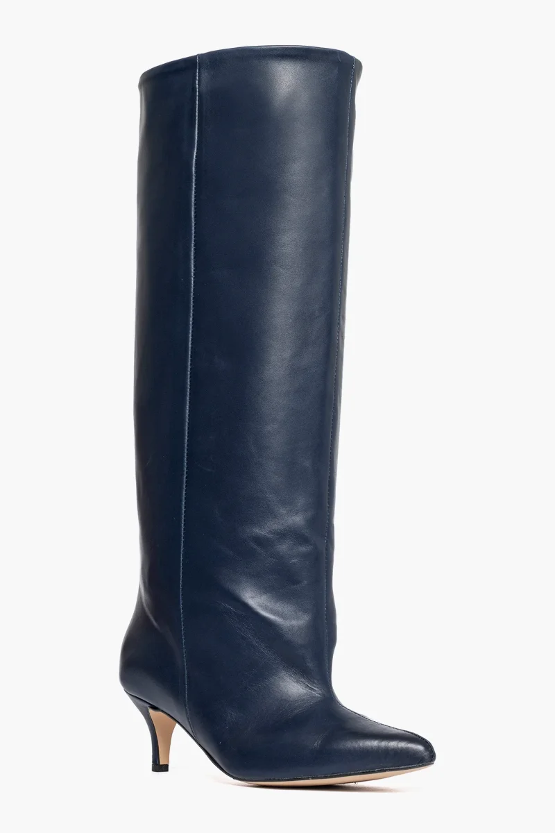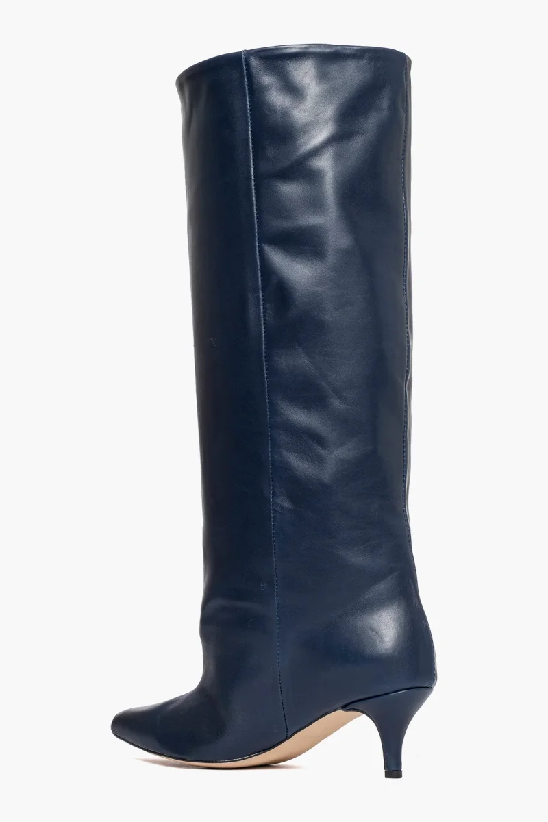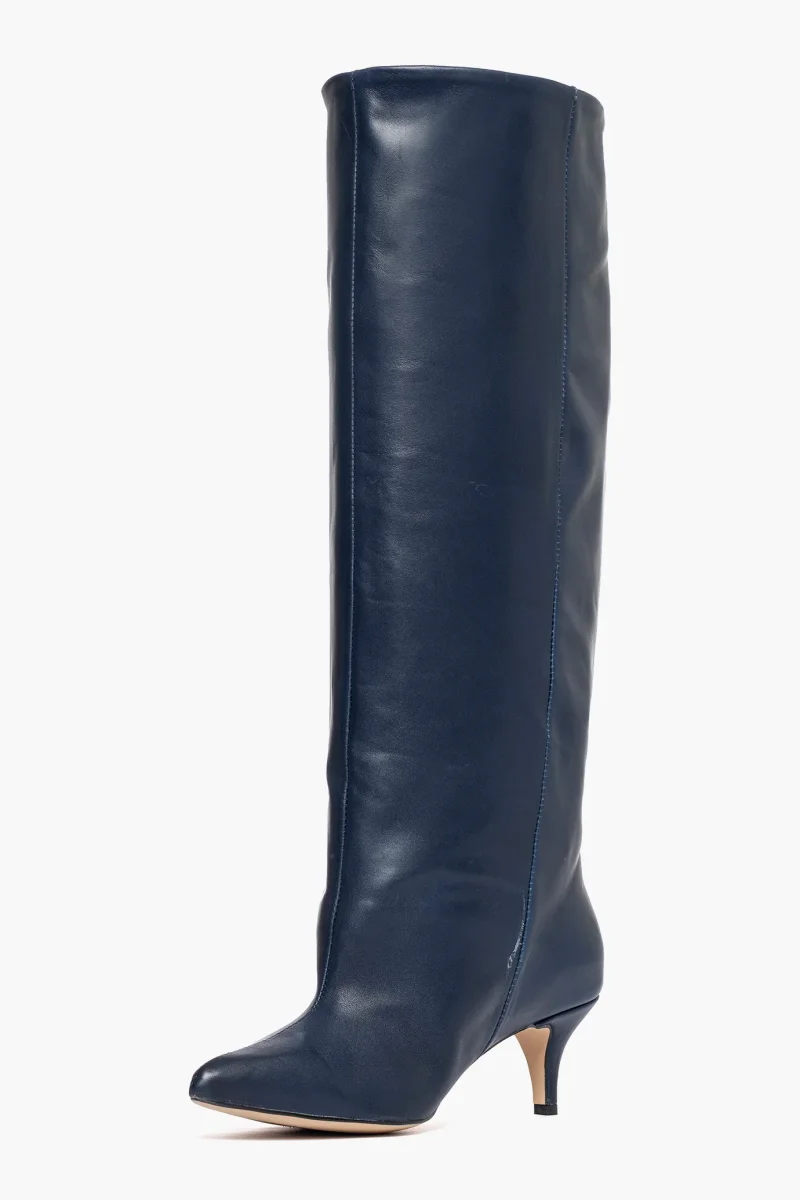 Stivale con gambale ampio circa 46/48 cm in pelle blu privo di cerniera, interni i similpelle, tacco rivestito, altezza 6. Calzano giusti, punta stretta. Calzature artigianali, made in Italy.