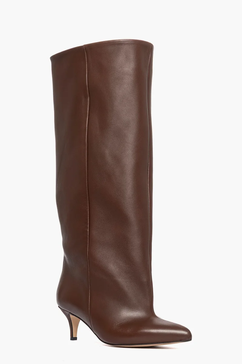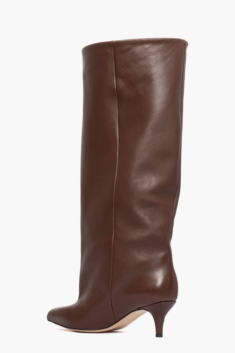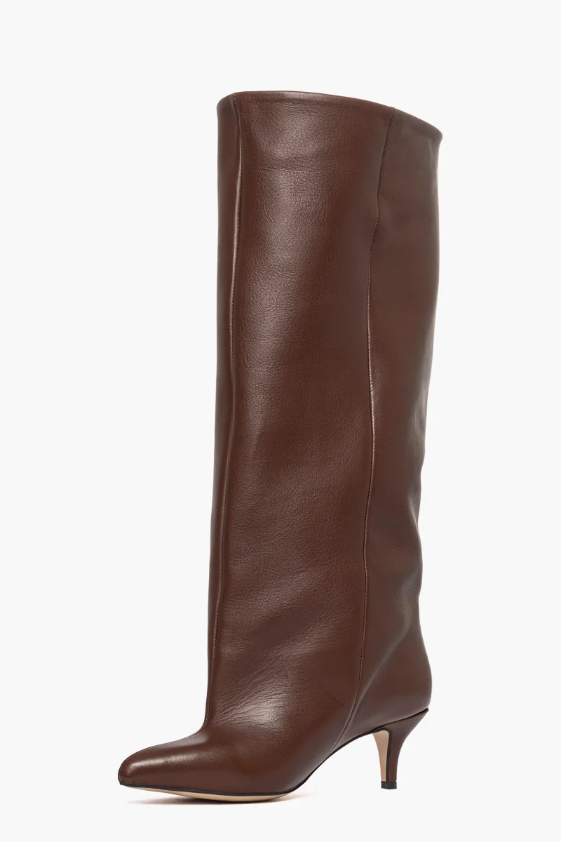 Stivale con gambale ampio circa 48/50 cm in pelle marrone privo di cerniera, interni i similpelle, tacco rivestito, altezza 6. Calzano giusti, punta stretta. Calzature artigianali, made in Italy.