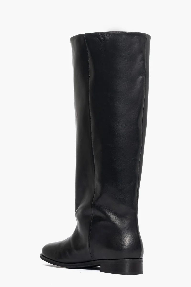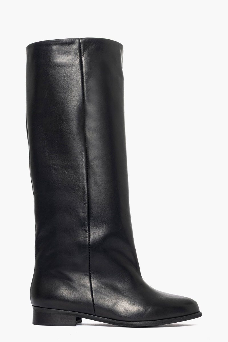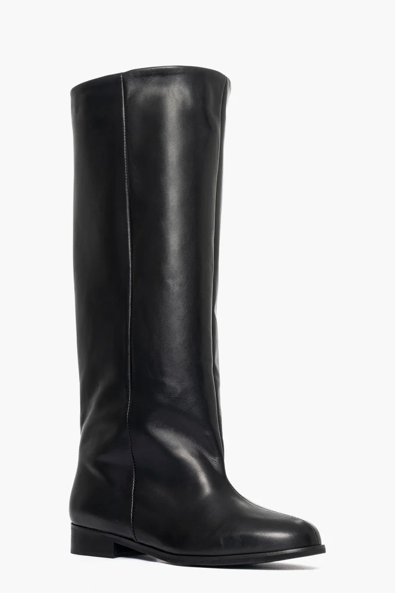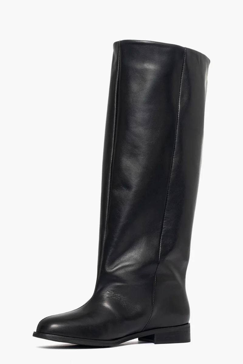 Stivale con gambale ampio variabile per numero da 43 fino a 48 cm circa, altezza gambale 43cm, in pelle nero, interni in similpelle, punta tonda, privo di cerniera, suola nera, tacco 3. Calzano regolari. Calzature artigianali, made in Italy.