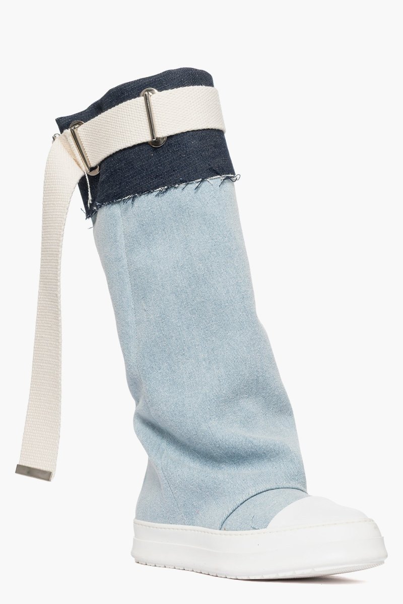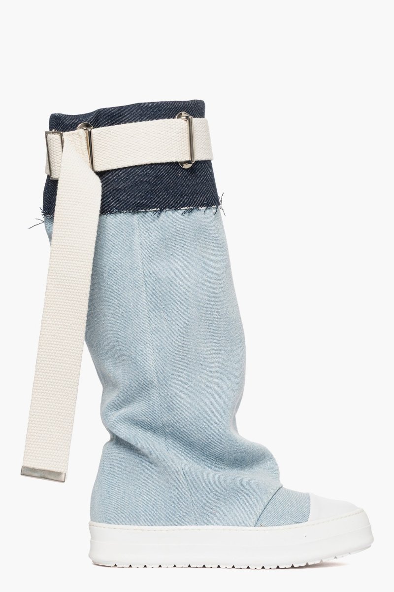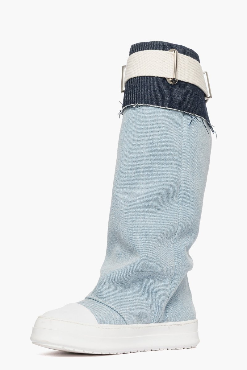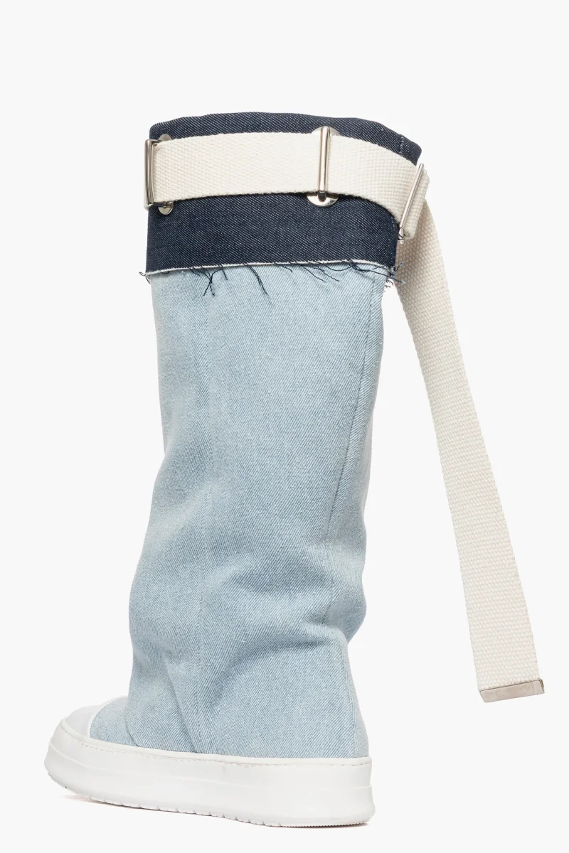 Stivale in denim chiaro e riporto in denim blu scuro, con cintura in juta nel colore beige e accessorio nel colore argento, punta in gommato bianco, suola in gomma bianca, altezza 3/4. Calzano comode, punta tonda. Calzature artigianali, made in Italy.