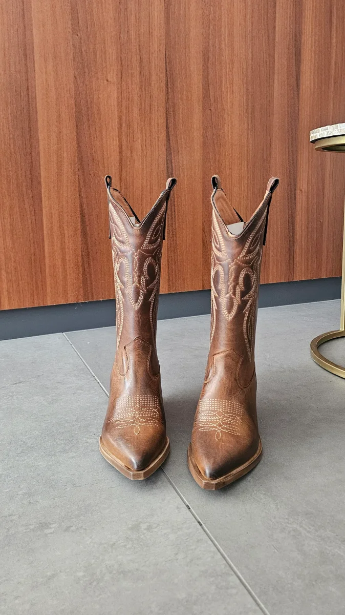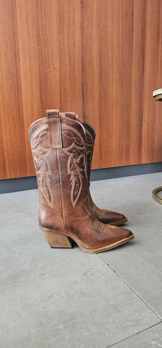 Stivali al polpaccio in nabuk ingrassato cuoio con ricamo, spazzolato, suola in thunit neutro, spazzolato, altezza 7 cm. Interni e sottopiede in similpelle, privo di cerniera. Calzano giuste, punta stretta in avanti. Calzature realizzate artigianalmente, rigorosamente Made in Italy.b