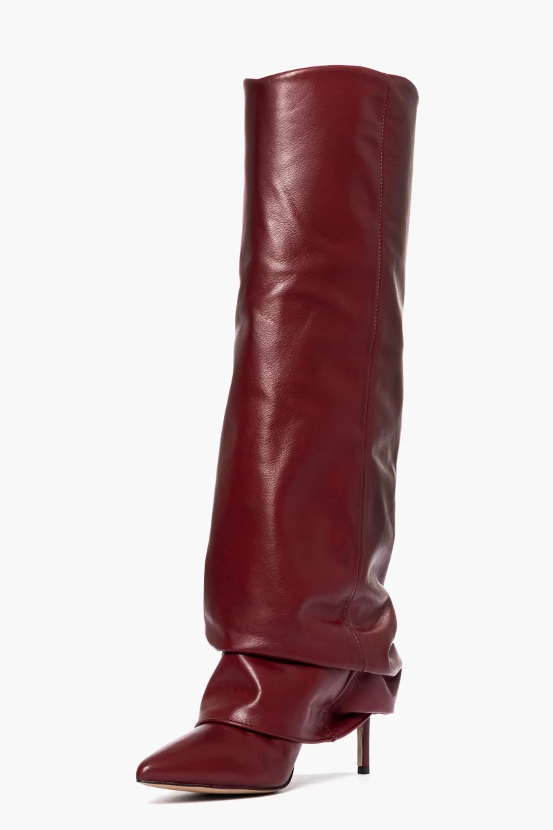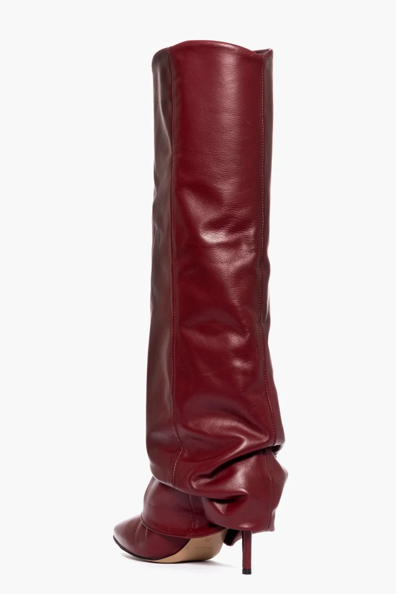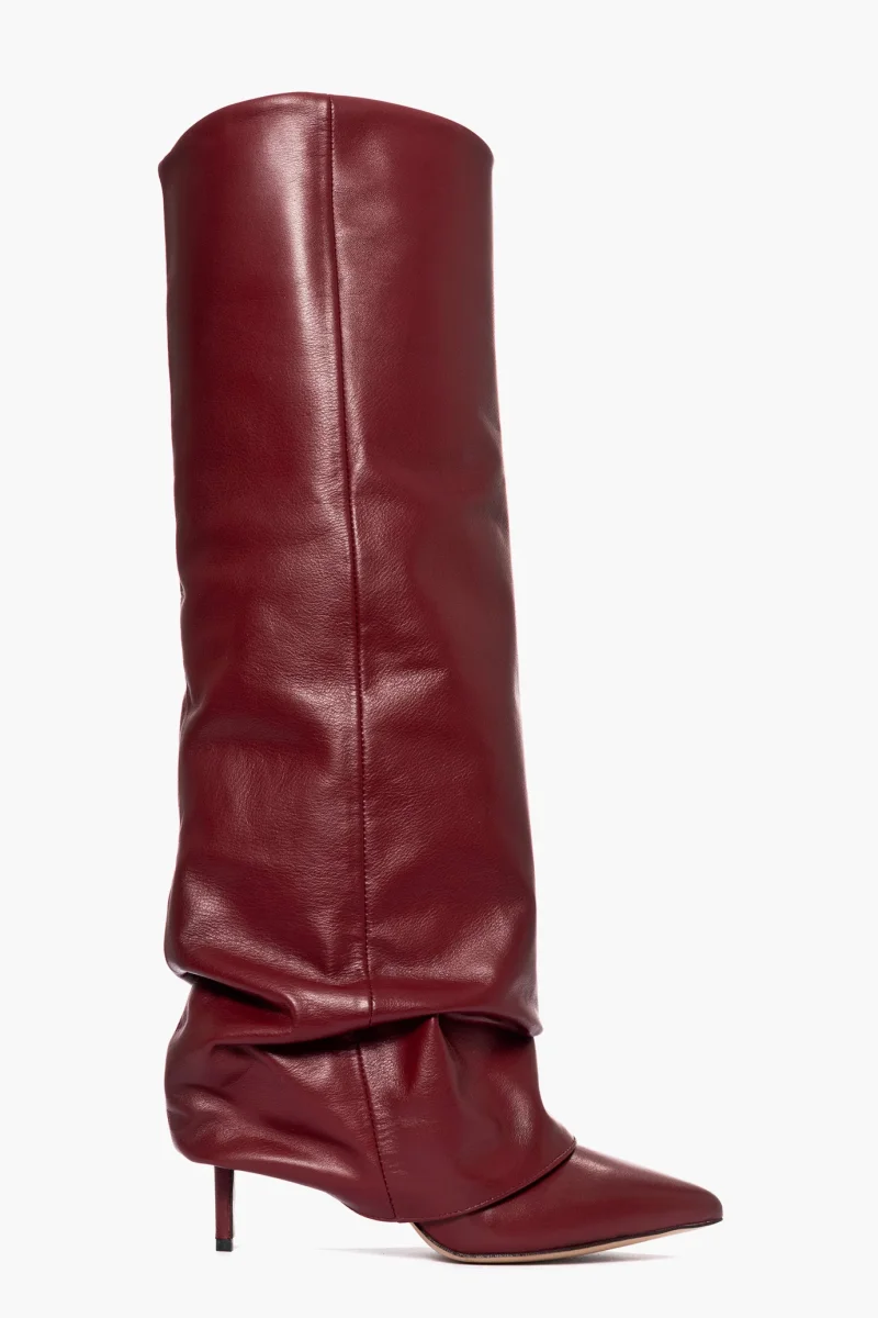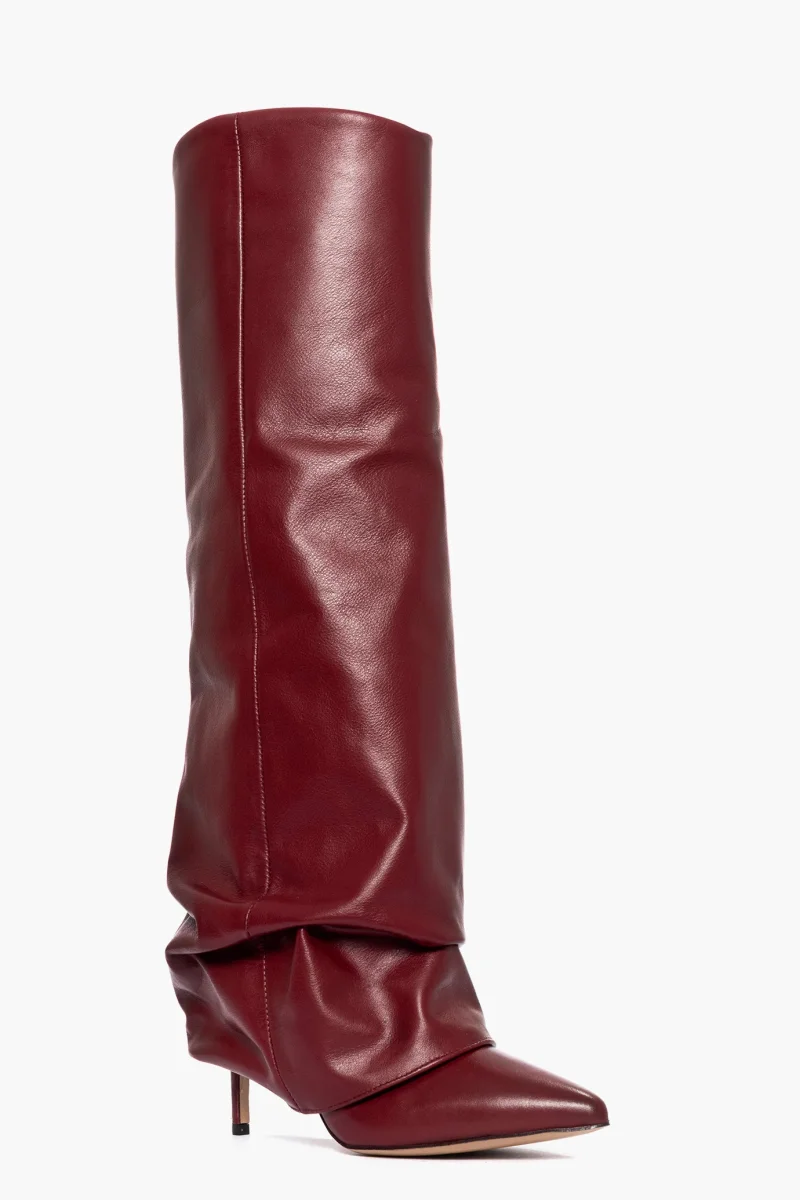Stivale della nuova collezione in pelle bordeaux, risvolto aggrappato, tacco rivestito 8.5, punta stretta in avanti, interni in similpelle, privo di cerniera, calzano regolari. Calzature artigianali, made in Italy.