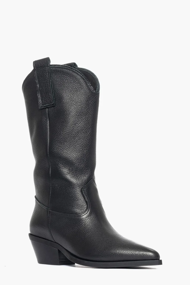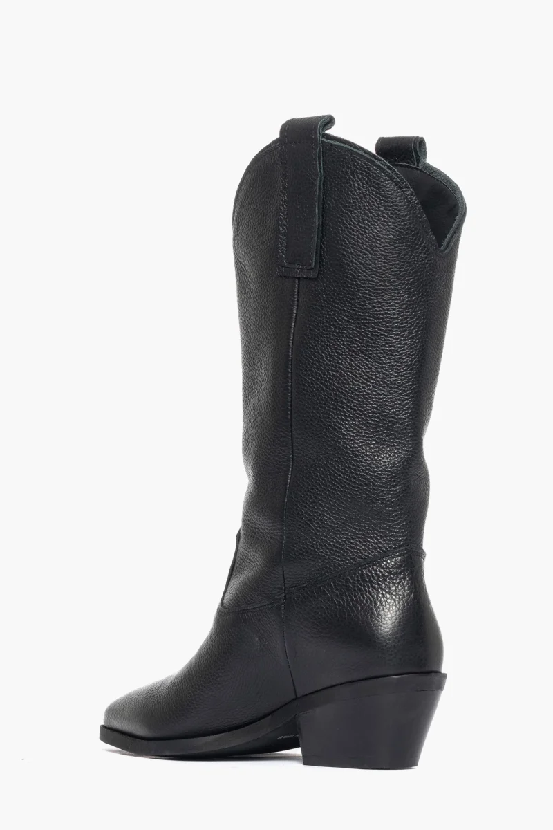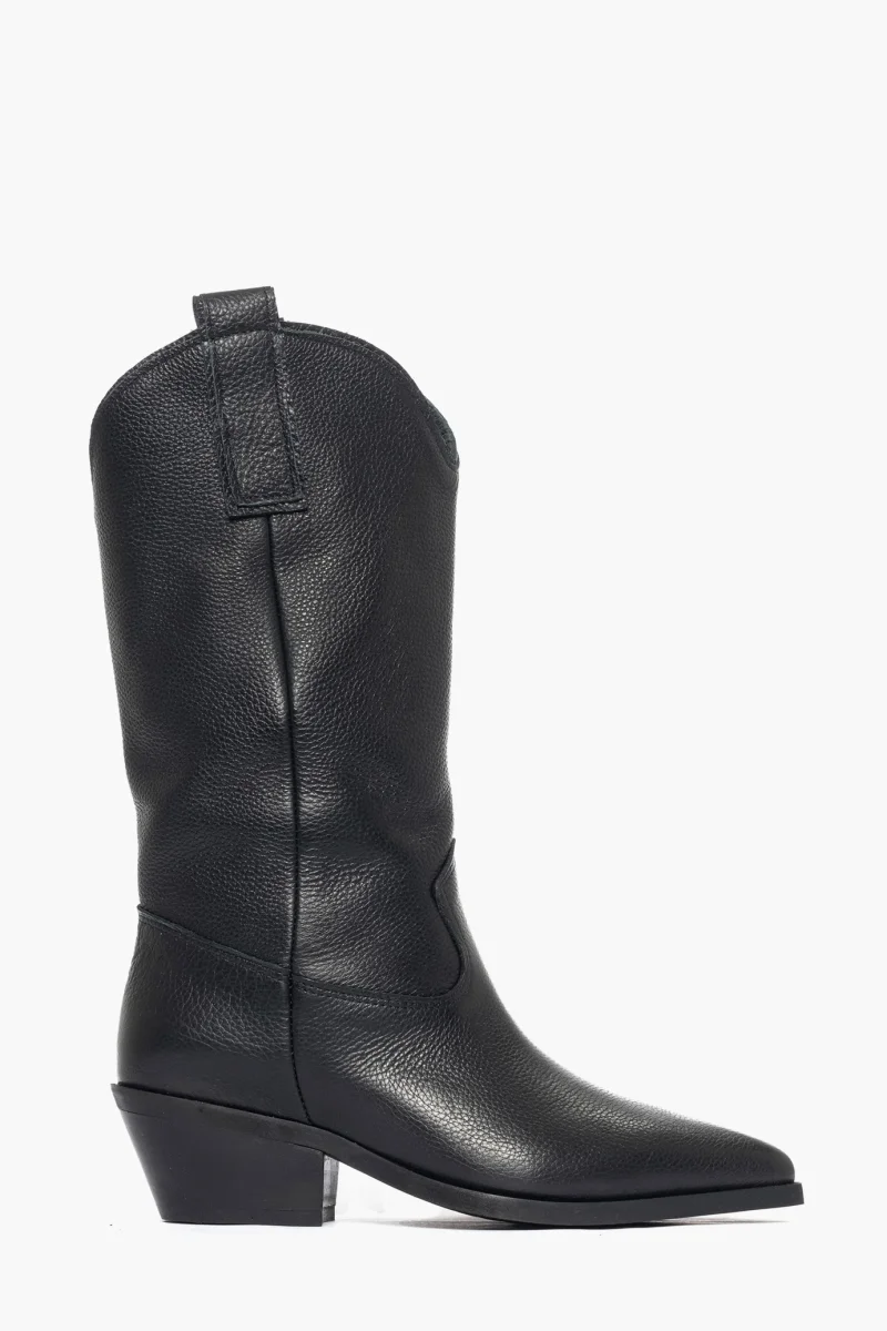 Stivale in pelle bottalata nera , privo di cerniera, forma texana, punta in avanti, interni in similpelle, suola neutra, arrivano al polpaccio, altezza 5. Calzano regolari, calzature artigianali, made in Italy.