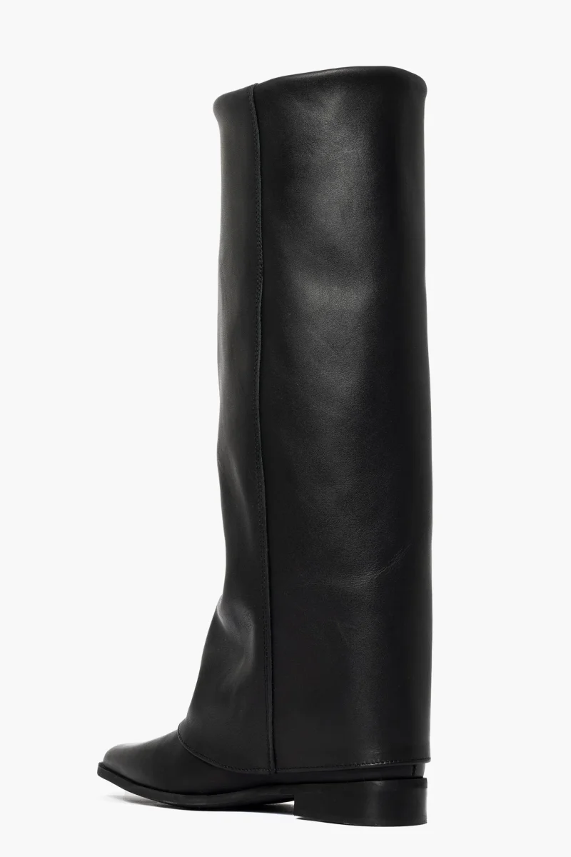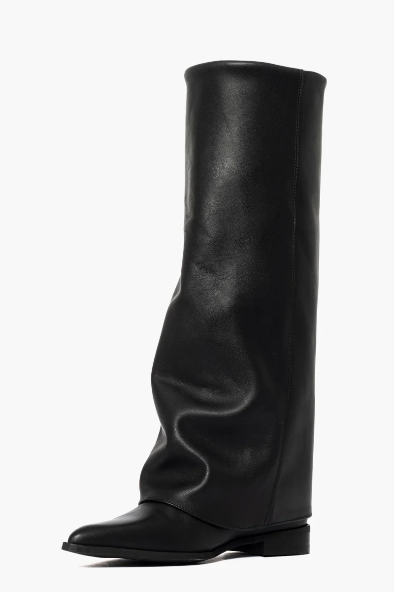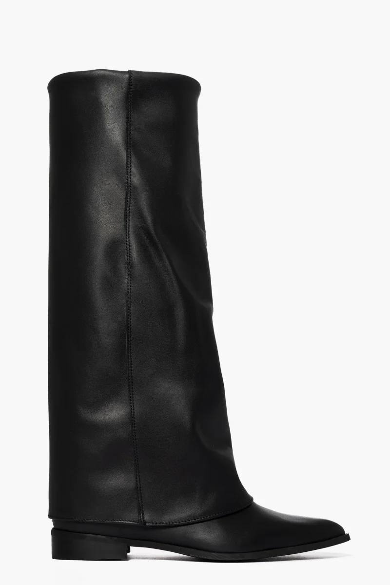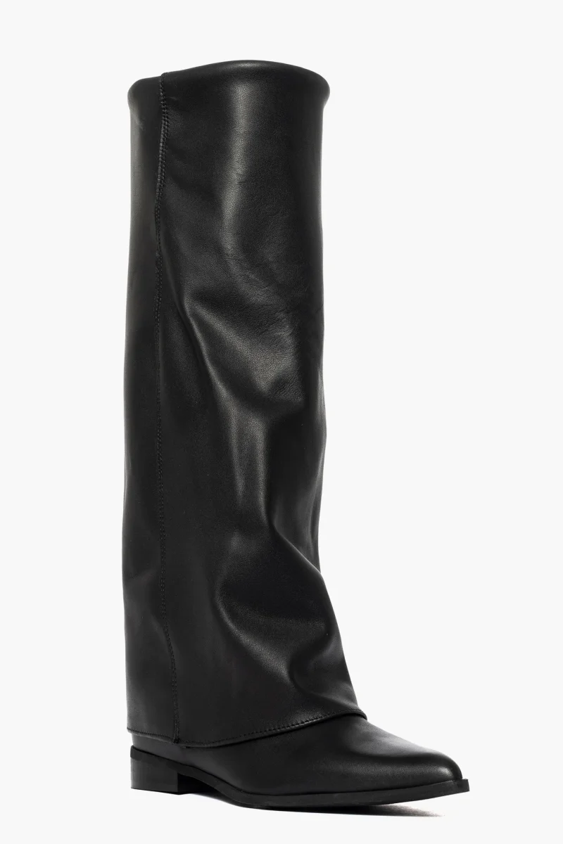 Stivale in pelle nero con risvolto e rialzo interno, altezza totale 7,punta stretta, interni in similpelle. Calzano giusti. Calzature artigianali, made in Italy.