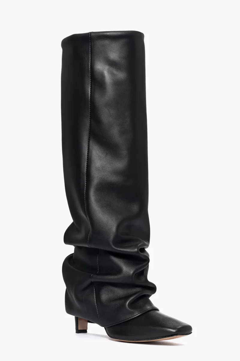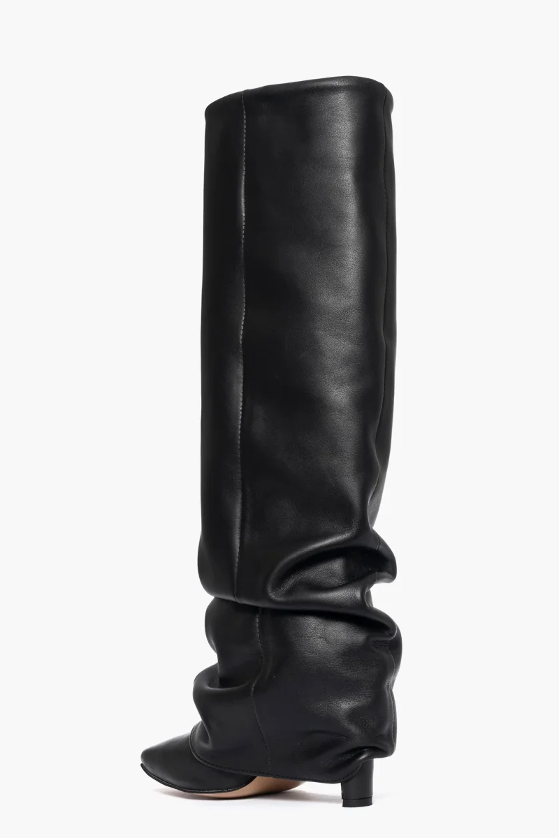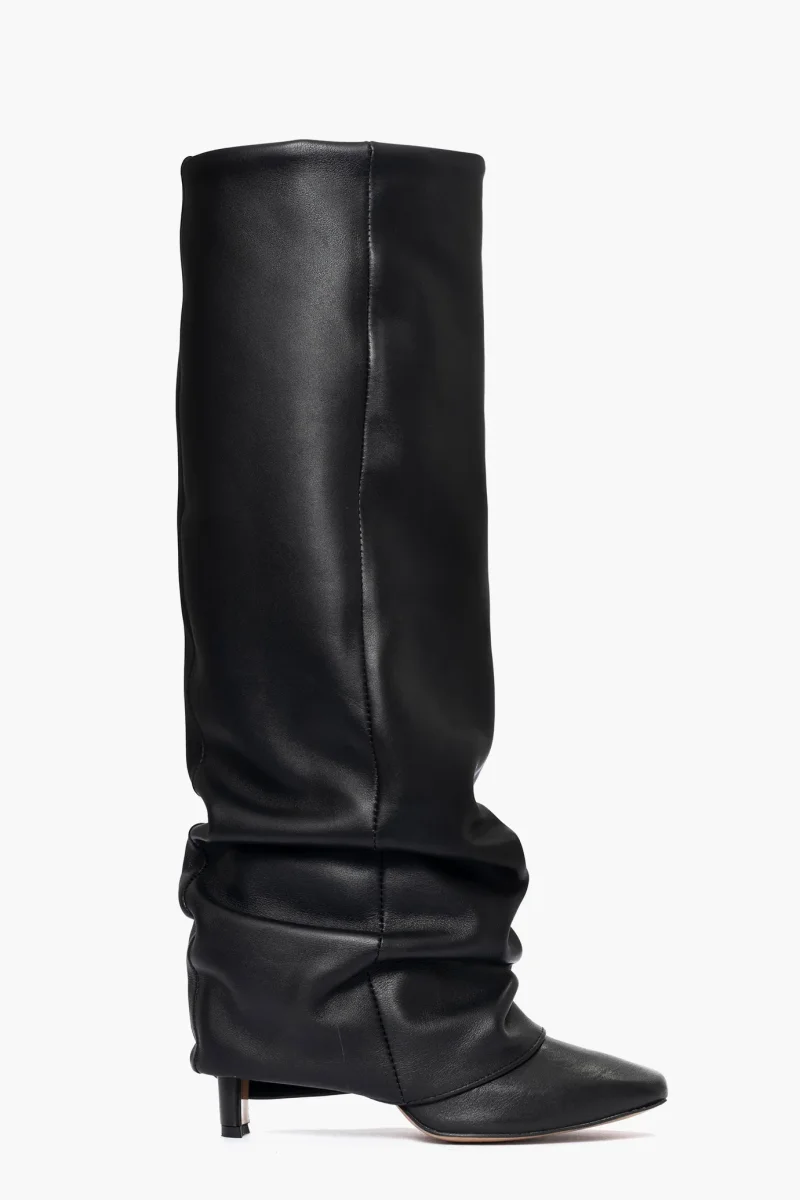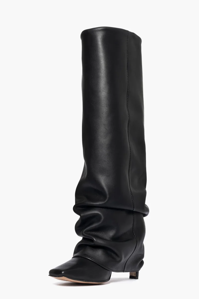 Stivale in pelle nero, con risvolto e punta quadrata in avanti, tacco rivestito, altezza 9, interni in similpelle, privo di cerniera, calzano regolari, calzature artigianali, made in Italy.