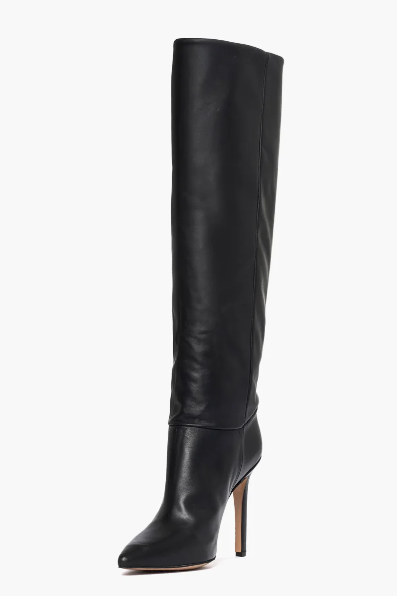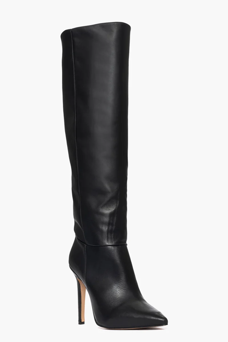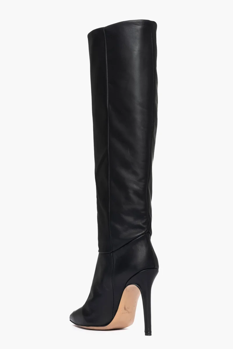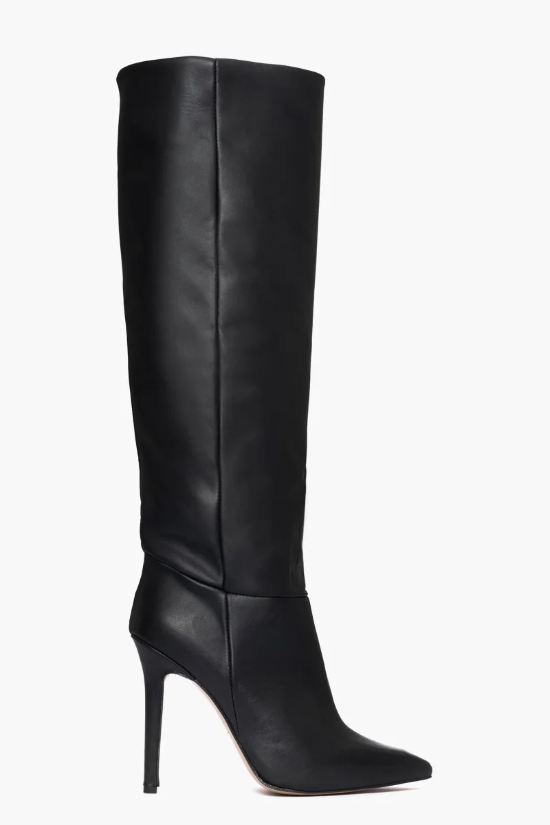 Stivali sotto al ginocchio pelle nero con tacco a spillo, altezza 11 cm rivestito, interni e sottopiede in similpelle. Calzata giusta, punta stretta in avanti, privo di cerniera. Calzature artigianali, made in Italy.