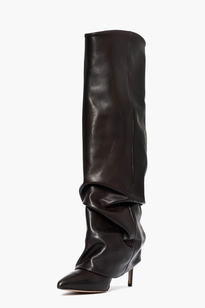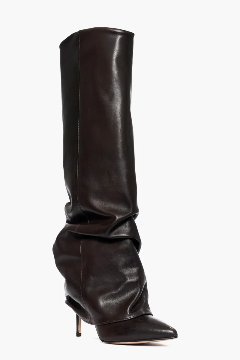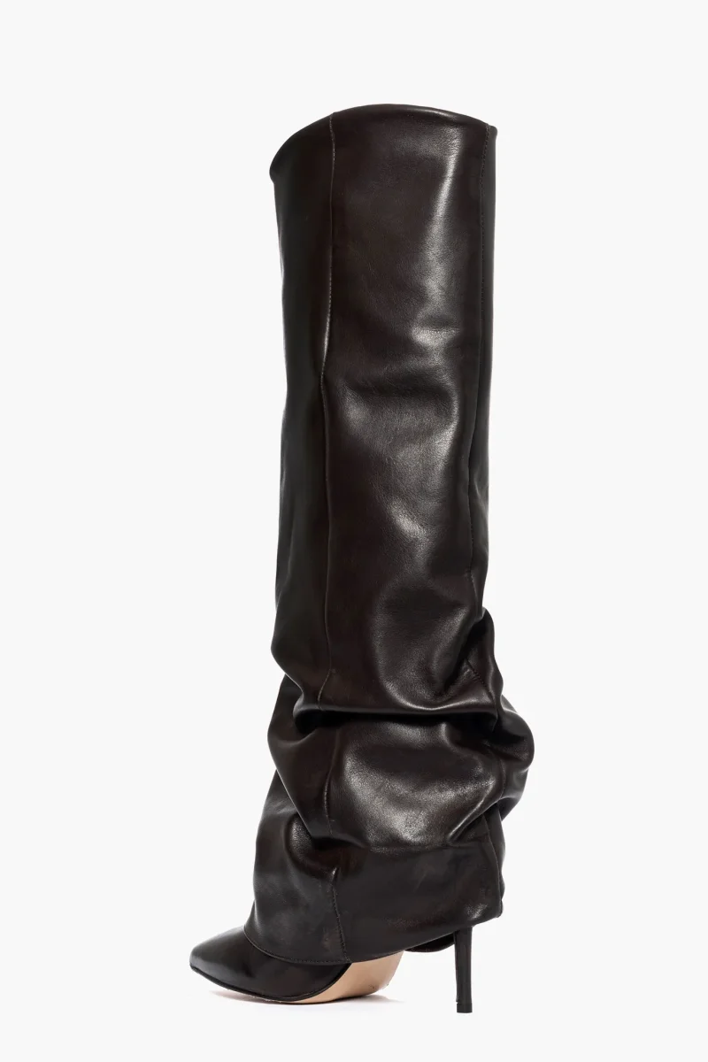 Stivale della nuova collezione in pelle testa di moro con risvolto, tacco rivestito 8.5, punta stretta in avanti, interni in similpelle, privo di cerniera, calzano regolari. Calzature artigianali, made in Italy