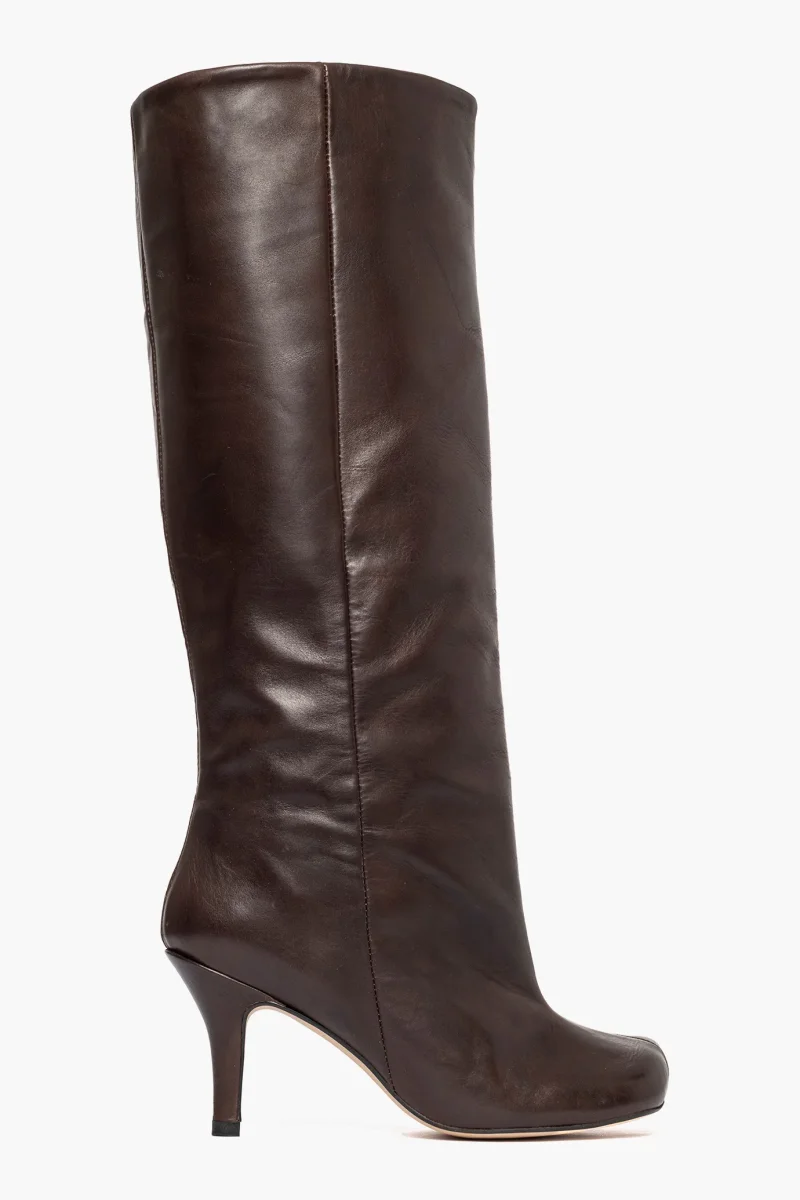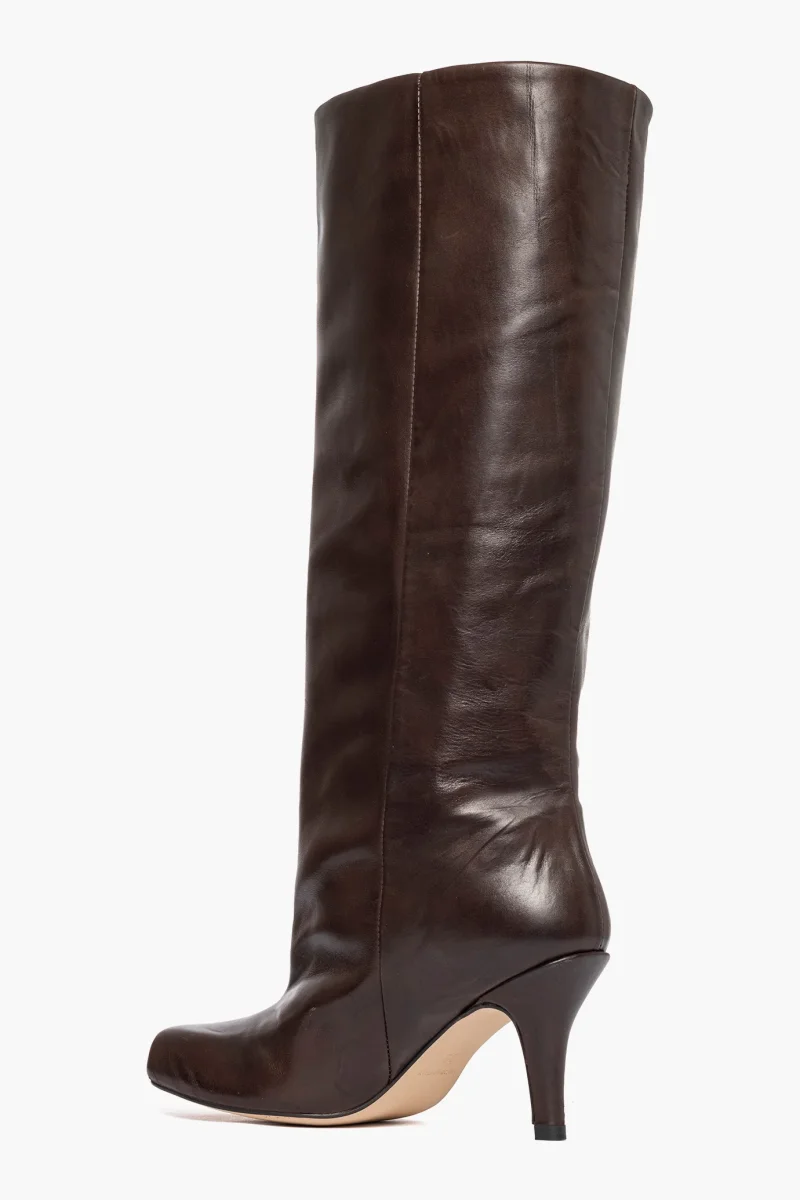 Stivale in pelle testa di moro sotto al ginocchio, punta quadrata, tacco rivestito, altezza 7, interni in similpelle, gambale alto 41 cm con una circonferenza di circa 38/40 cm. Calzano comodi. Calzature artigianali, made in Italy.