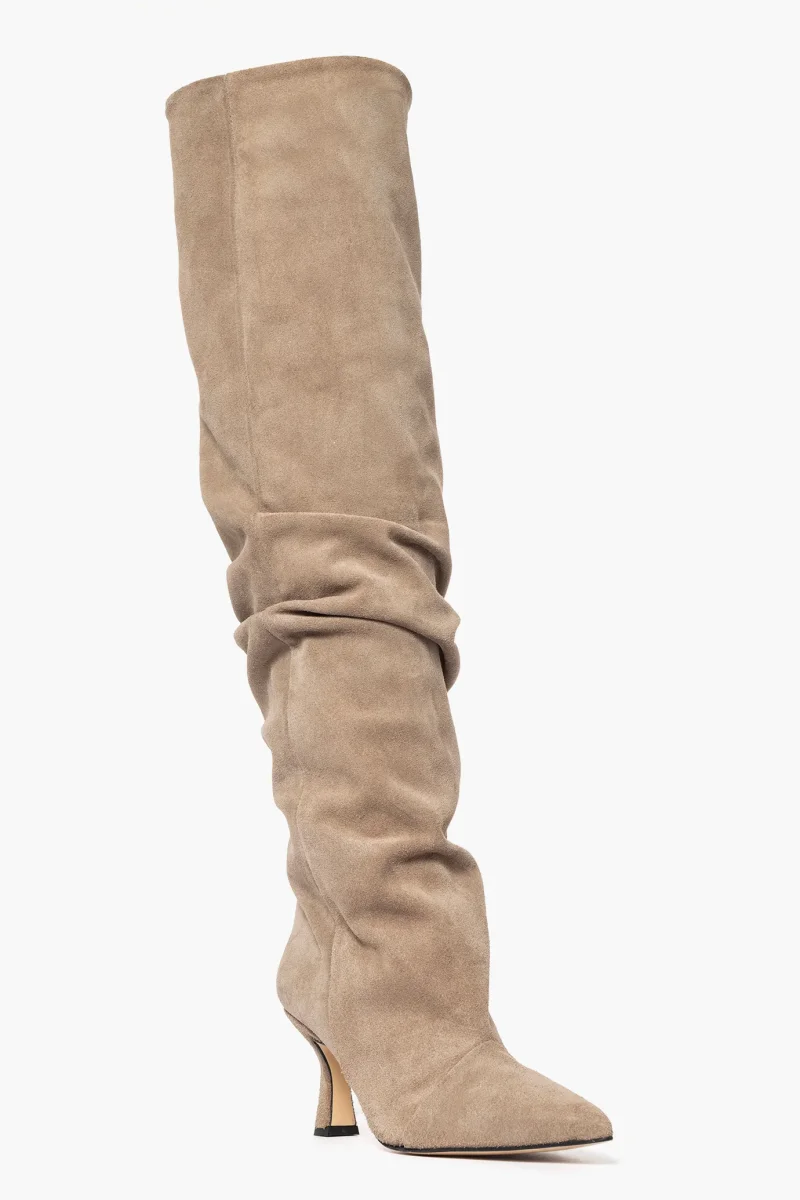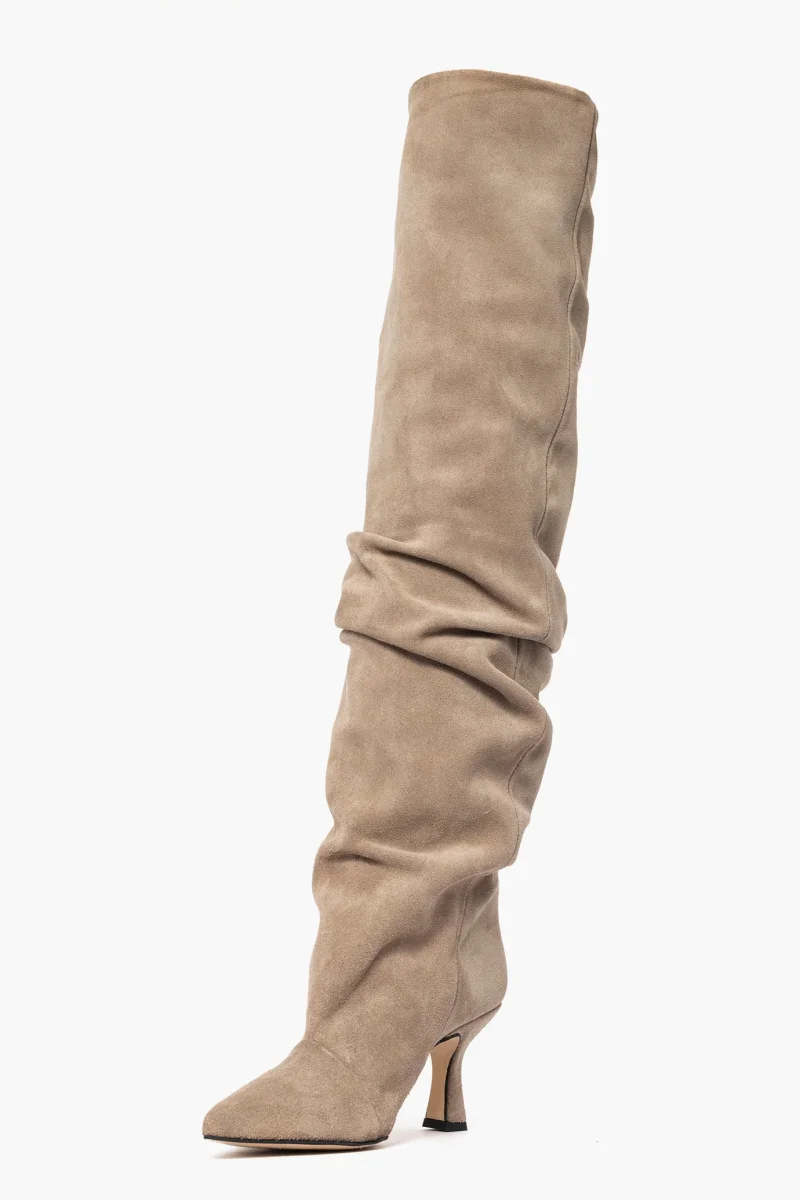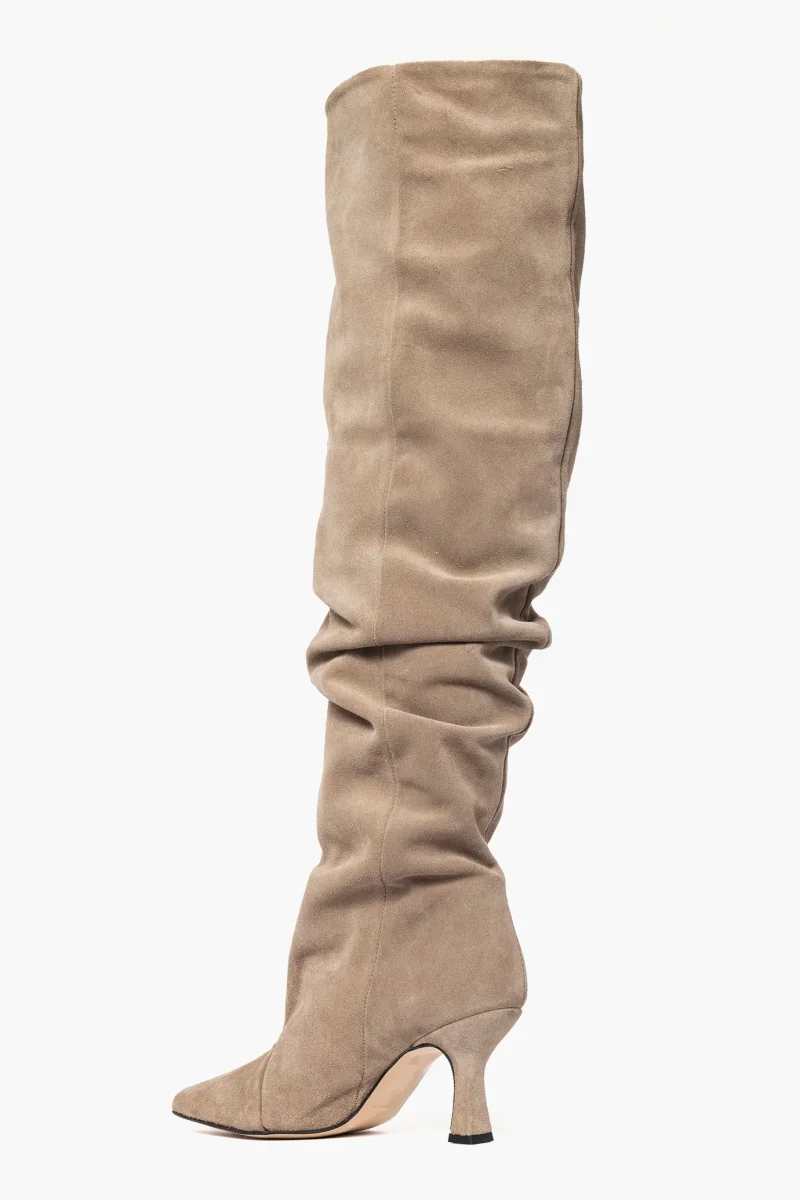 Stivale sopra al ginocchio in camoscio taupè, aggrappato davanti e su tutto il gambale, interni in similpelle, privo di cerniera, tacco rivestito, 8.5. Calzano regolari, punta leggermente stretta in avanti. Calzature artigianali, made in Italy.
