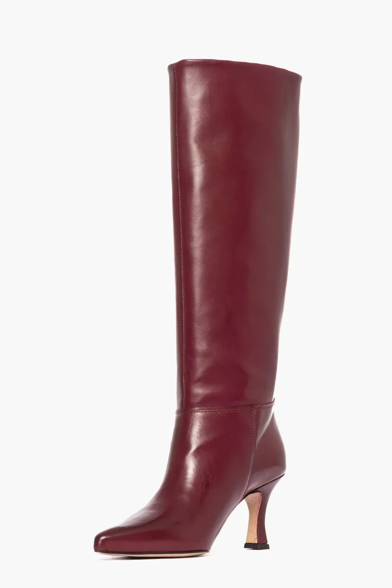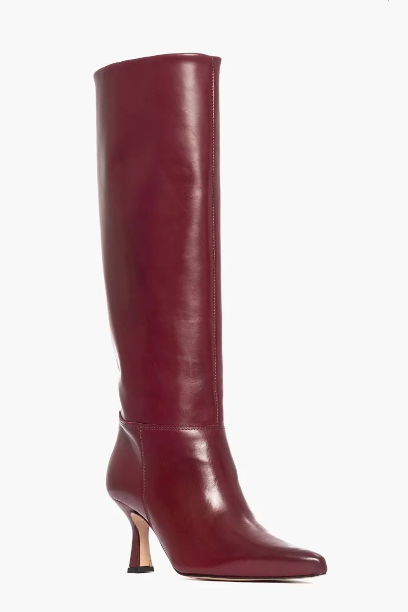 Stivale sotto al ginocchio in pelle bordeaux, con tacco rivestito, altezza 8.5, interni in similpelle. Calzano regolari. Calzature artigianali, made in Italy.