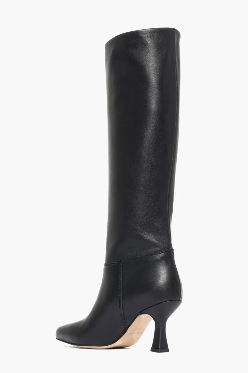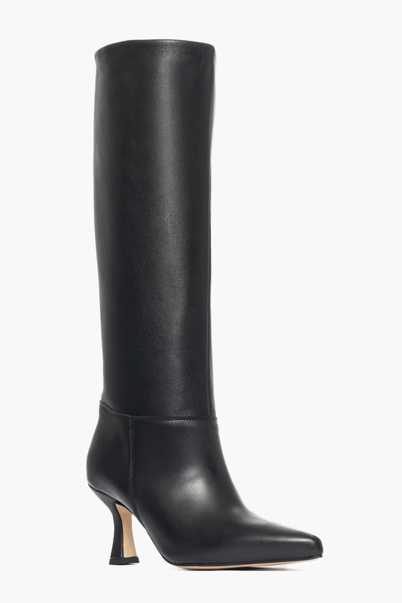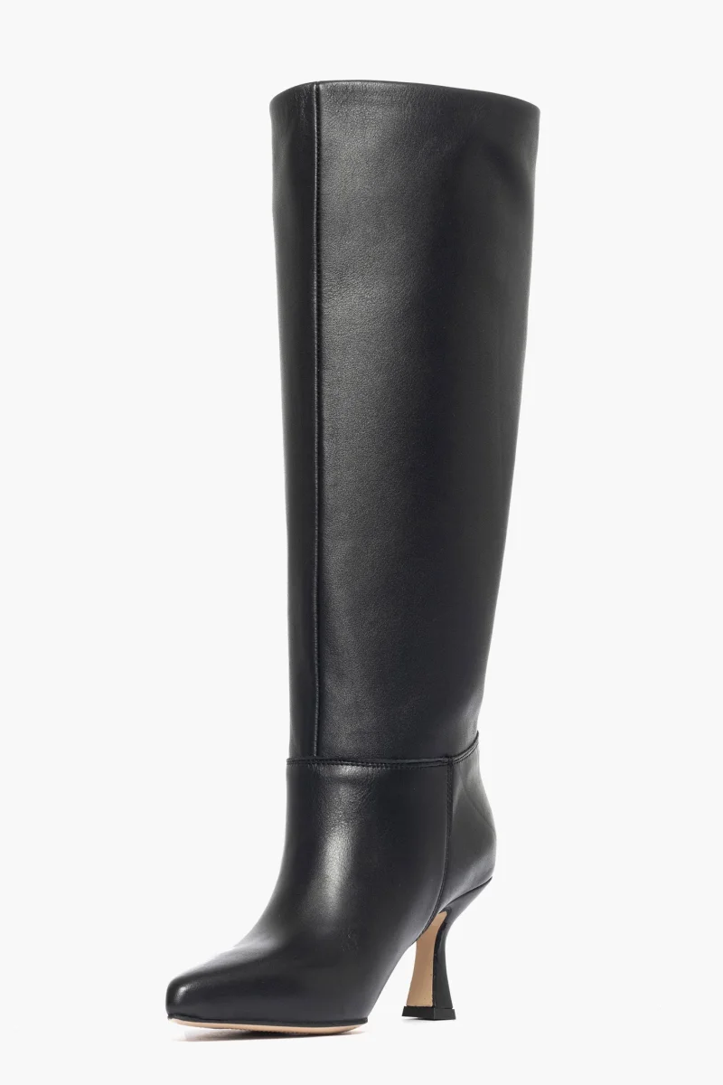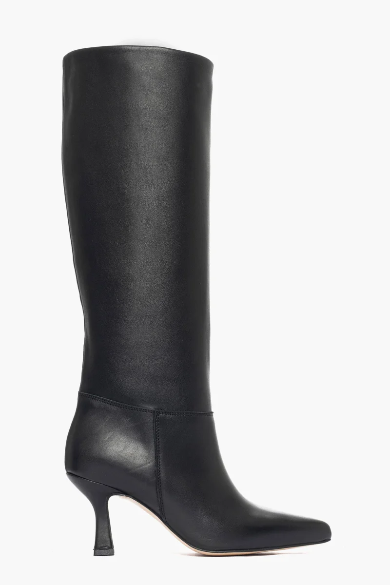 Stivale sotto al ginocchio in pelle nero, con tacco rivestito, altezza 8.5, interni in similpelle. Calzano regolari. Calzature artigianali, made in Italy.