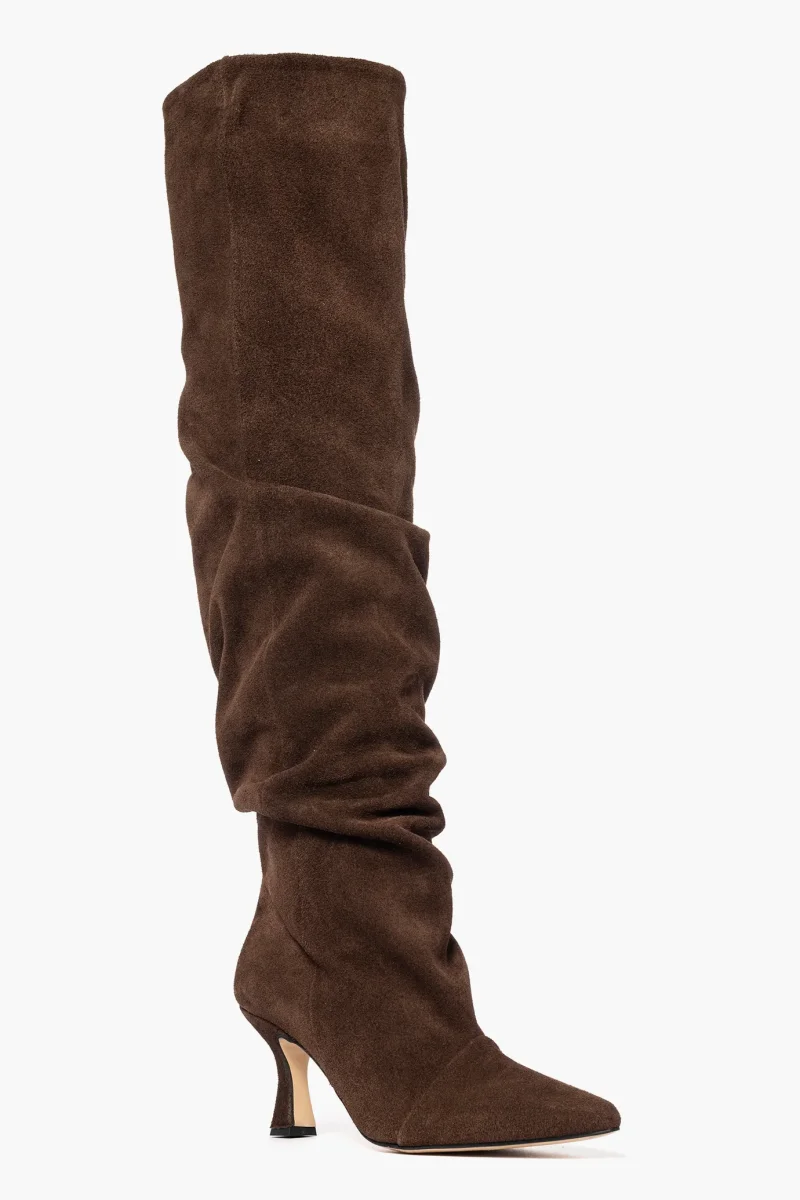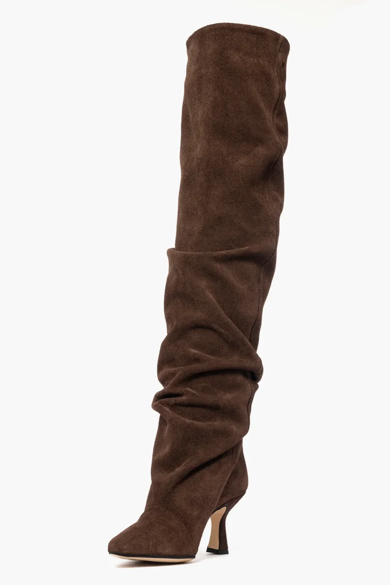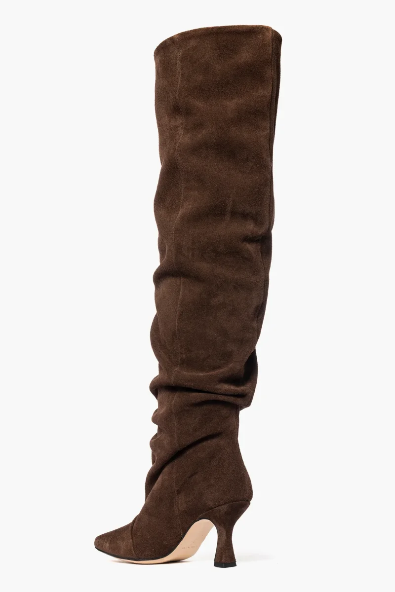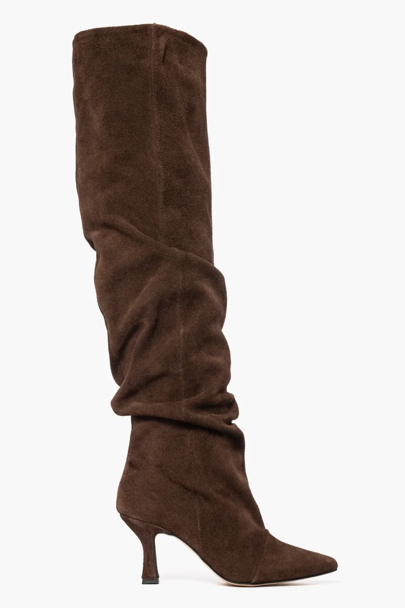 Stivale sopra al ginocchio in camoscio cioccolato, aggrappato davanti e su tutto il gambale, interni in similpelle, privo di cerniera, tacco rivestito, 8.5. Calzano regolari, punta leggermente stretta in avanti. Calzature artigianali, made in Italy.