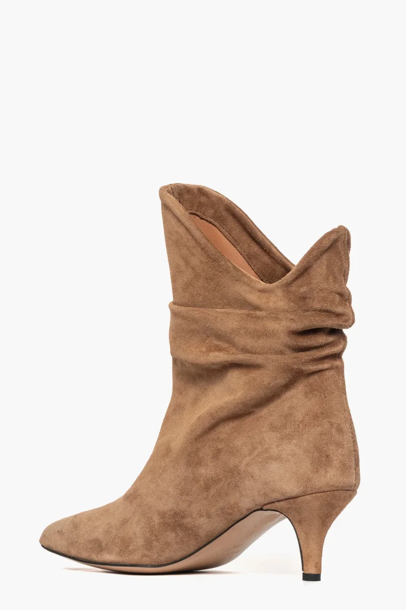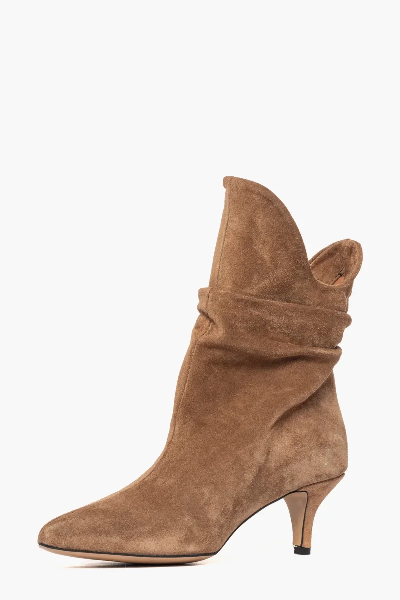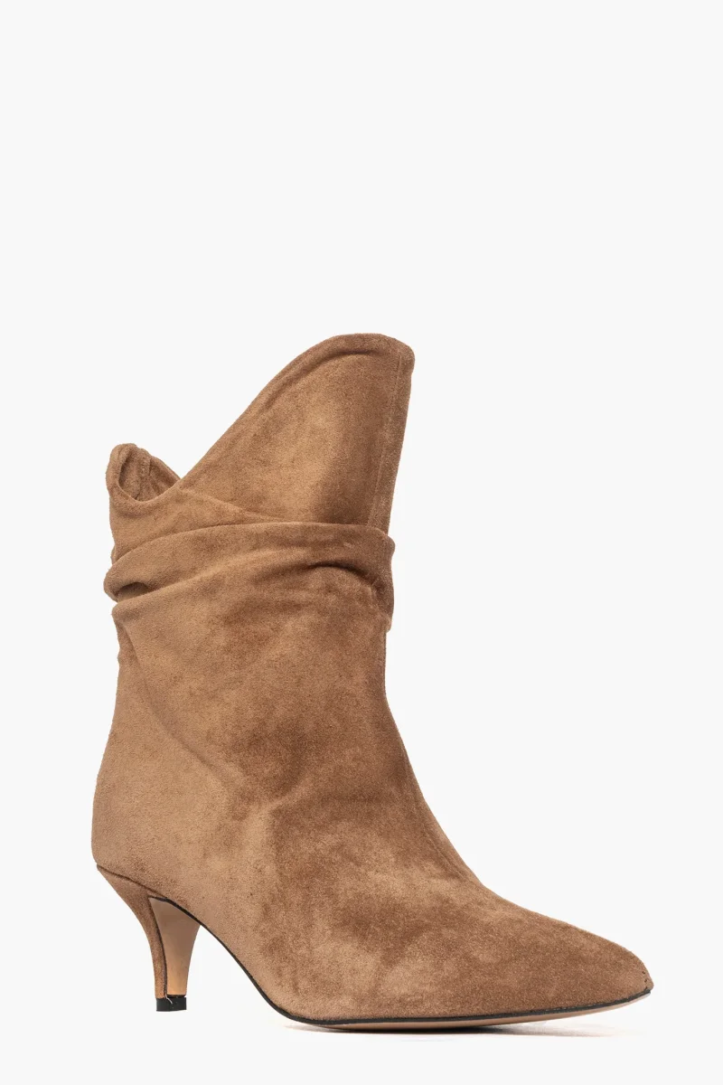 Stivaletti aggrappati alla caviglia in camoscio cuoio chiaro . Interni e sottopiede in similpelle. Tacco 6, rivestito. Calzano giusti, punta stretta. Calzature realizzate in modo artigianale, rigorosamente Made in Italy.
