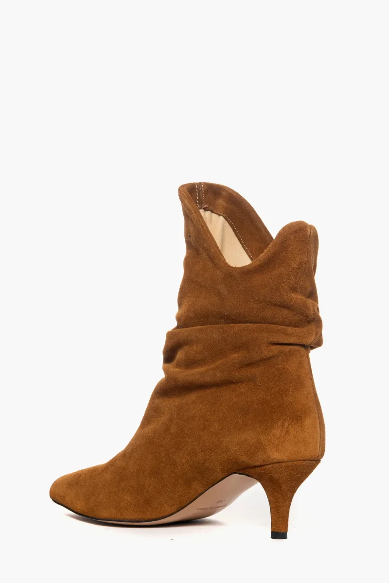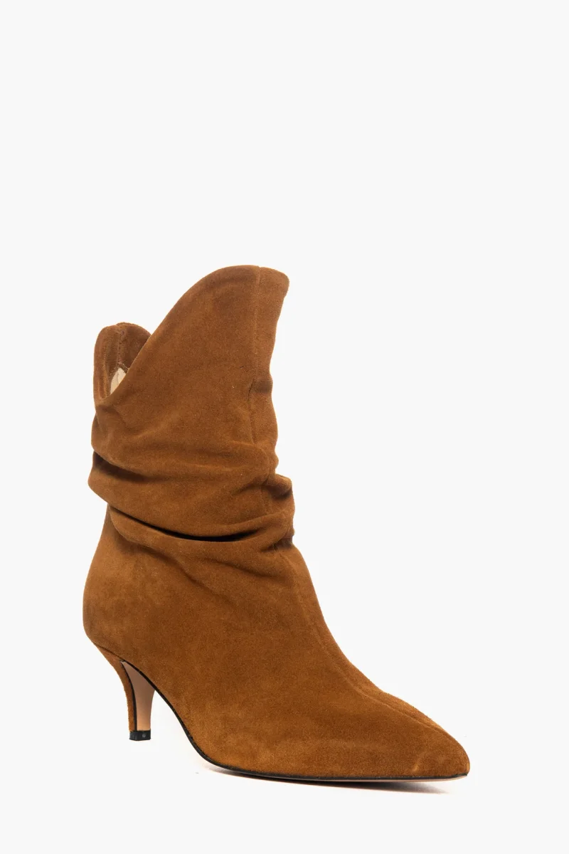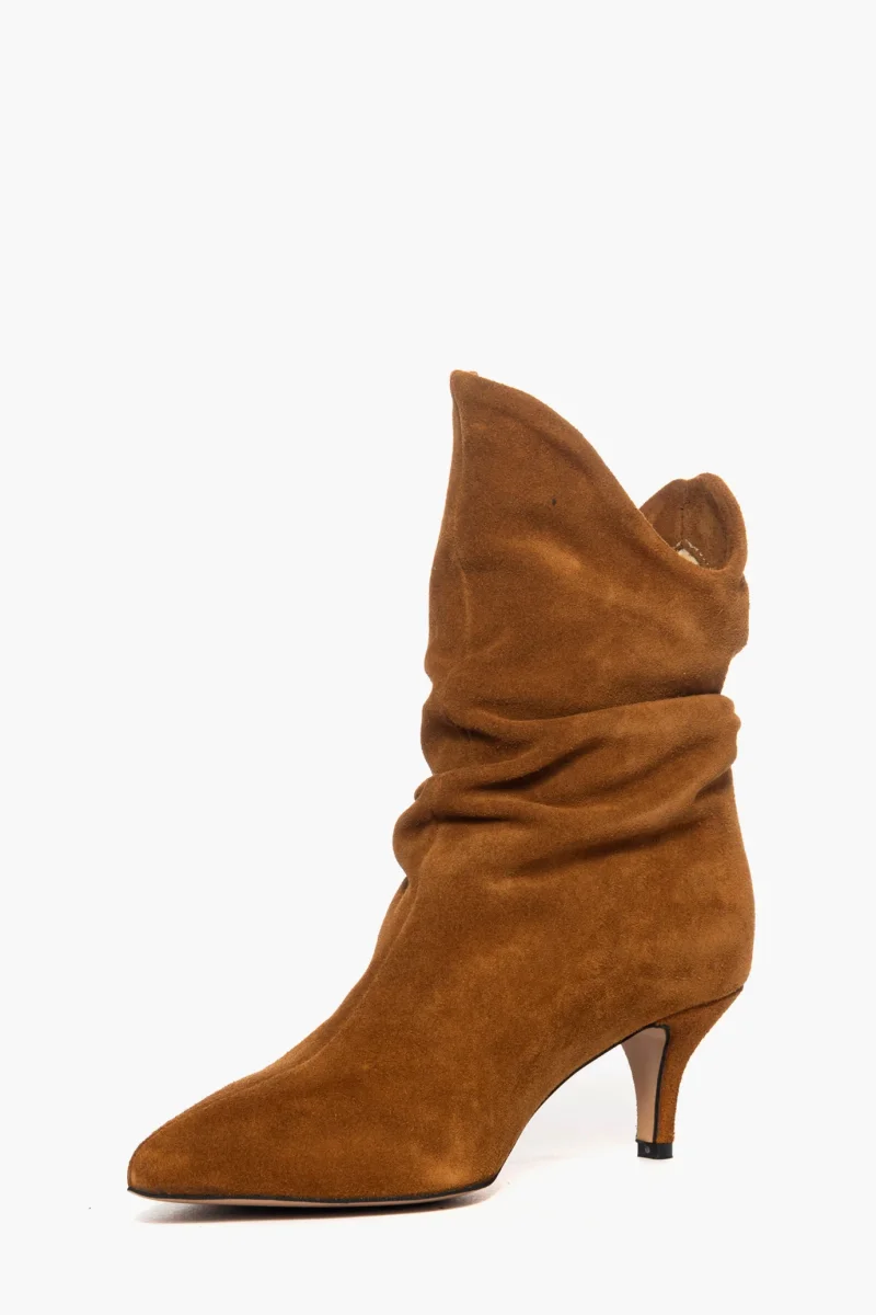 Stivaletti aggrappati alla caviglia in camoscio cuoio. Interni e sottopiede in similpelle. Tacco 6, rivestito in camoscio cuoio. Calzano giusti, punta stretta. Calzature realizzate in modo artigianale, rigorosamente Made in Italy.