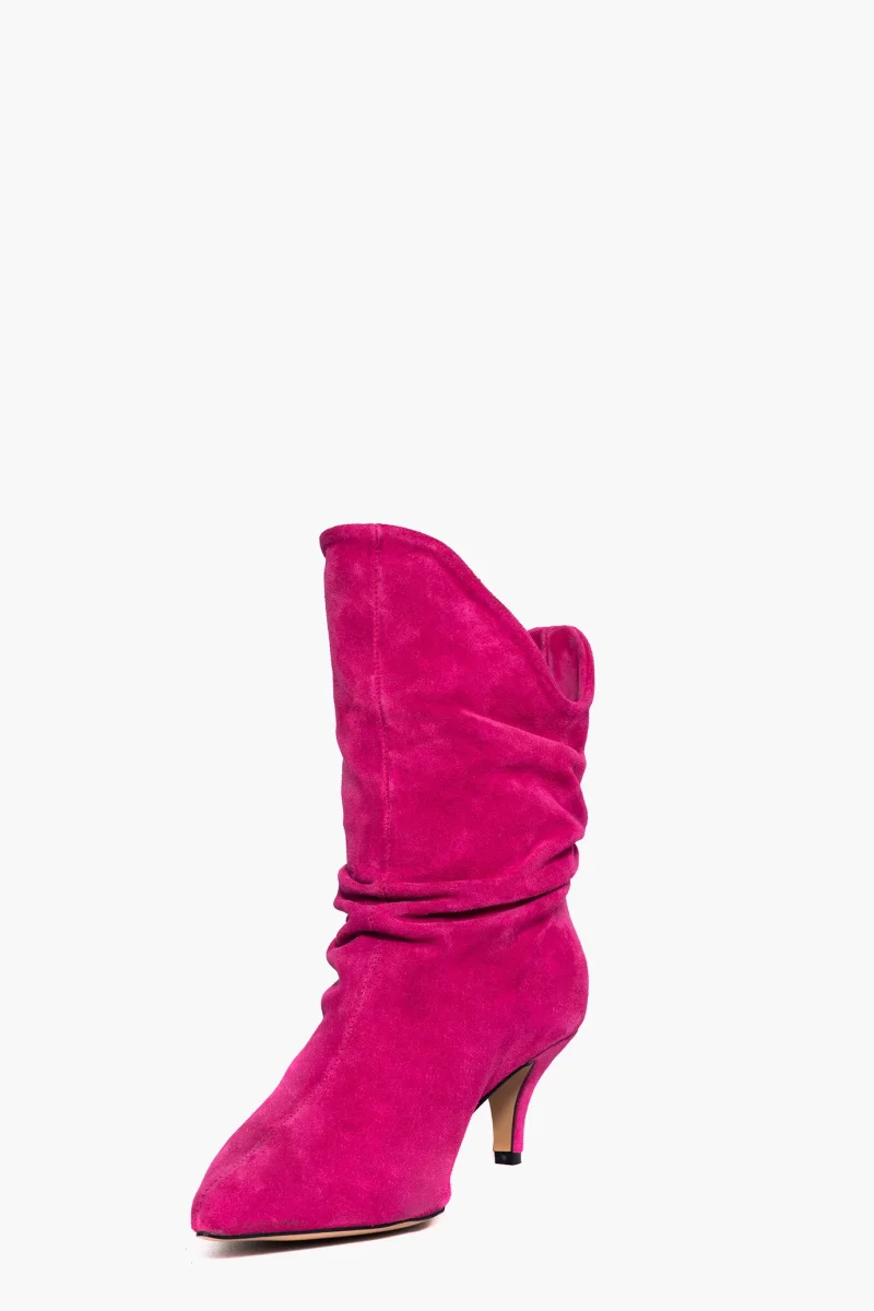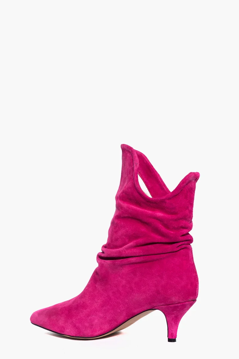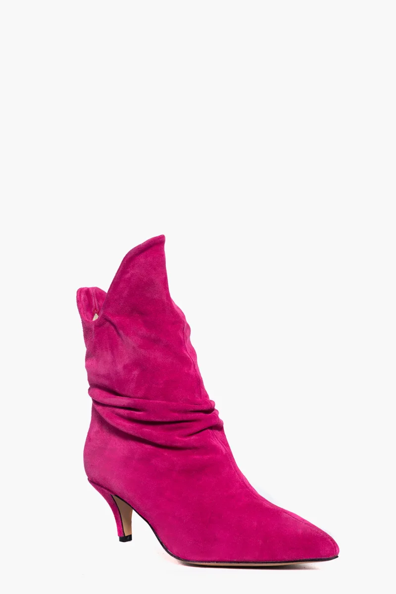 Stivaletti aggrappati alla caviglia in camoscio fucsia. Interni e sottopiede in similpelle. Tacco 6, rivestito in camoscio fucsia. Calzano giusti, punta stretta. Calzature realizzate in modo artigianale, rigorosamente Made in Italy.