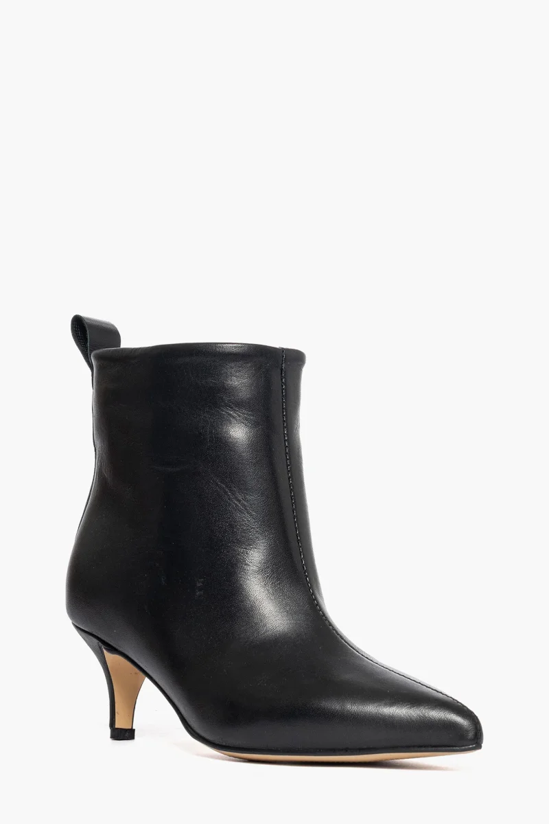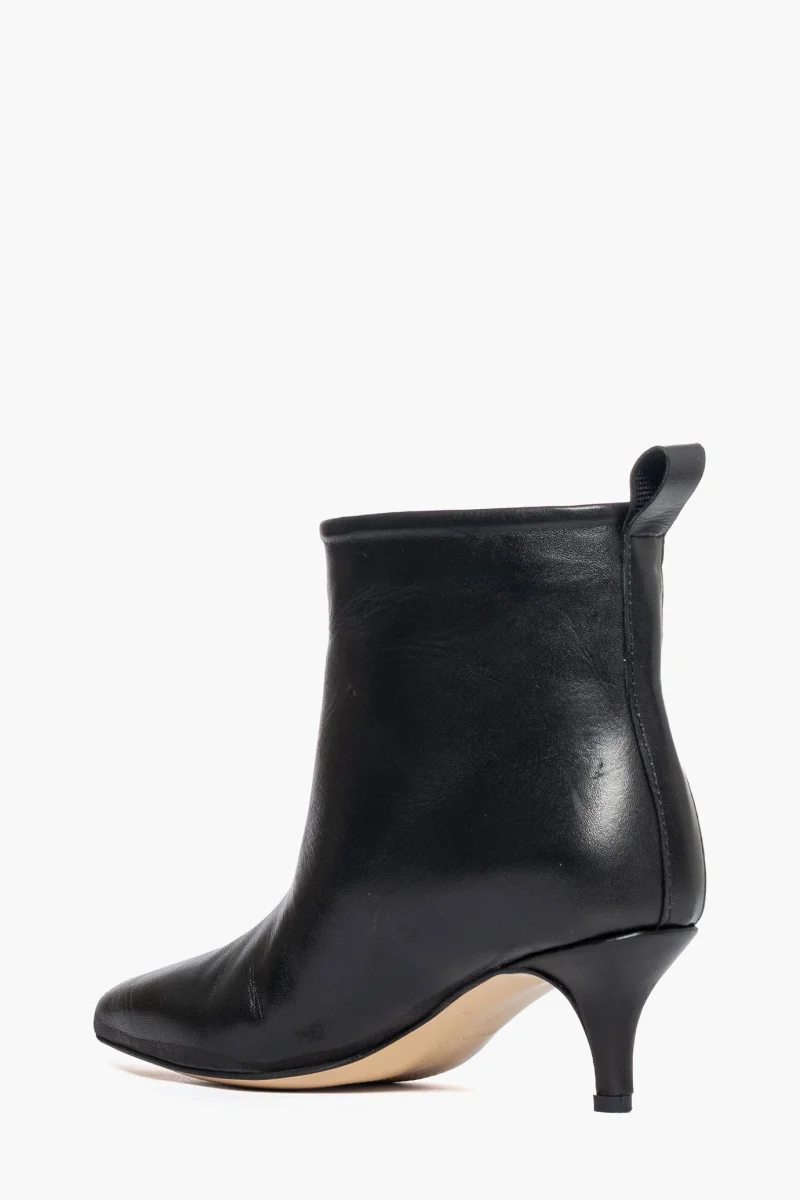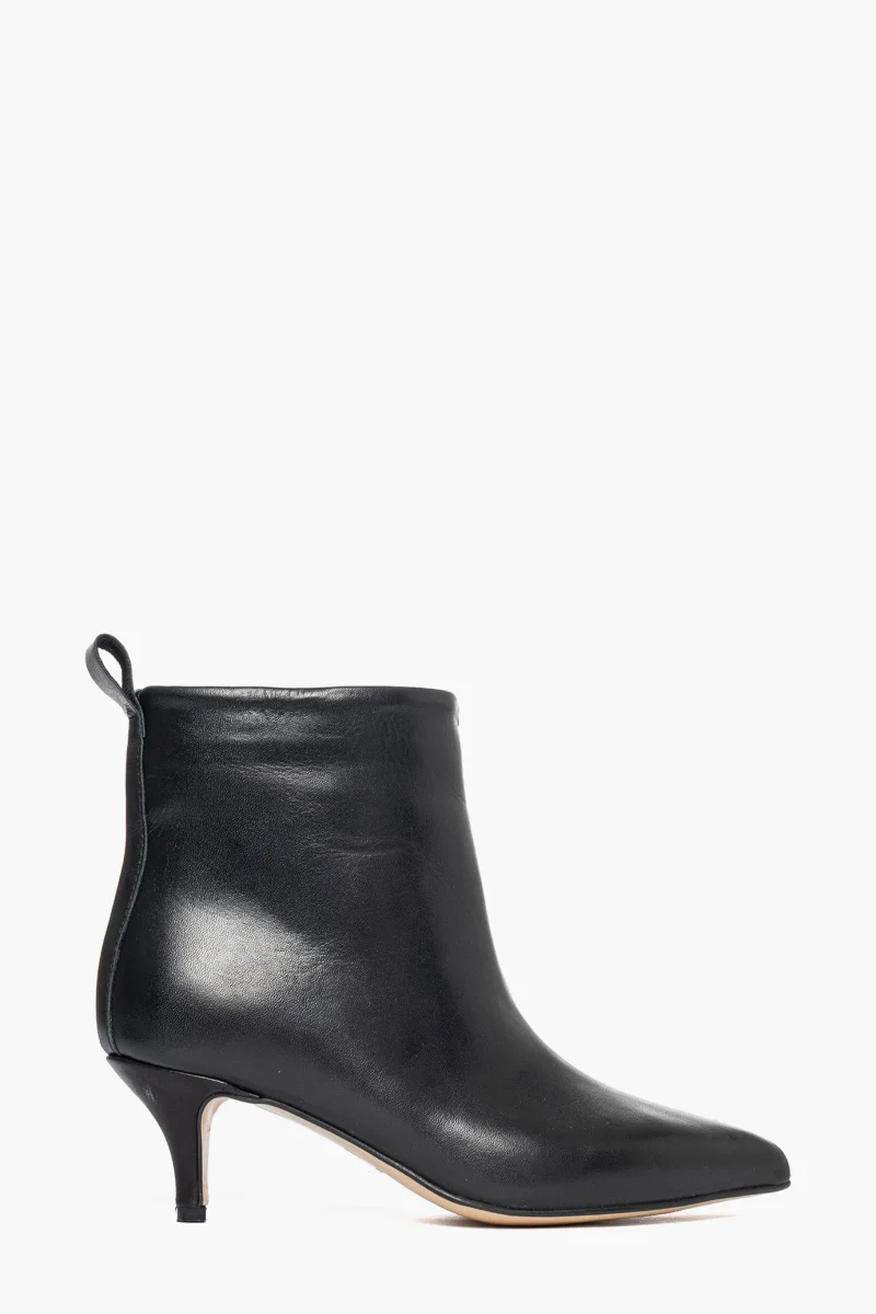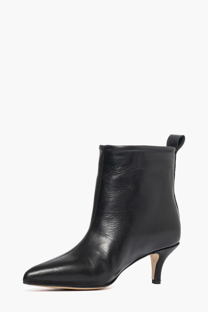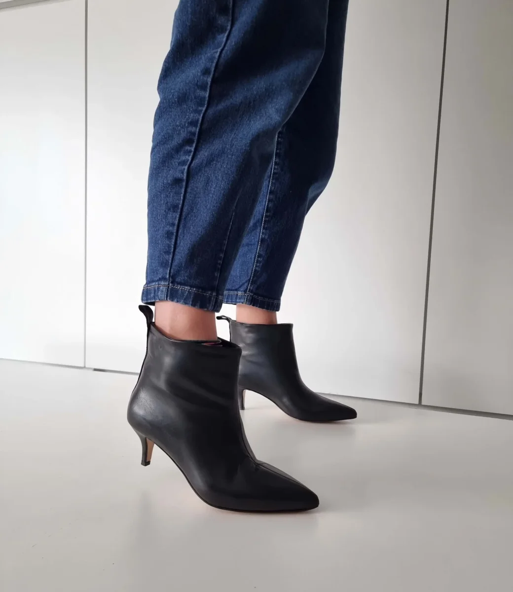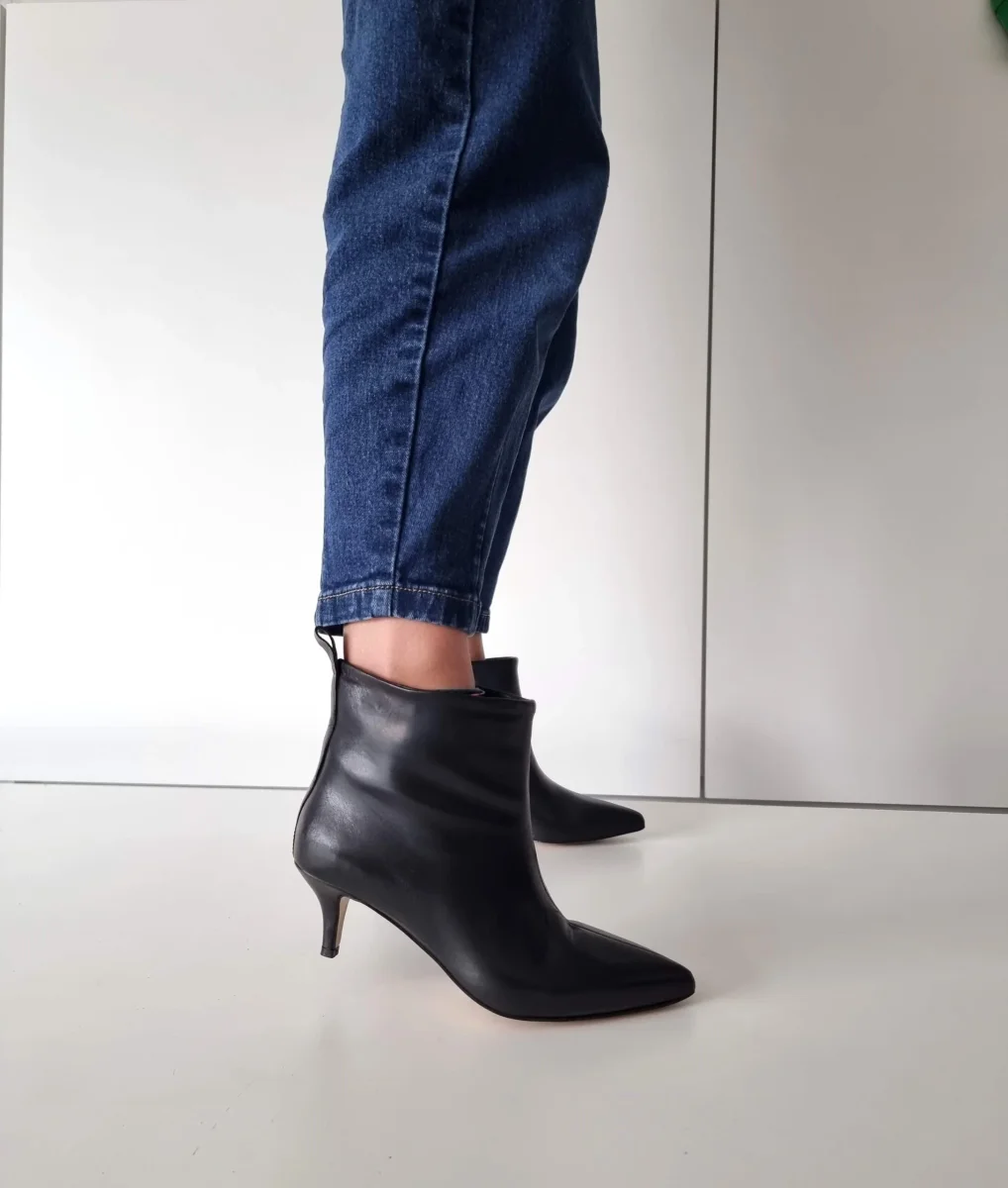 Stivaletti sopra alla caviglia in pelle nero, interni e sottopiede in similpelle. Tacco 6 cm, rivestito in pelle nero. Calzata regolare, punta stretta. Calzature realizzate in modo artigianale, rigorosamente Made in Italy.