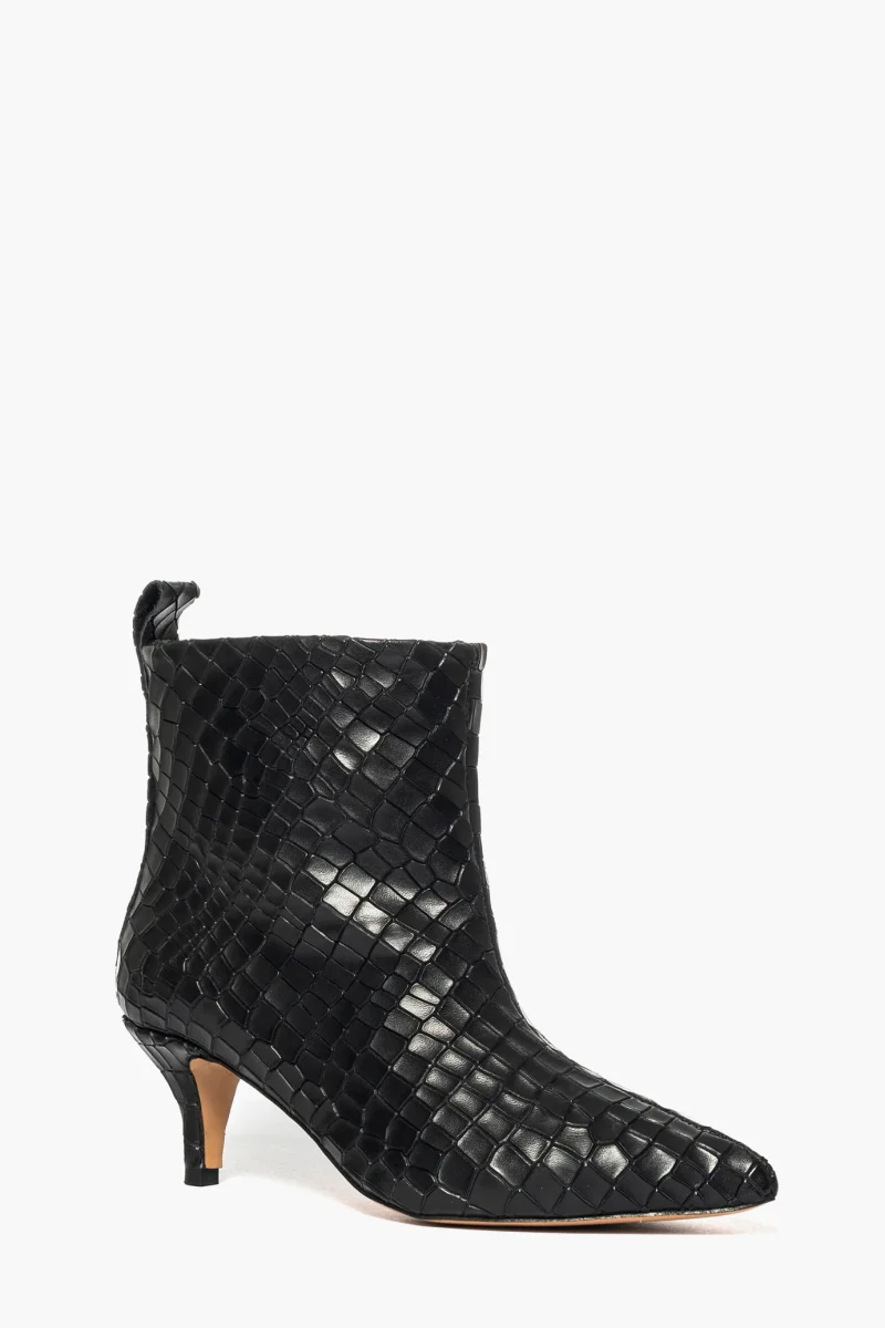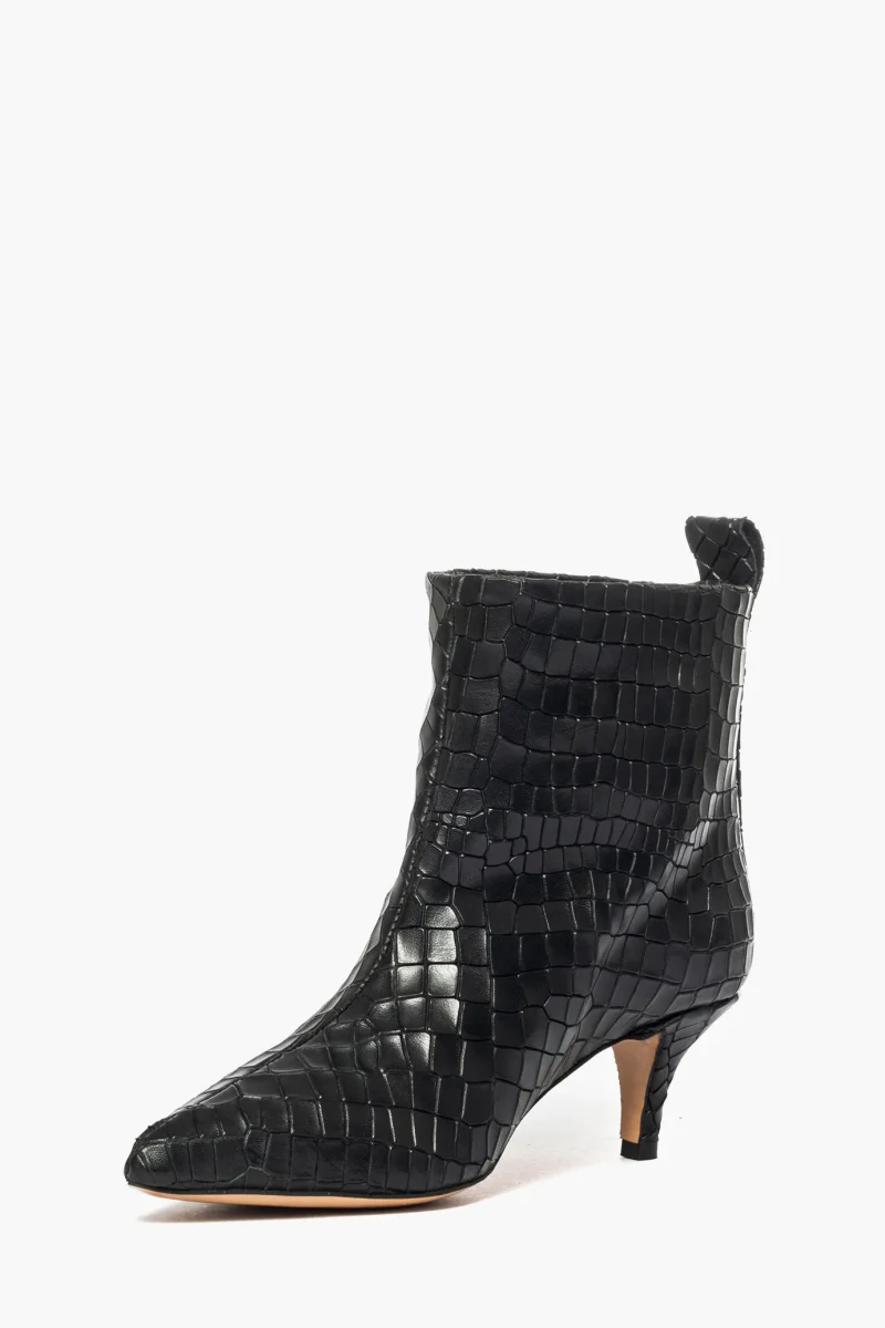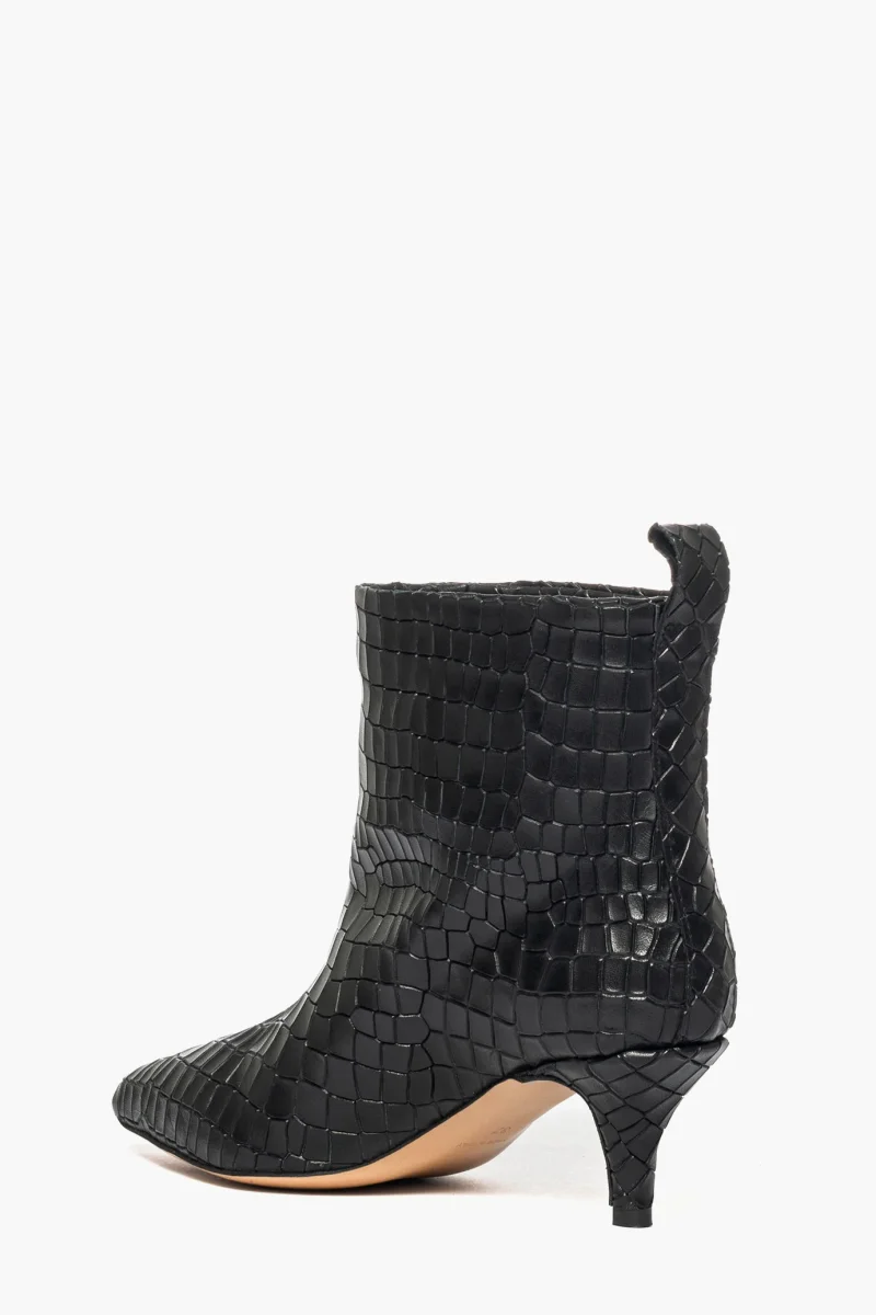 Stivaletti sopra alla caviglia in pitonato pelle nero con interni e sottopiede in similpelle. Tacco 6, rivestito in pelle nera. Calzano giusti, punta stretta. Calzature realizzate in modo artigianale, rigorosamente Made in Italy.