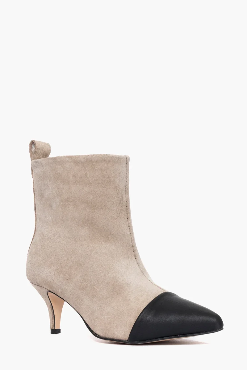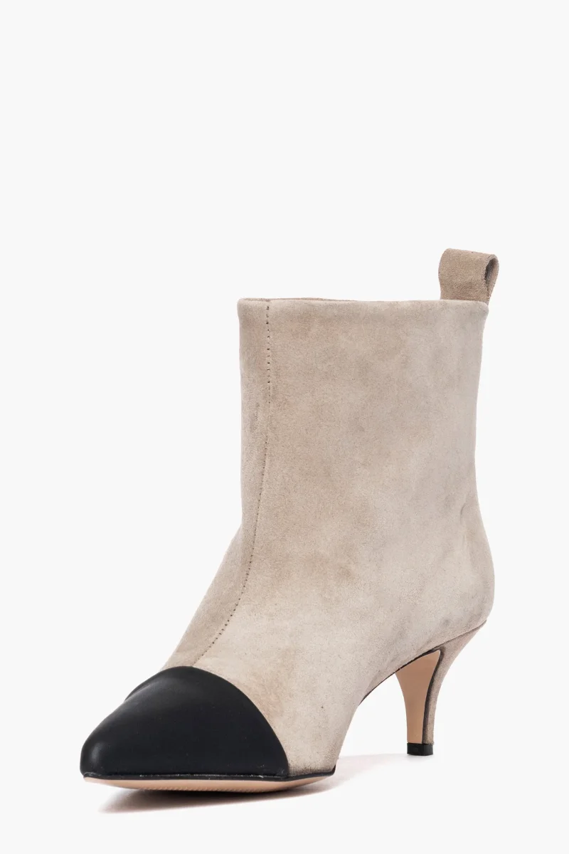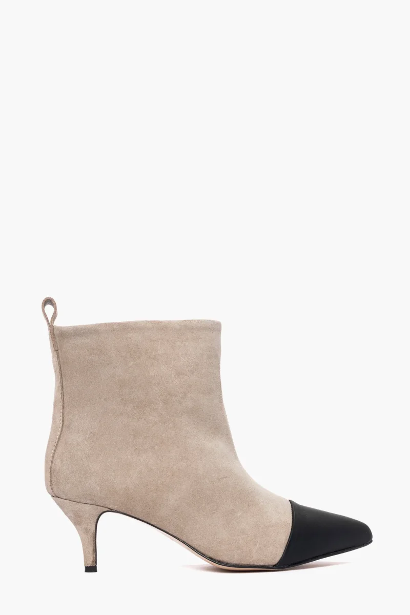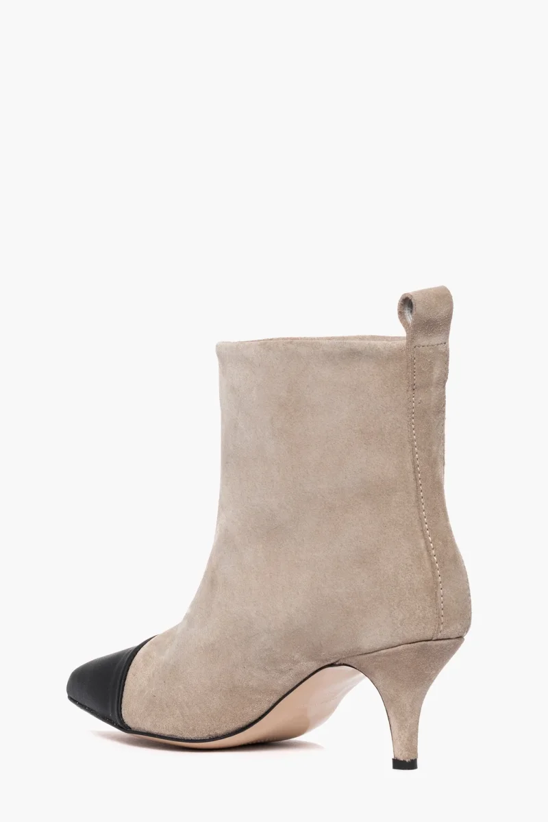Stivaletti sopra alla caviglia in camoscio taupè punta in avanti riporto in pelle nero, interni e sottopiede in similpelle. Tacco 6 cm, rivestito in camoscio taupè. Calzata regolare, punta stretta. Calzature realizzate in modo artigianale, rigorosamente Made in Italy.