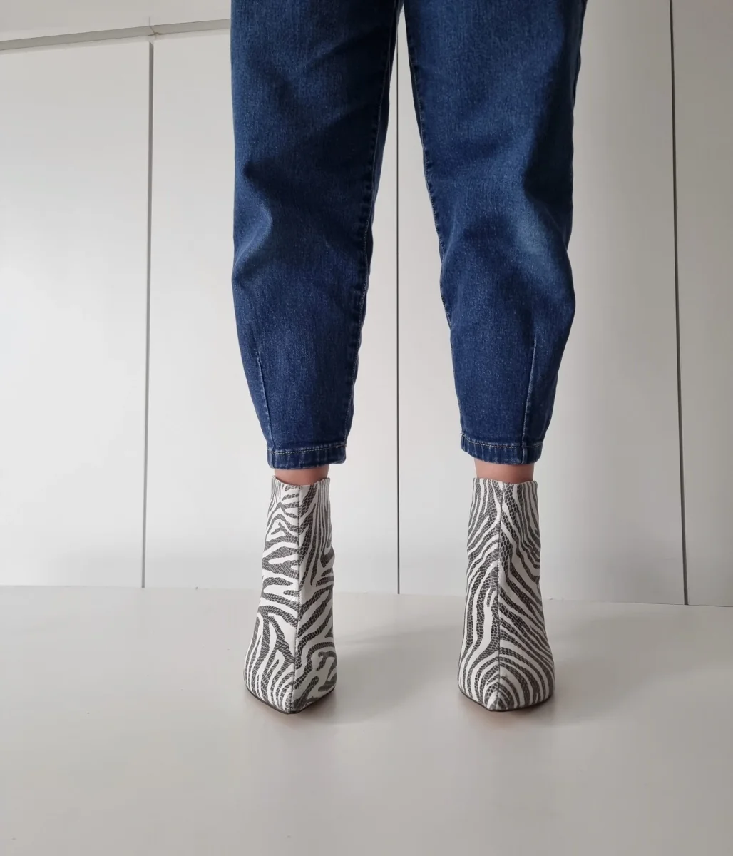 Stivaletti sopra alla caviglia in similpelle semilucida stampa zebrata bianco nero, interni e sottopiede in similpelle. Tacco 6 cm, rivestito. Calzata regolare, punta stretta. Calzature realizzate in modo artigianale, rigorosamente Made in Italy.