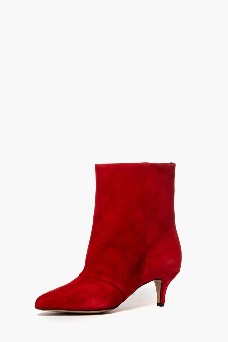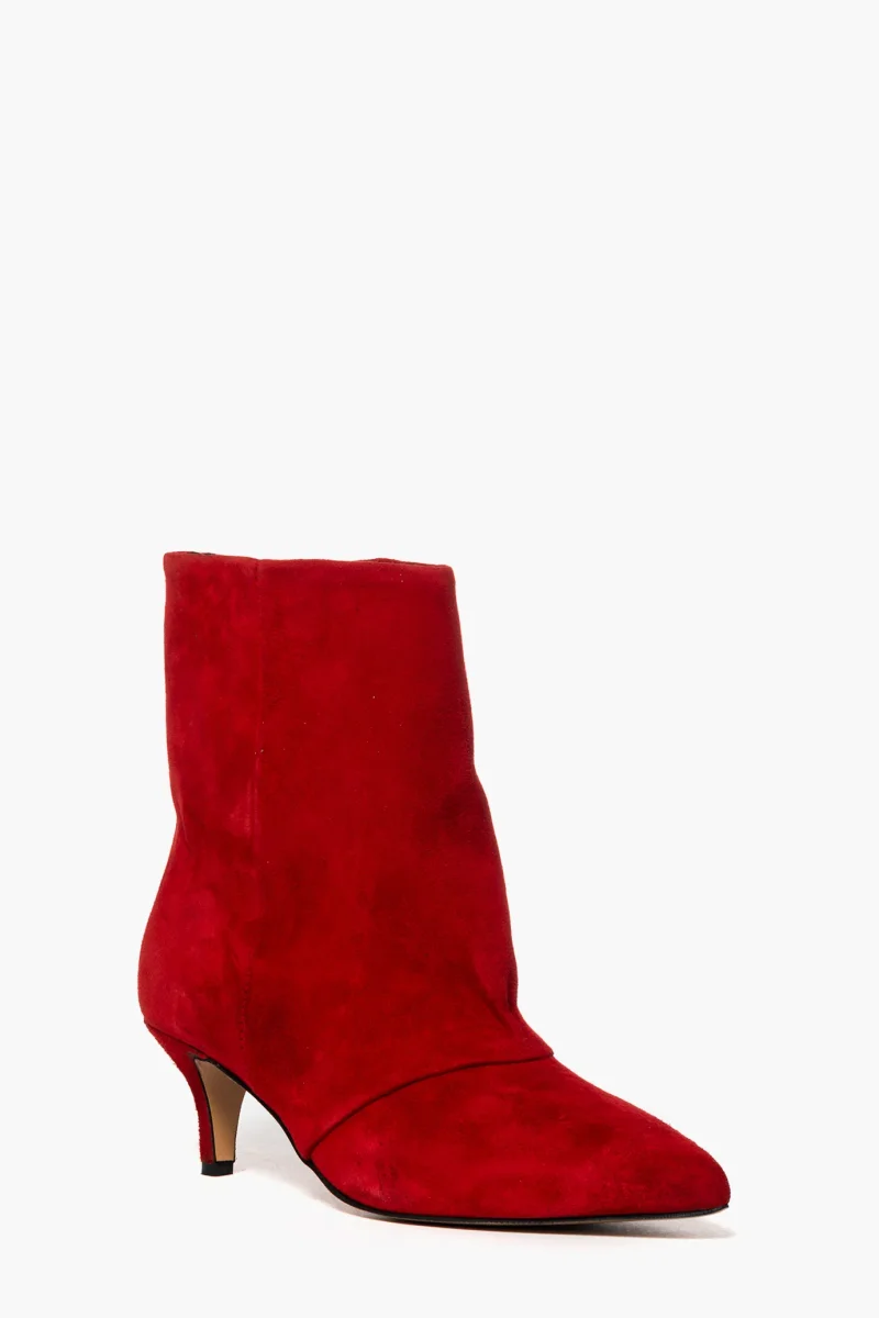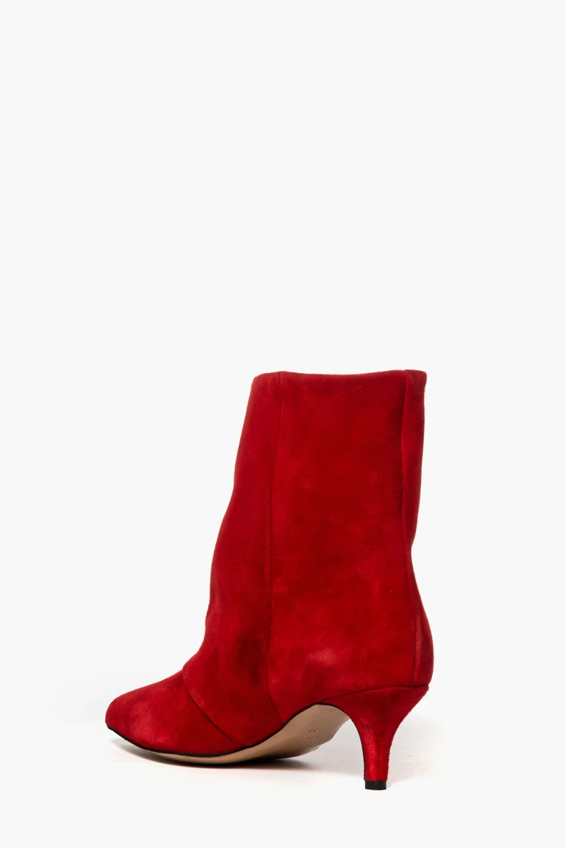 Stivaletti in camoscio rosso alti alla caviglia, aggrappato in avanti. Tacco rivestito altezza 6 cm, punta stretta, interni e sottopiede in similpelle. Calzata regolare, privo di cerniera. Calzature realizzate artigianalmente, rigorosamente Made in Italy.