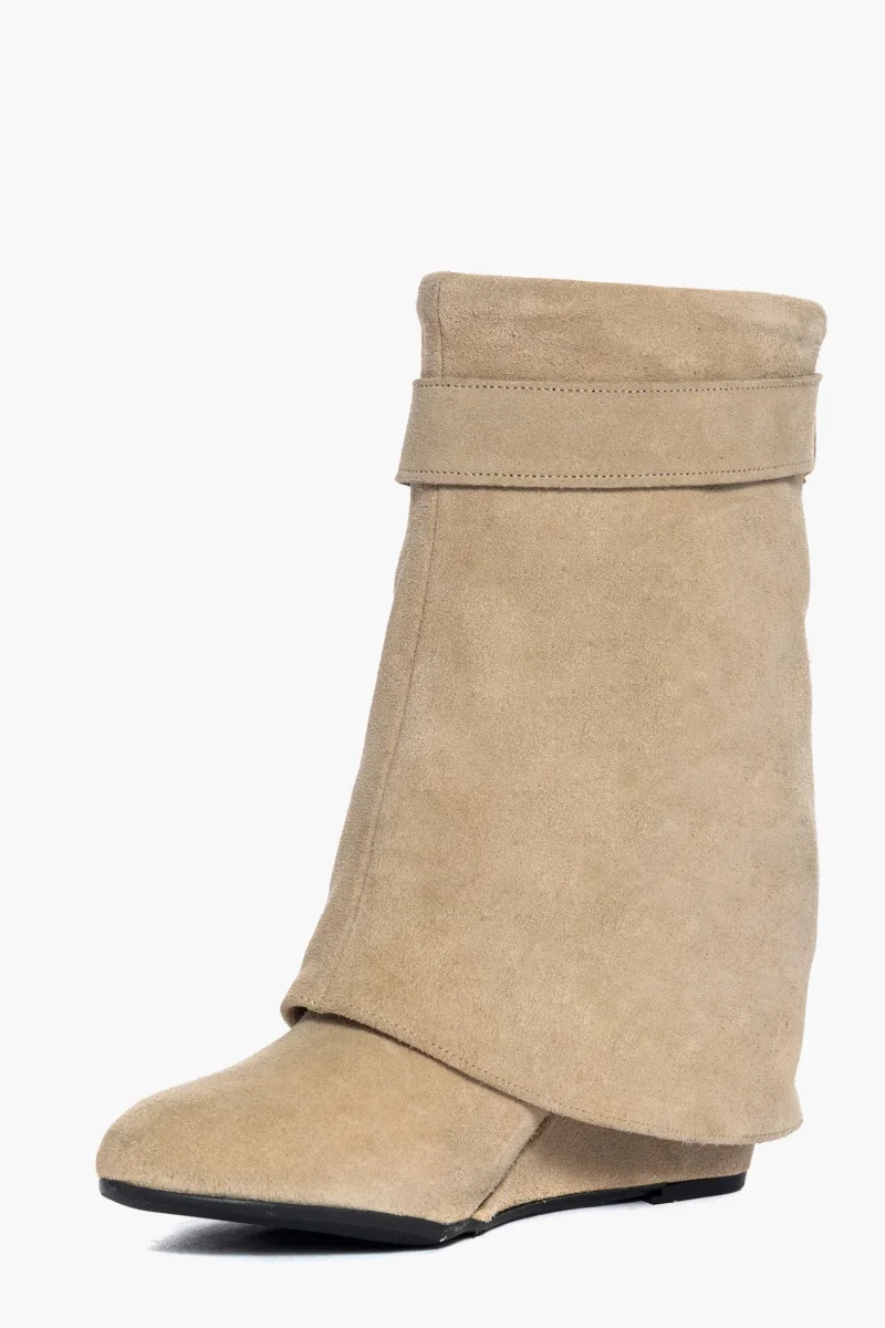Stivaletti in camoscio beige, con risvolto e zeppa rivestita in camoscio beige, altezza 7/8 cm. Interni e sottopiede in similpelle, cintura con accessori in colore argento. Stivaletti a metà polpaccio. Calzata regolare. Calzature realizzate artigianalmente, rigorosamente made in Italy.