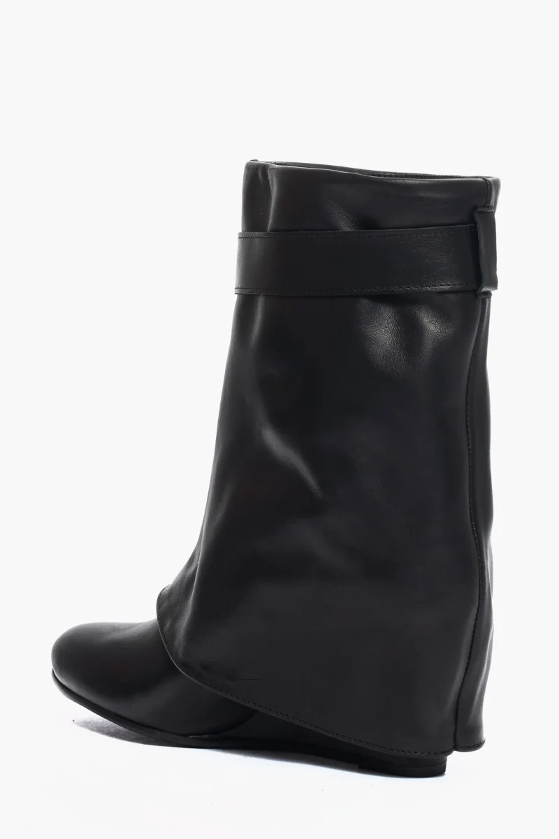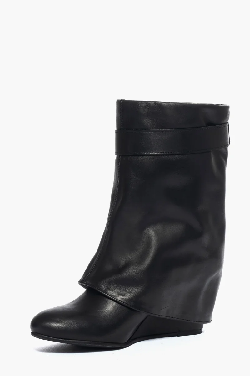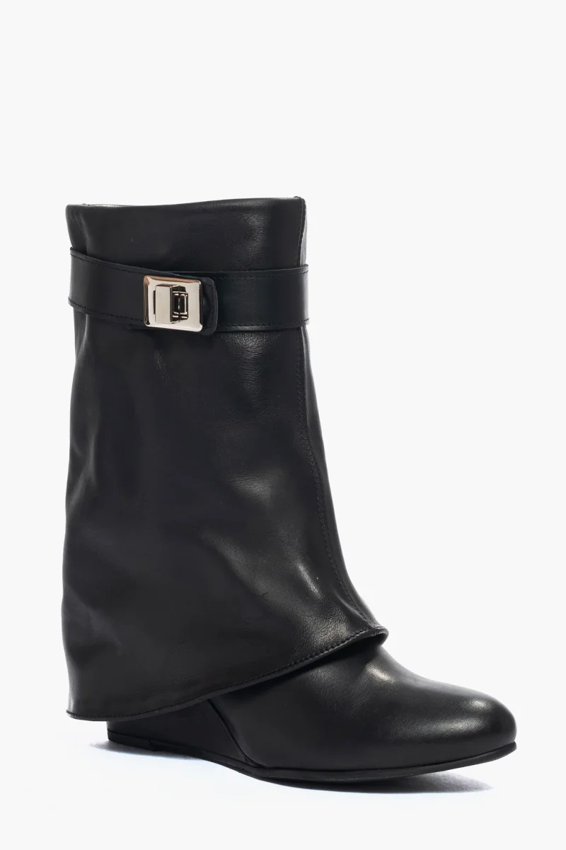 Stivaletti in pelle nero, con risvolto e zeppa rivestita in pelle nero, altezza 7/8 cm, interni e sottopiede in similpelle, cintura con accessori in colore argento, stivaletti a metà polpaccio, privo di cerniera, calzano regolari. Calzature realizzate in modo artigianale, rigorosamente made in Italy.