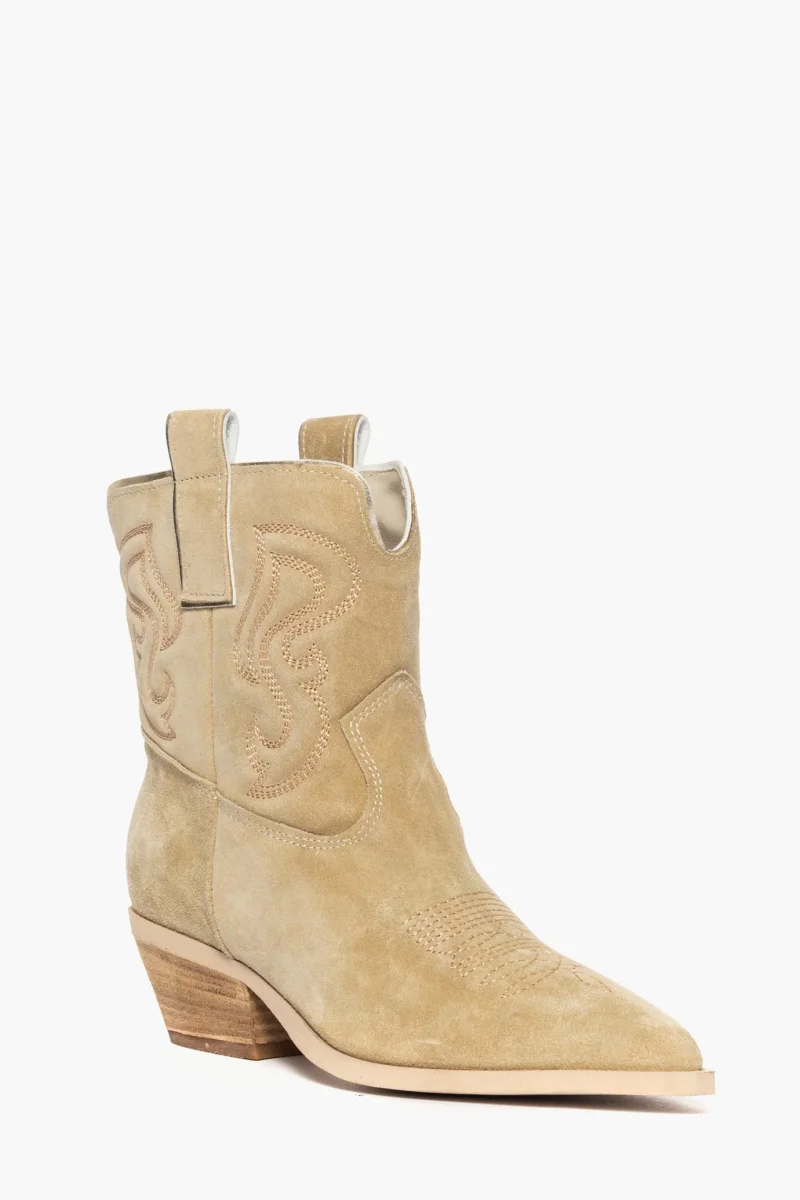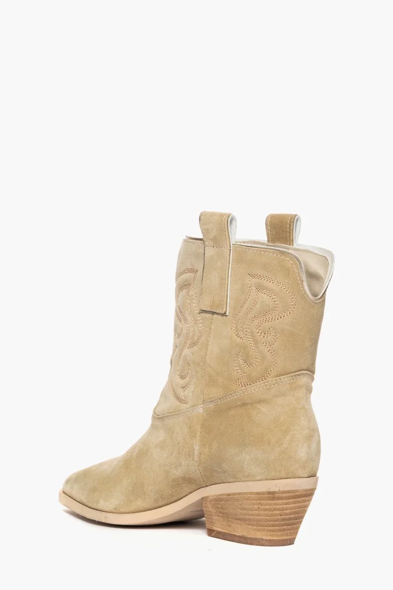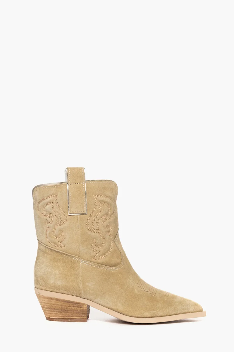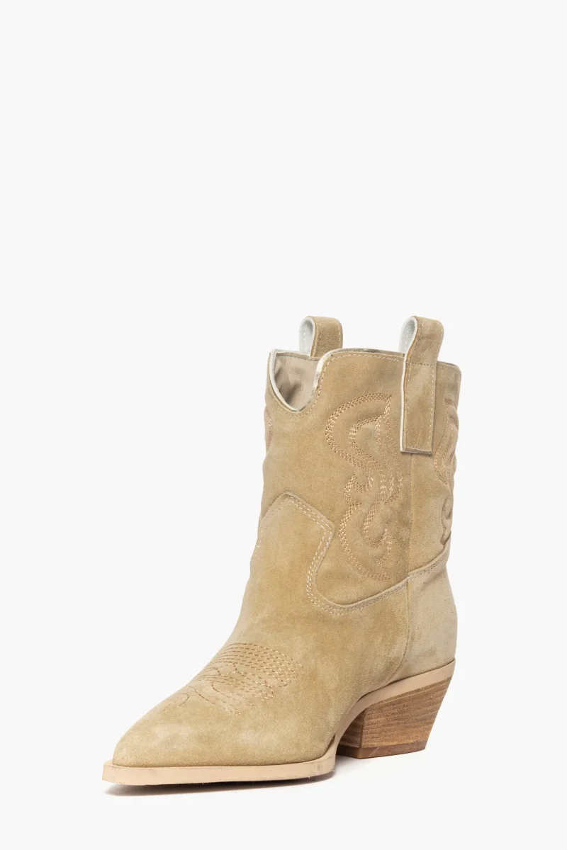 Stivaletti, camoscio beige chiaro, riporto in oro, ricamo in tinta, interni in similpelle, suola in colore neutro, spazzolato, privo di cerniera, forma texana, altezza 5, Calzano giusti, punta stretta.