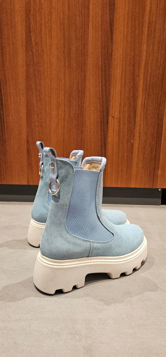 Stivaletti in camoscio celeste, con elastici ai lati in tinta, accessorio nel colore argento sul retro, interni in similpelle, suola in gomma leggera, altezza 5, calzano regolari punta tonda. Calzature artigianali, made in Italy.