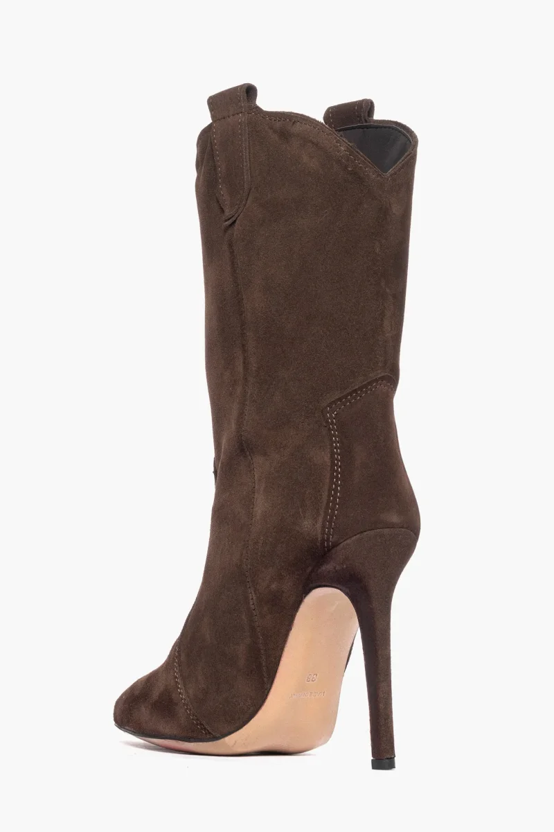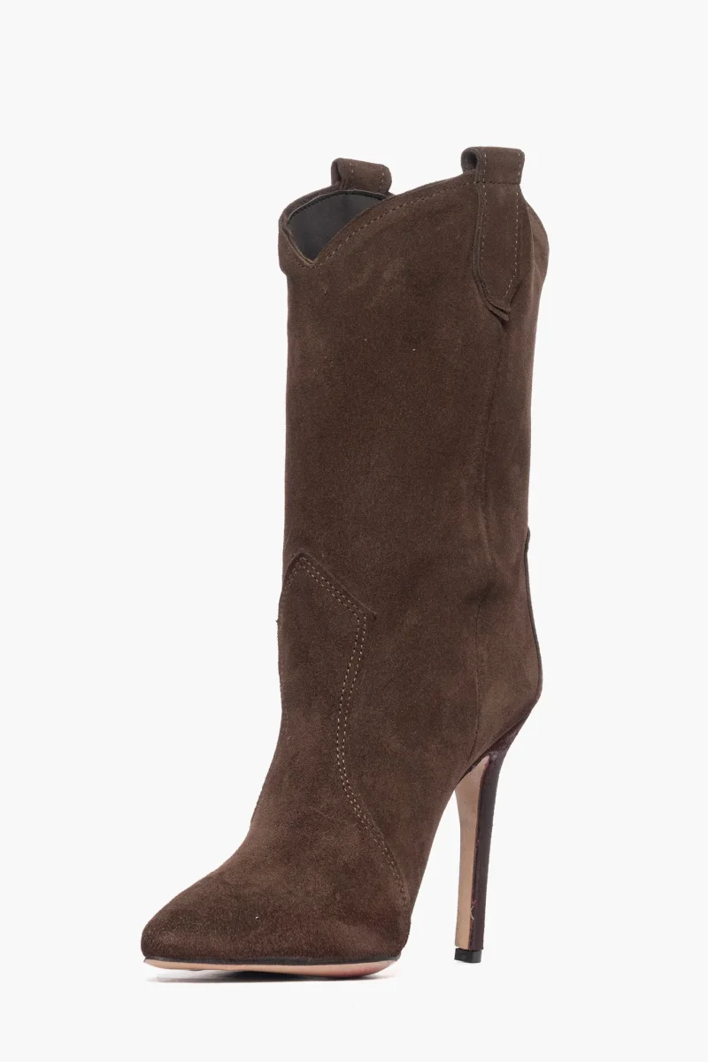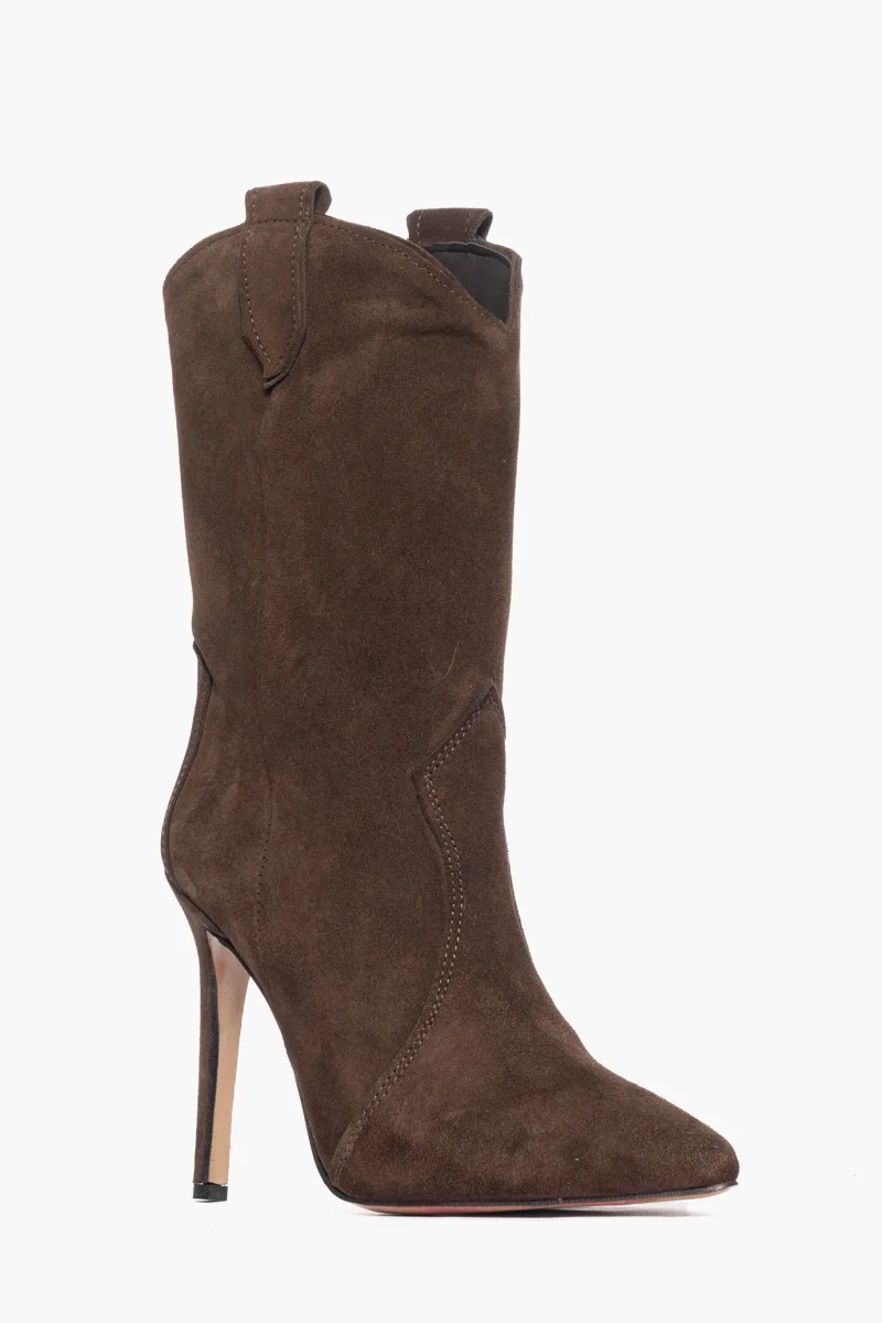 Stivaletti camoscio cioccolato sotto al polpaccio, tacco a spillo rivestito, altezza 11, interni in similpelle, punta stretta, calzano regolari. Calzature artigianali, made in Italy.