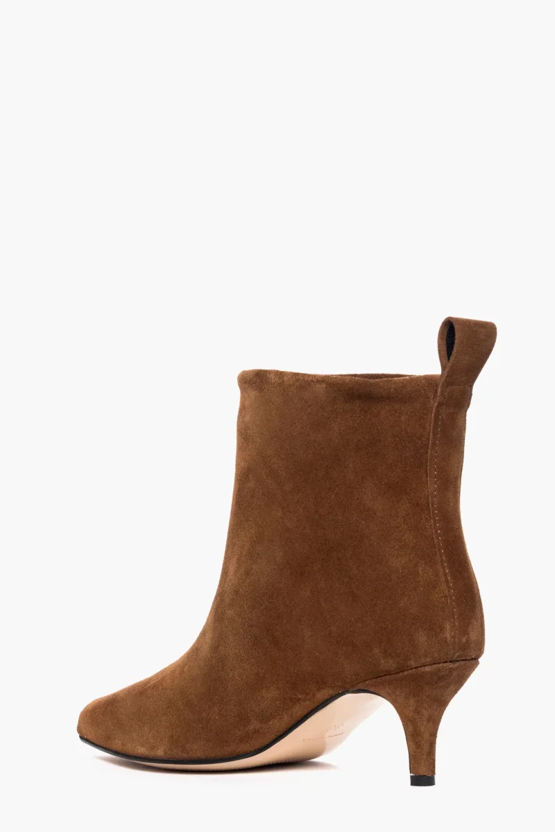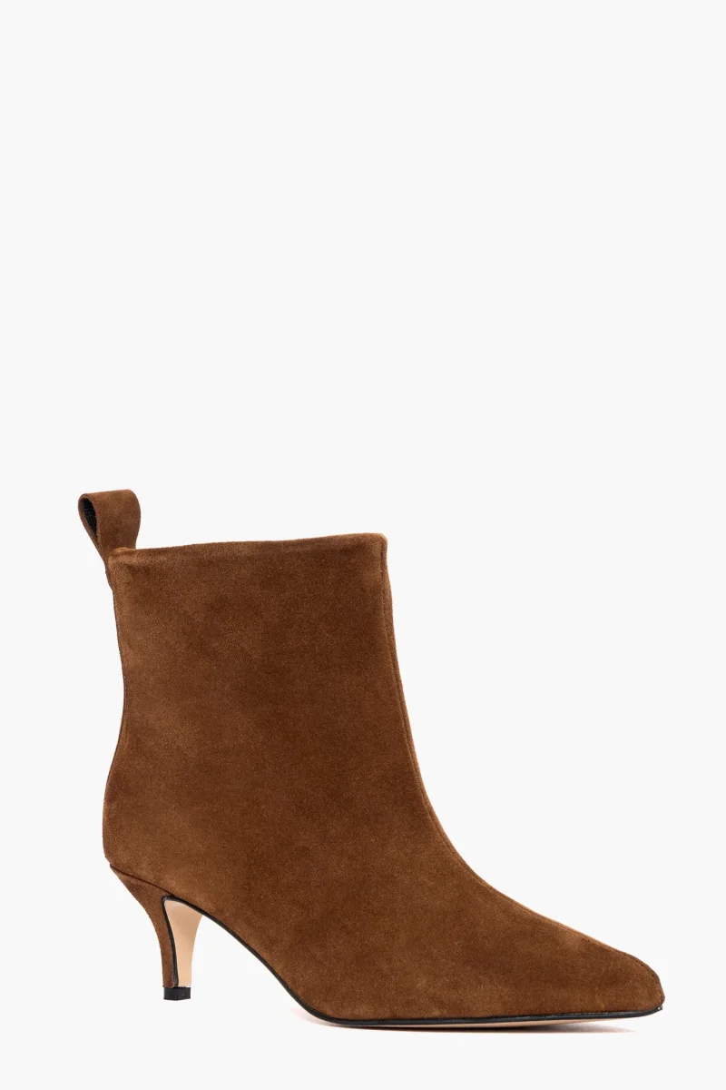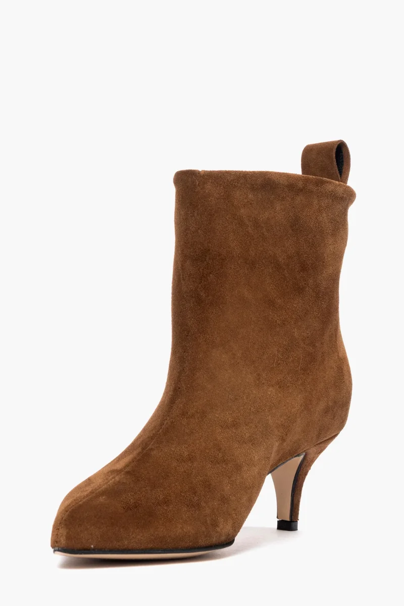 Stivaletti sopra alla caviglia in camoscio cuoio, interni e sottopiede in similpelle. Tacco 6 cm, rivestito. Calzata regolare, punta stretta. Calzature realizzate in modo artigianale, rigorosamente Made in Italy.