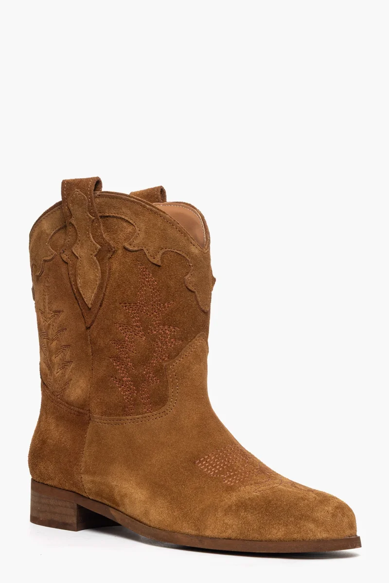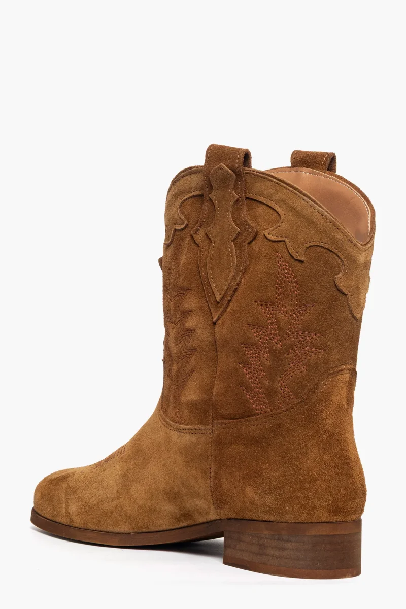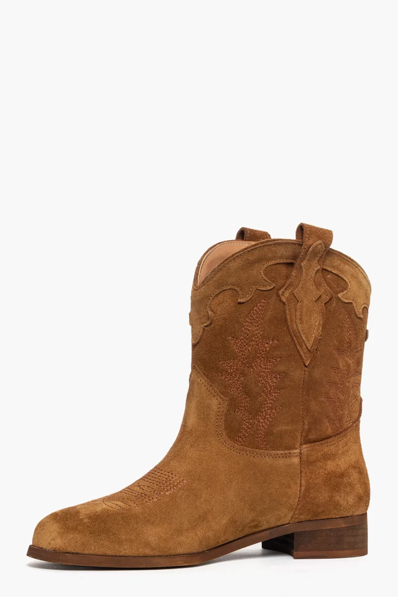 Stivaletti in camoscio cuoio, con ricami, interni in similpelle, privo di cerniera, suola spazzolata, 3. Calzano regolari, punta tonda. Calzature artigianali, made in Italy.