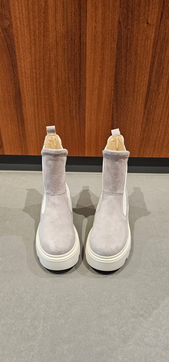 Stivaletti in camoscio ghiaccio, con elastici ai lati in tinta, accessorio nel colore argento sul retro, interni in similpelle, suola in gomma leggera in tinta, altezza 5, calzano regolari punta tonda. Calzature artigianali, made in Italy.