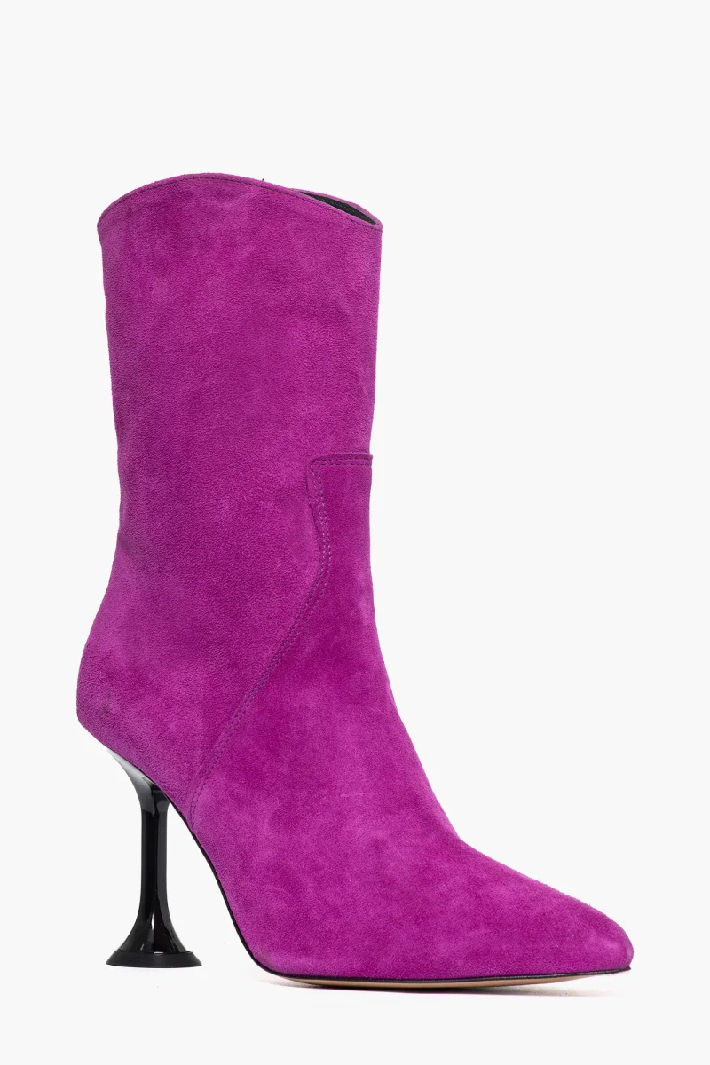 Stivaletti in camoscio magenta con cerniera, aderenti alla caviglia, tacco lucido laccato, altezza 9/10 , interni in similpelle, punta stretta, calzano regolari. Calzature artigianali, made in Italy.