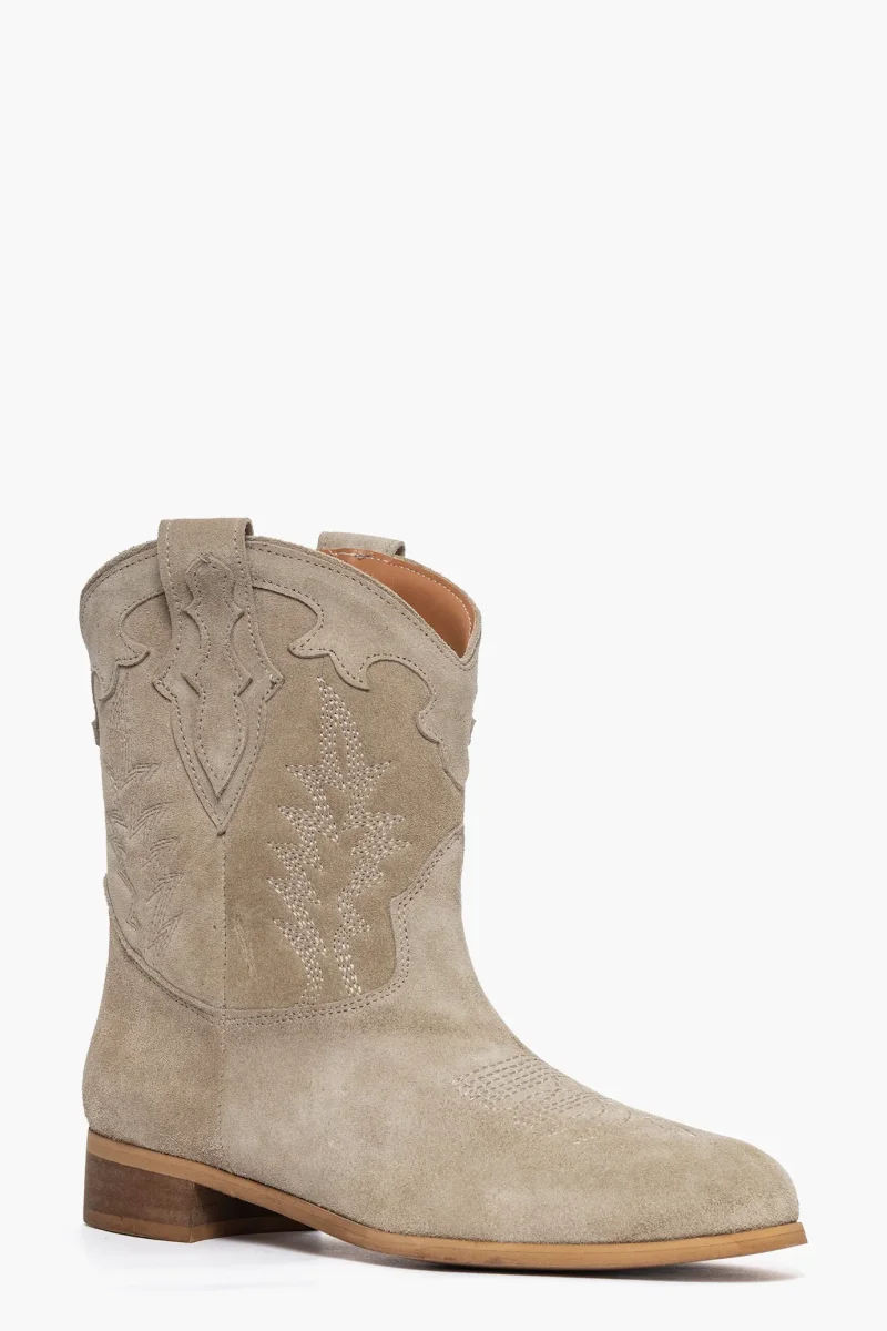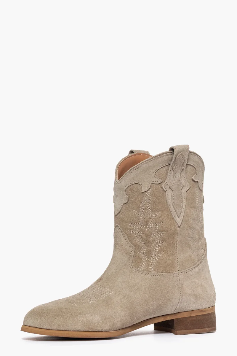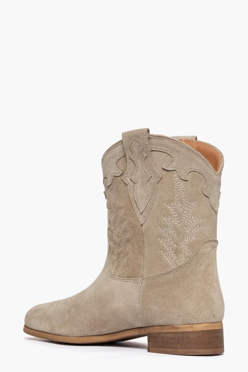 Stivaletti camoscio taupè con ricami, interni in similpelle, suola neutra spazzolata, 3. Calzano regolari, punta tonda. Calzature artigianali, made in Italy.