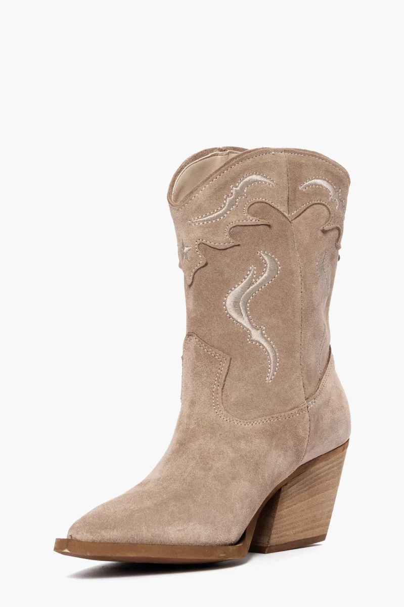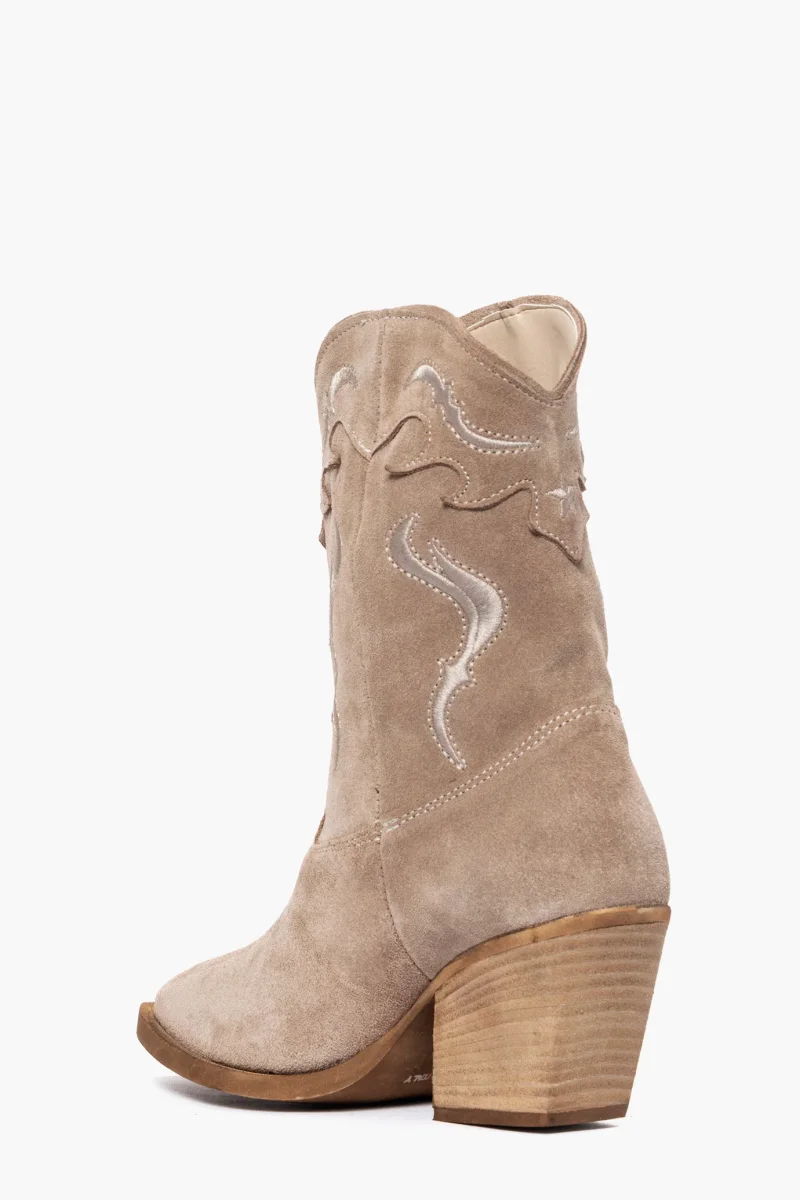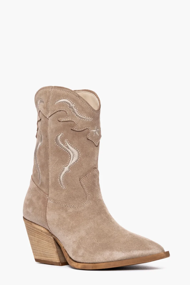Stivaletti sopra alla caviglia in camoscio taupè e ricami sul gambale nel colore in tinta, suola spazzolata, tacco altezza 7, interni in similpelle. Calzano giuste, punta stretta in avanti.