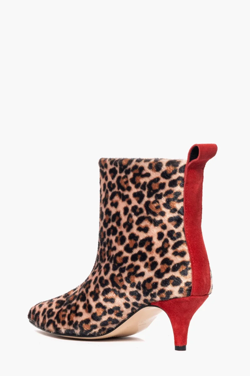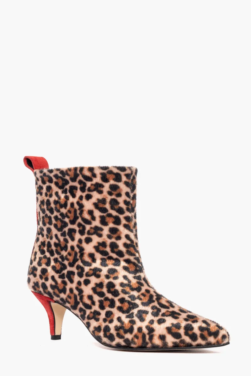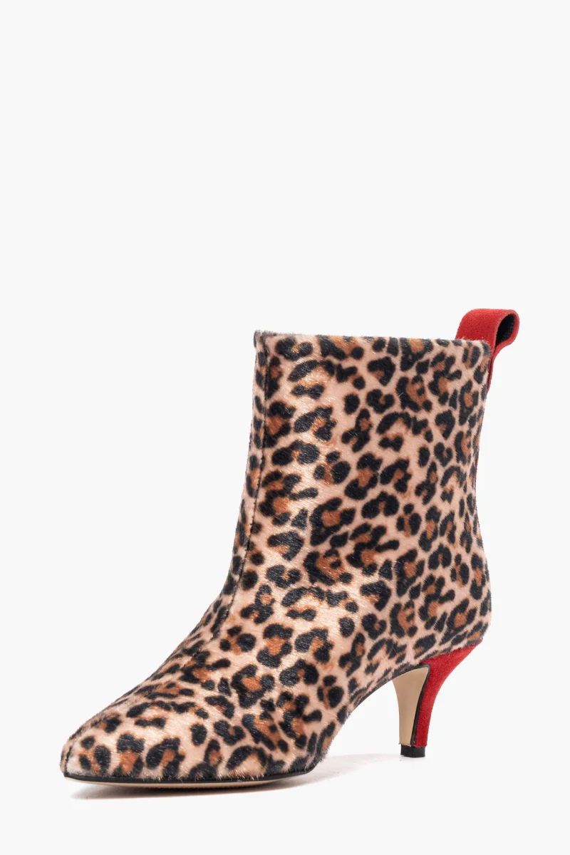 Stivaletti sopra alla caviglia in cavallino animalier sintetico riporto in camoscio rosso, interni e sottopiede in similpelle. Tacco 6 cm, rivestito. Calzata regolare, punta stretta. Calzature realizzate in modo artigianale, rigorosamente Made in Italy.