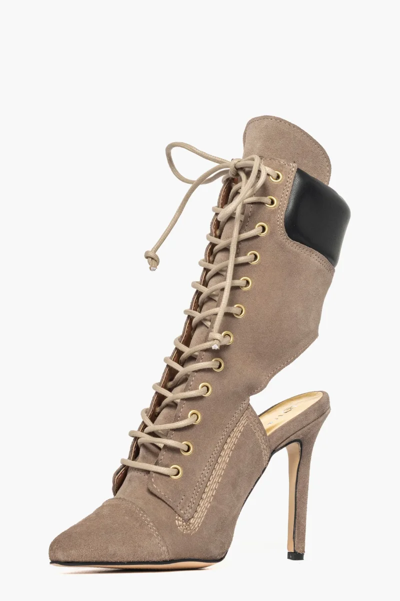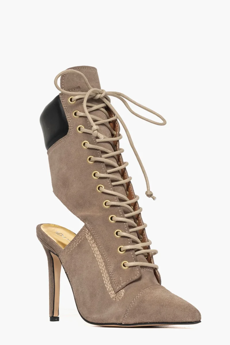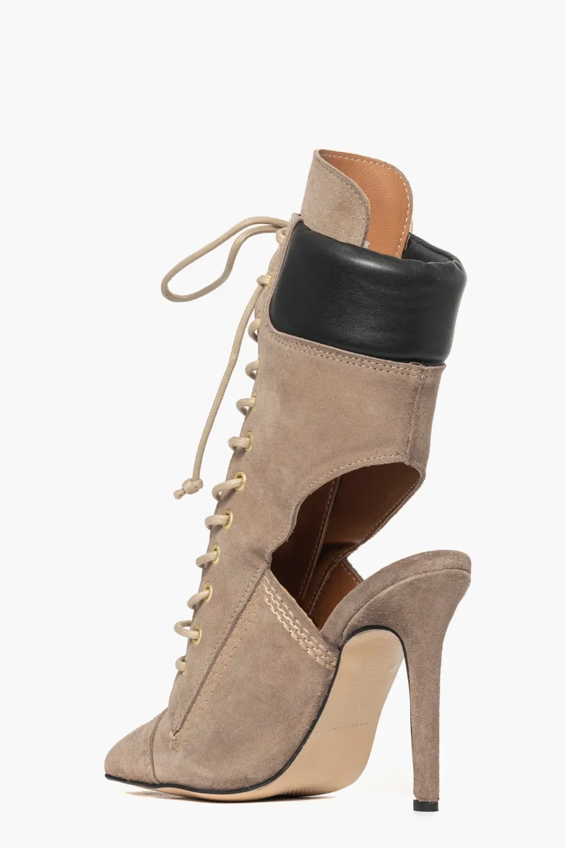 Stivaletti con lacci in camoscio taupè, con ricami, e riporto in pelle nero, occhielli nel colore oro, aperto al tallone, interni in similpelle. Calzano regolari, punta stretta. Calzature artigianali, made in Italy.