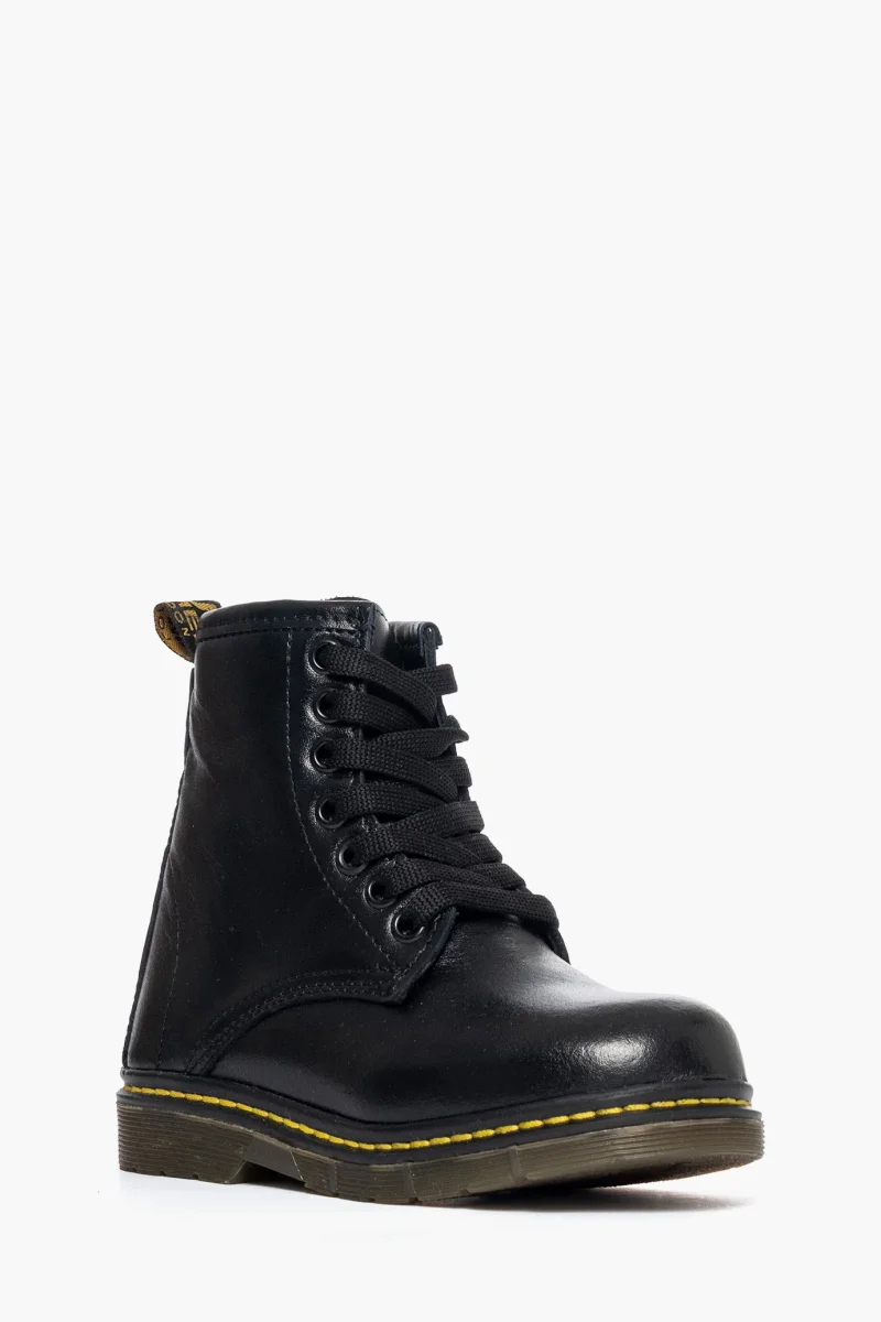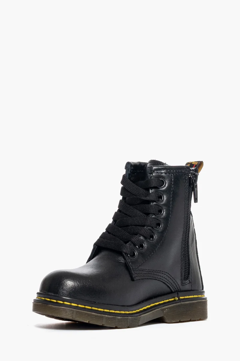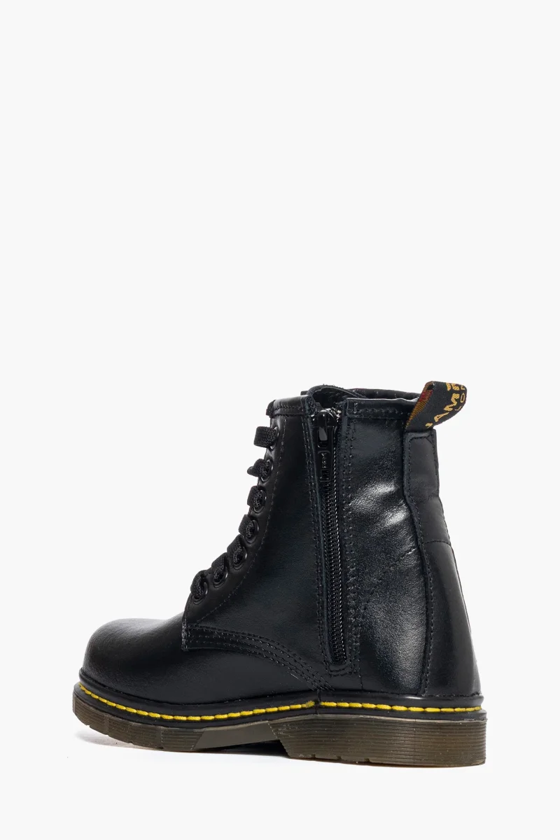 Stivaletti in pelle nero con lacci ed occhielli neri, interni in similpelle, suola in gomma colore petrolio, con cerniera interno piede. Calzature artigianali, made in Italy.