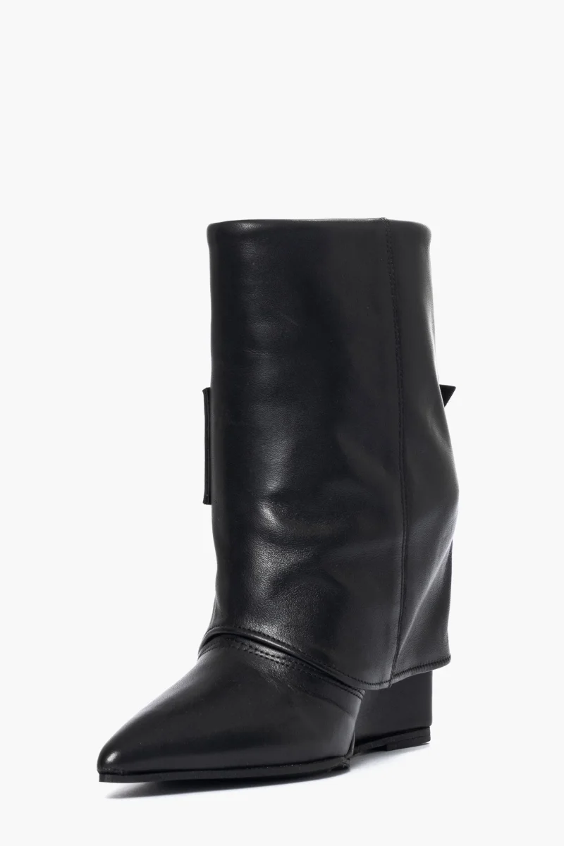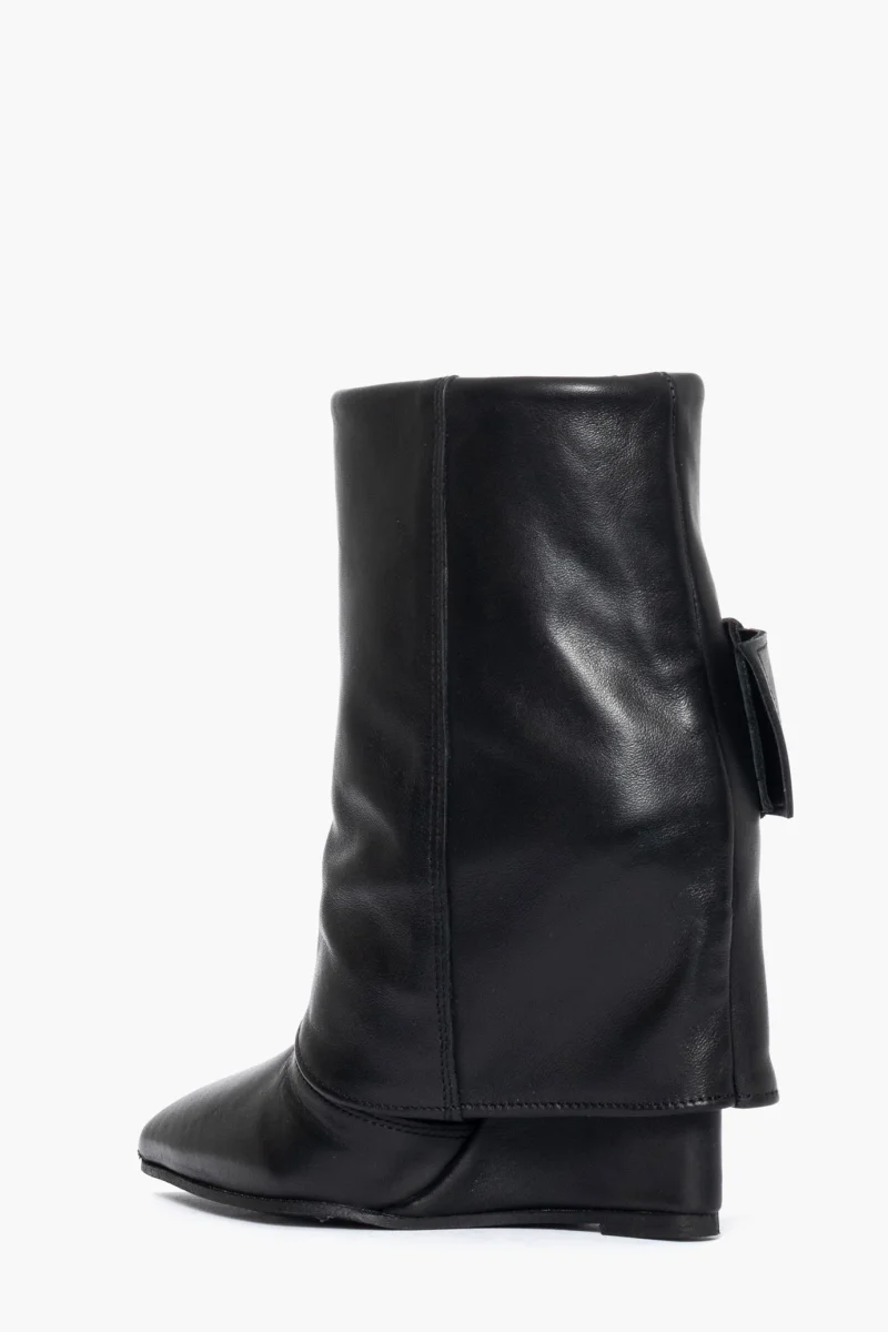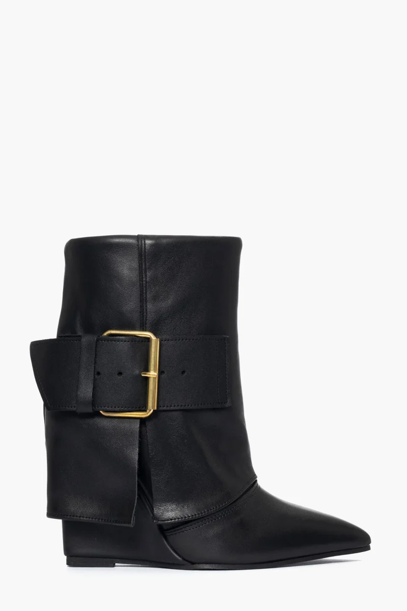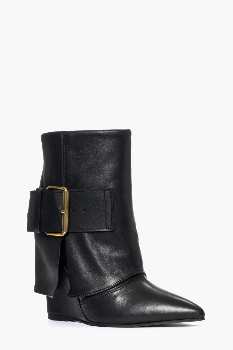 Tronchetti in pelle nero con risvolto e fibbia nel colore oro, zeppa rivestita, altezza11cm, interni in similpelle. Calzano giuste, punta stretta in avanti, calzature artigianali, made in Italy.