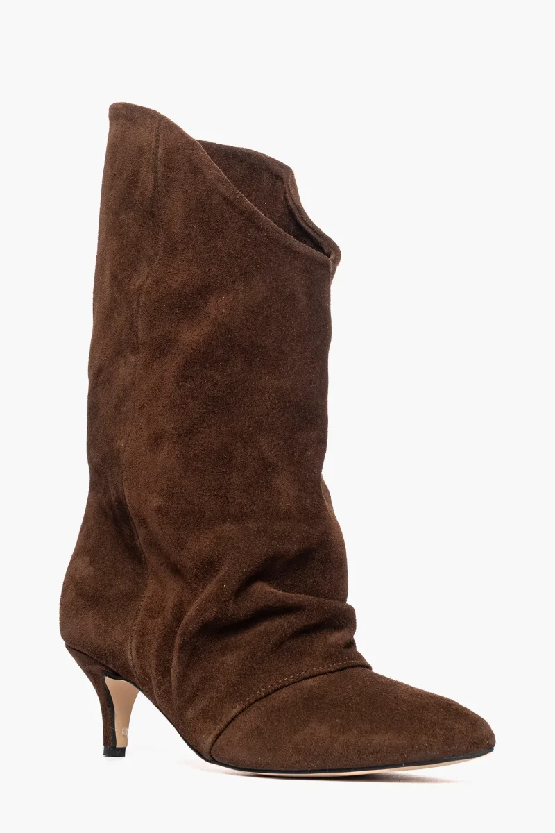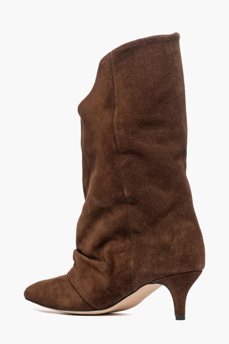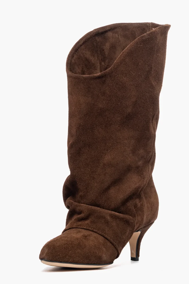 Stivaletti in camoscio marrone, con risvolto o senza, morbido e versatile, interni in similpelle, tacco rivestito, altezza 6, calzano regolari, punta stretta. Calzature artigianali. made in Italy.