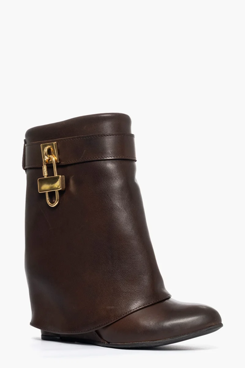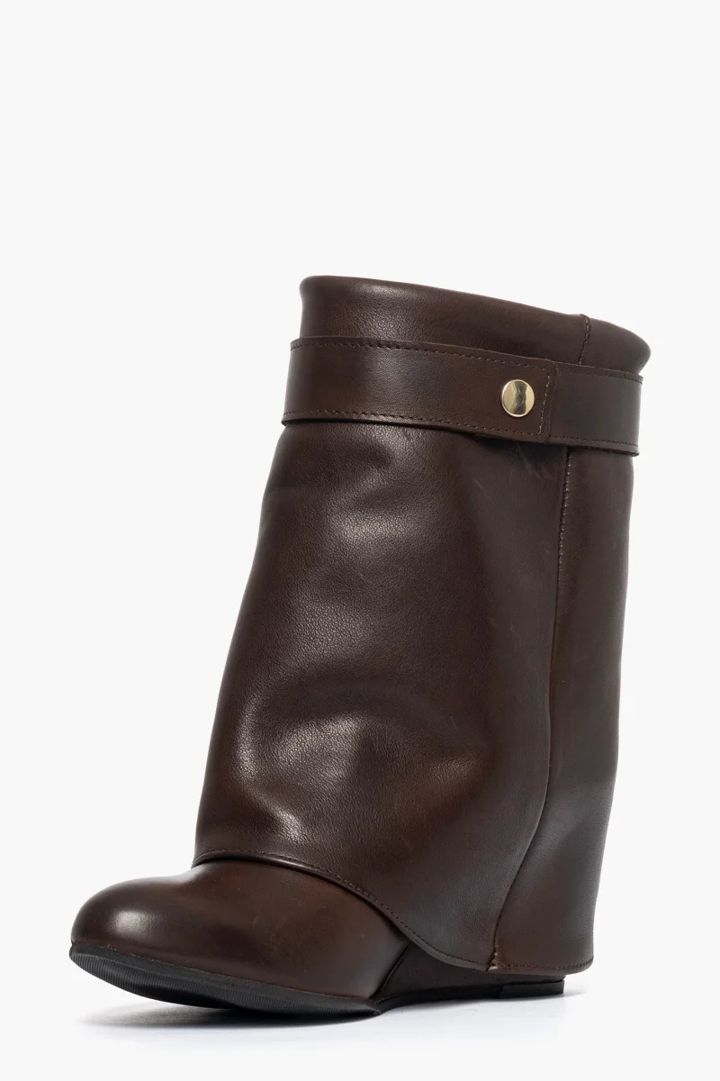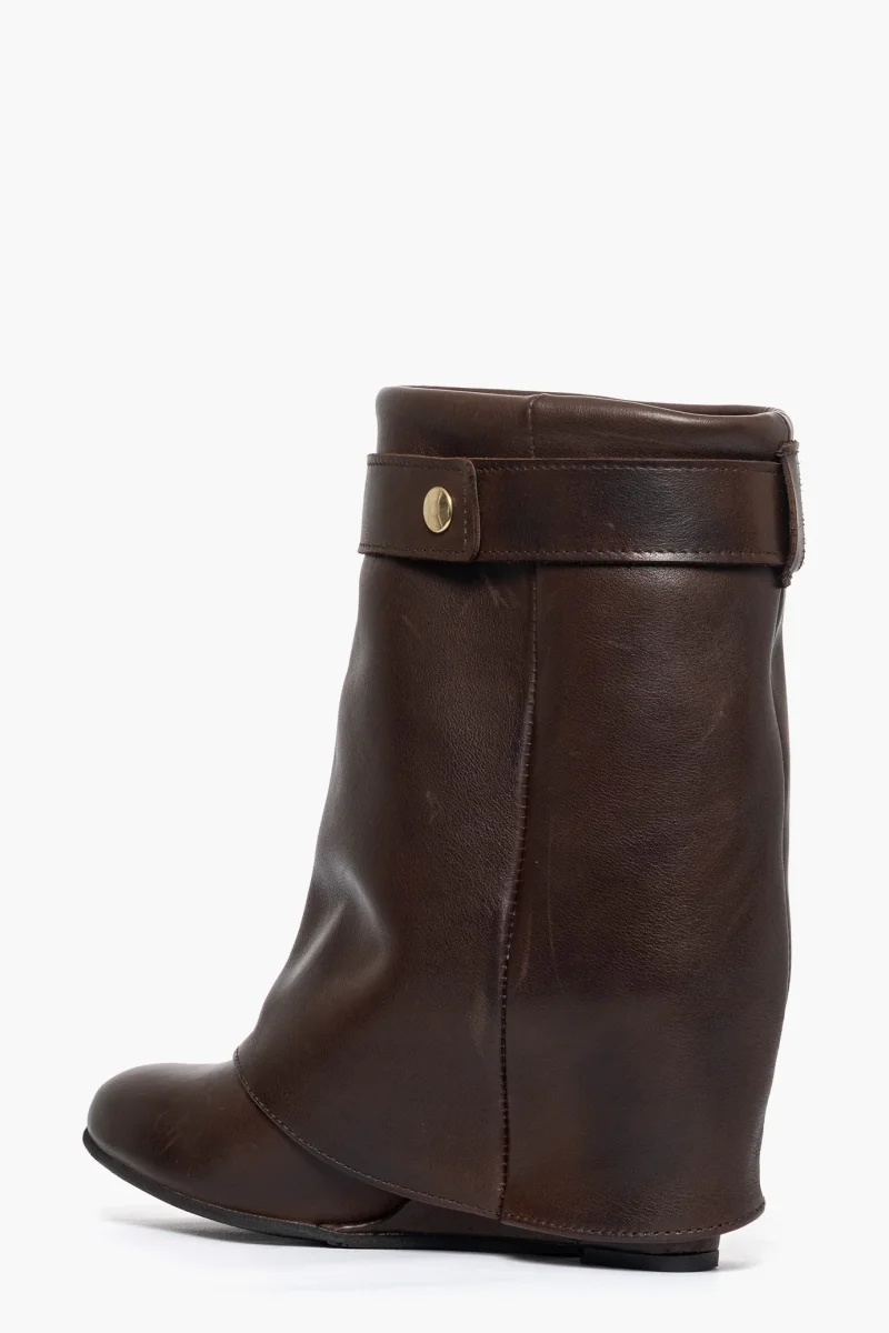 Stivaletto con risvolto in pelle testa di moro, rialzo esterno, zeppa rivestita, altezza 7. interni in similpelle, cintura con accessorio nel colore oro. Calzano regolari, calzature artigianali, made in Italy.