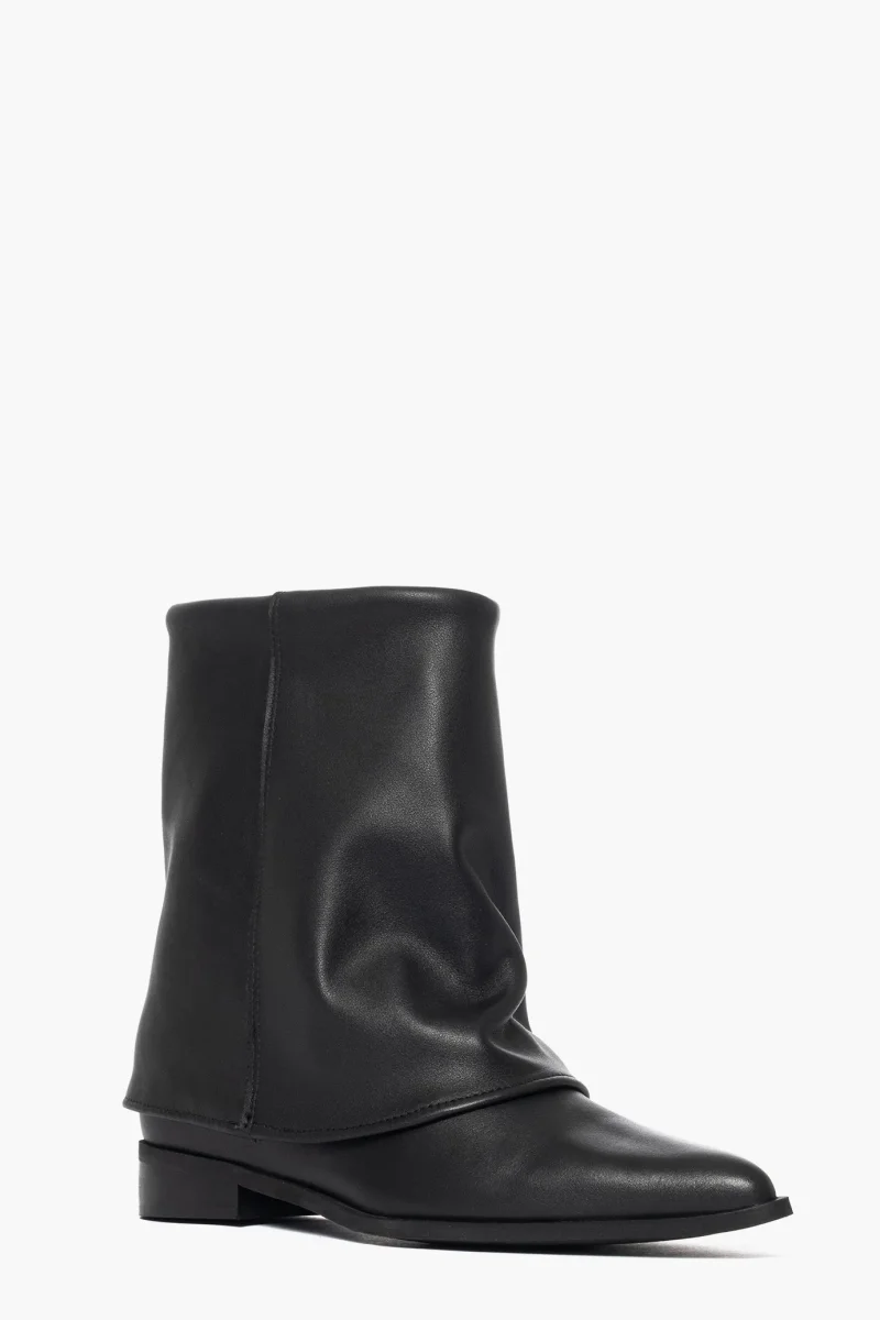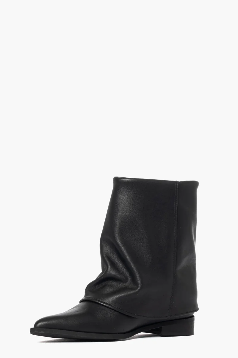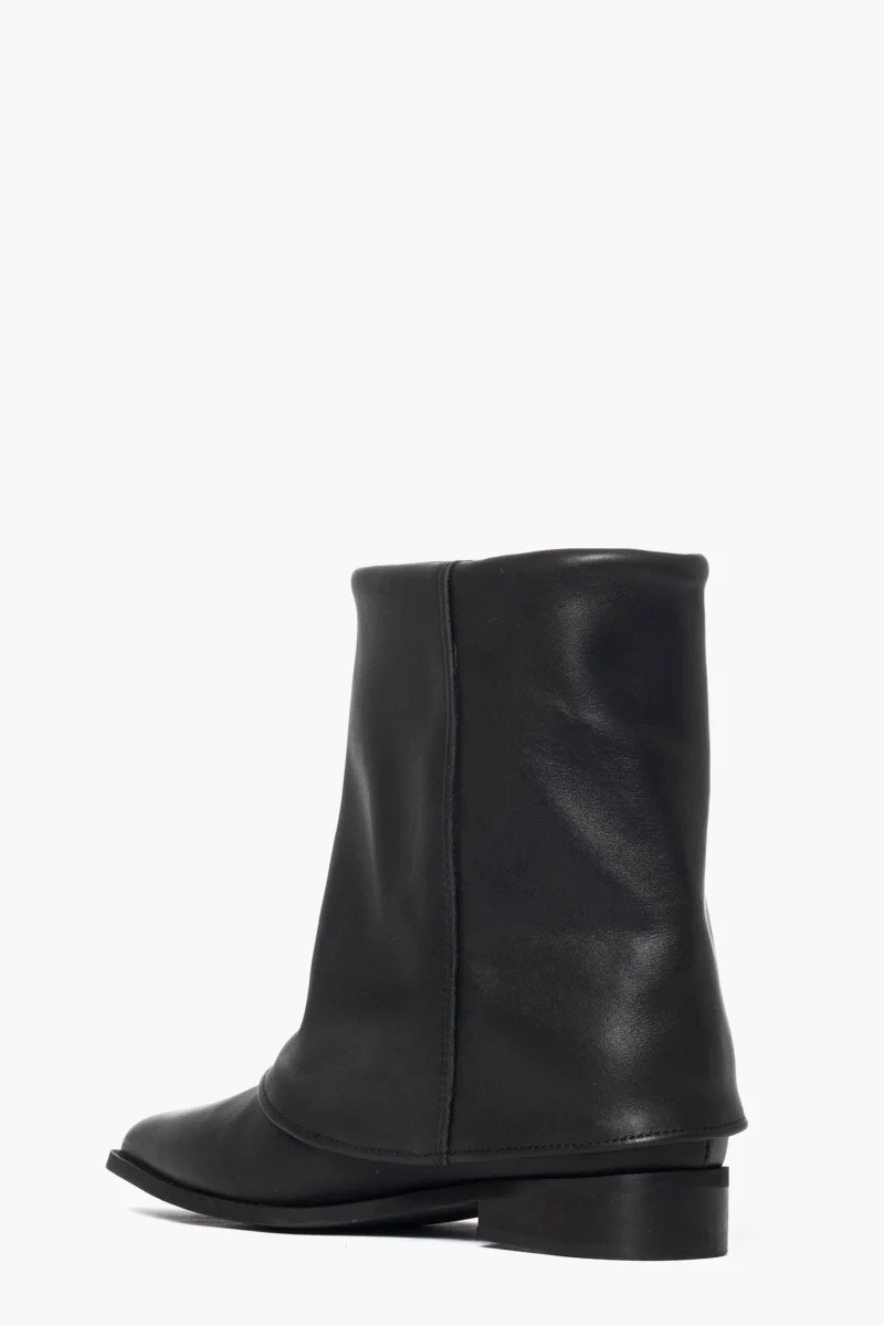 Stivaletti con risvolto, sopra alla caviglia, in pelle nero, rialzo interno 3,altezza totale 7, interni in similpelle, punta in avanti stretta. Calzano regolari. Calzature artigianali, made in Italy.