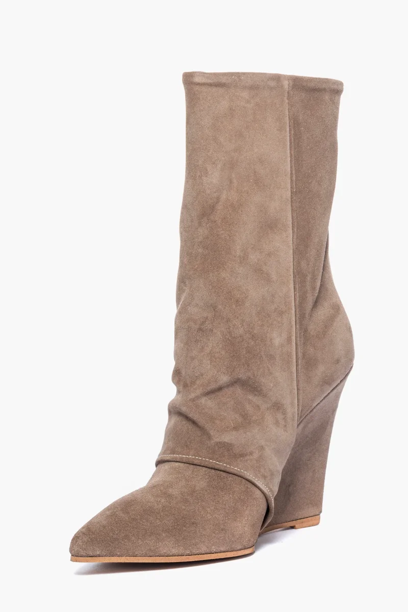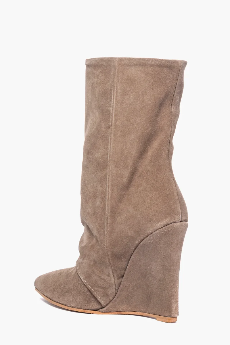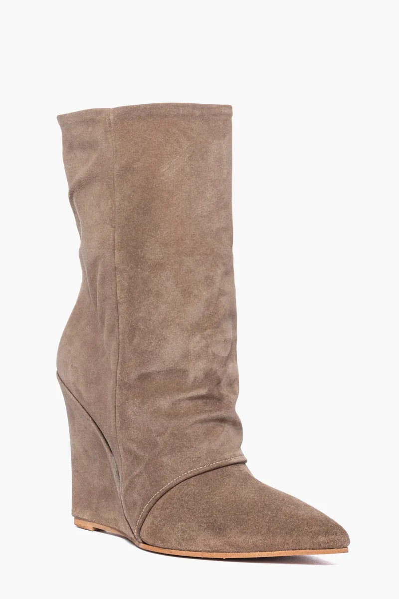 Stivaletti sotto al polpaccio in camoscio taupe, morbido alla gamba, interni e sottopiede in similpelle, zeppa rivestita in camoscio taupe, altezza 11 cm. Calzata giusta, punta stretta in avanti. Calzature realizzate in modo artigianale, rigorosamente Made in Italy.
