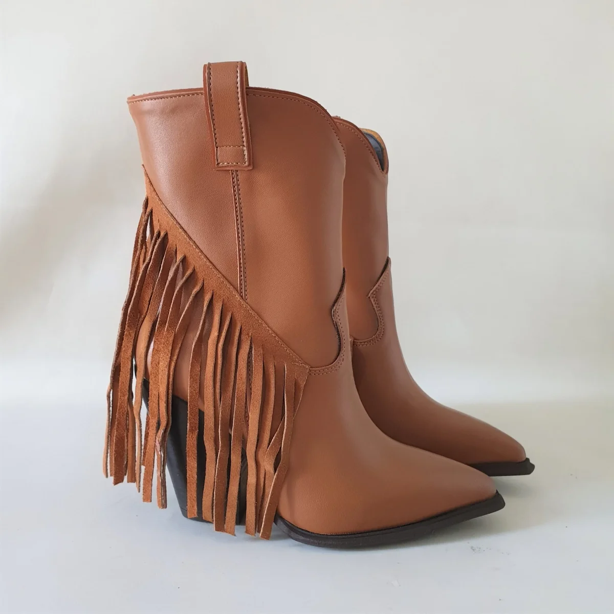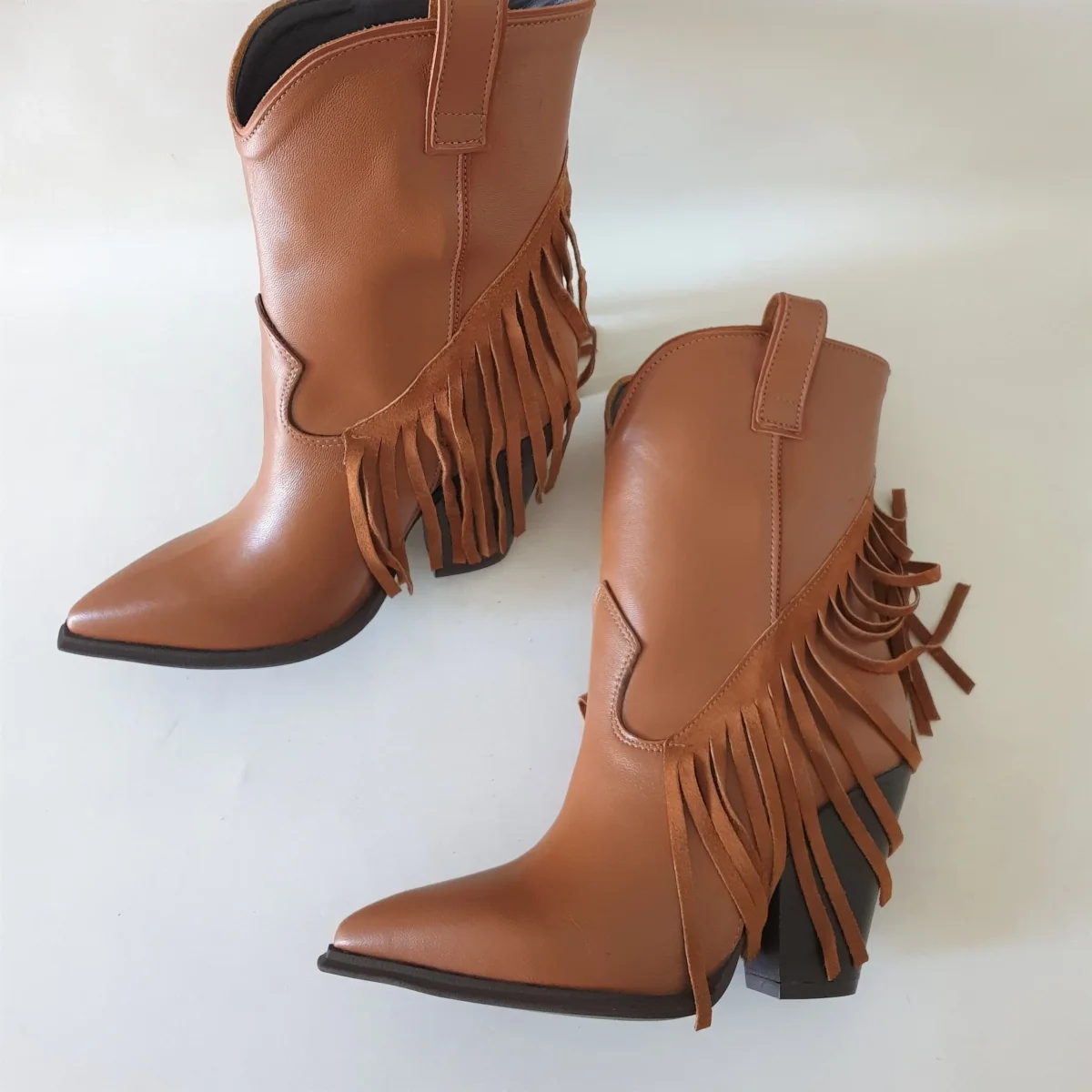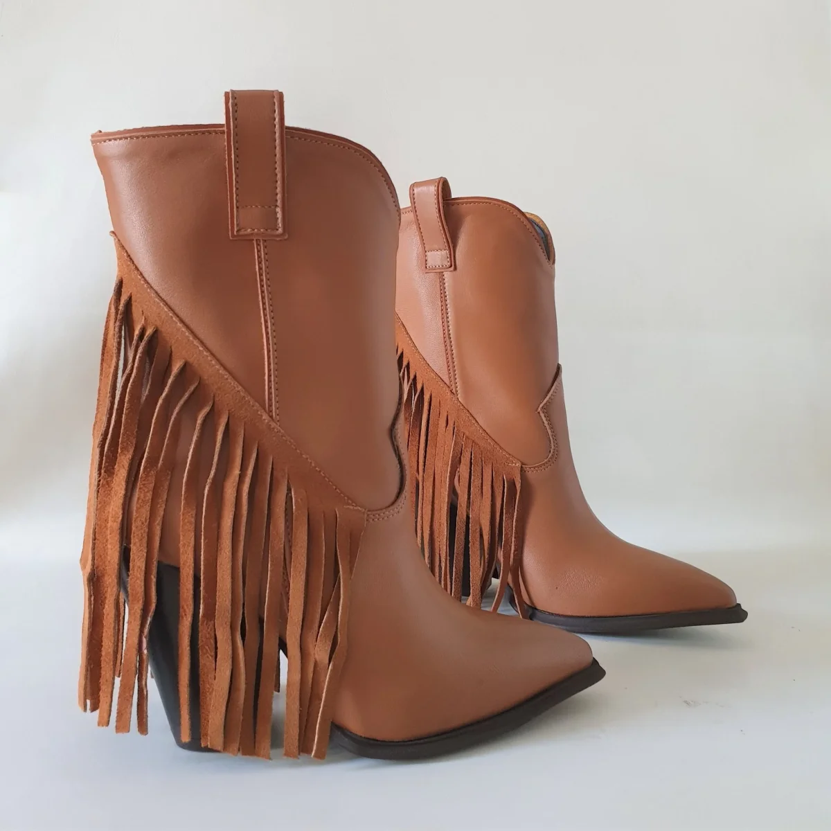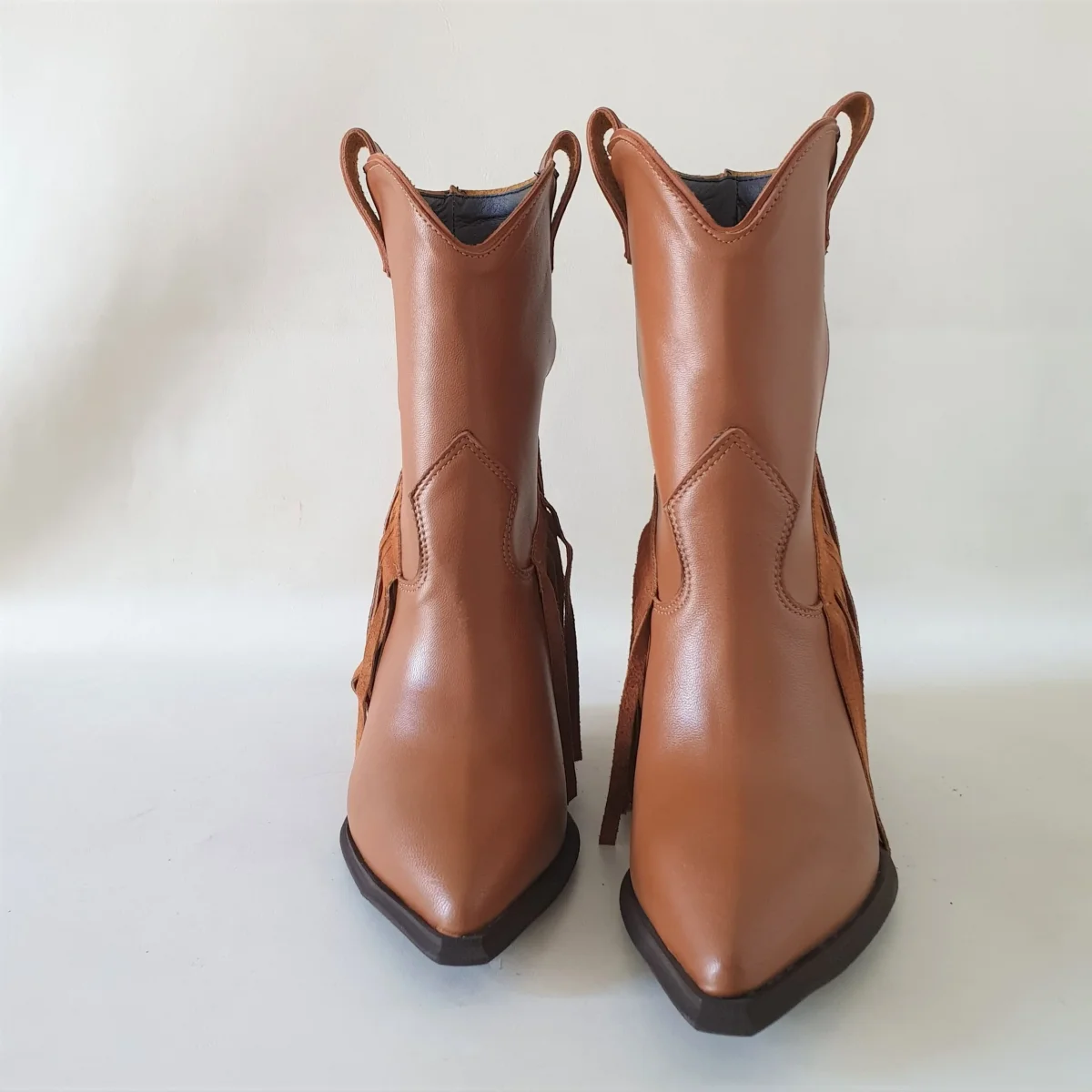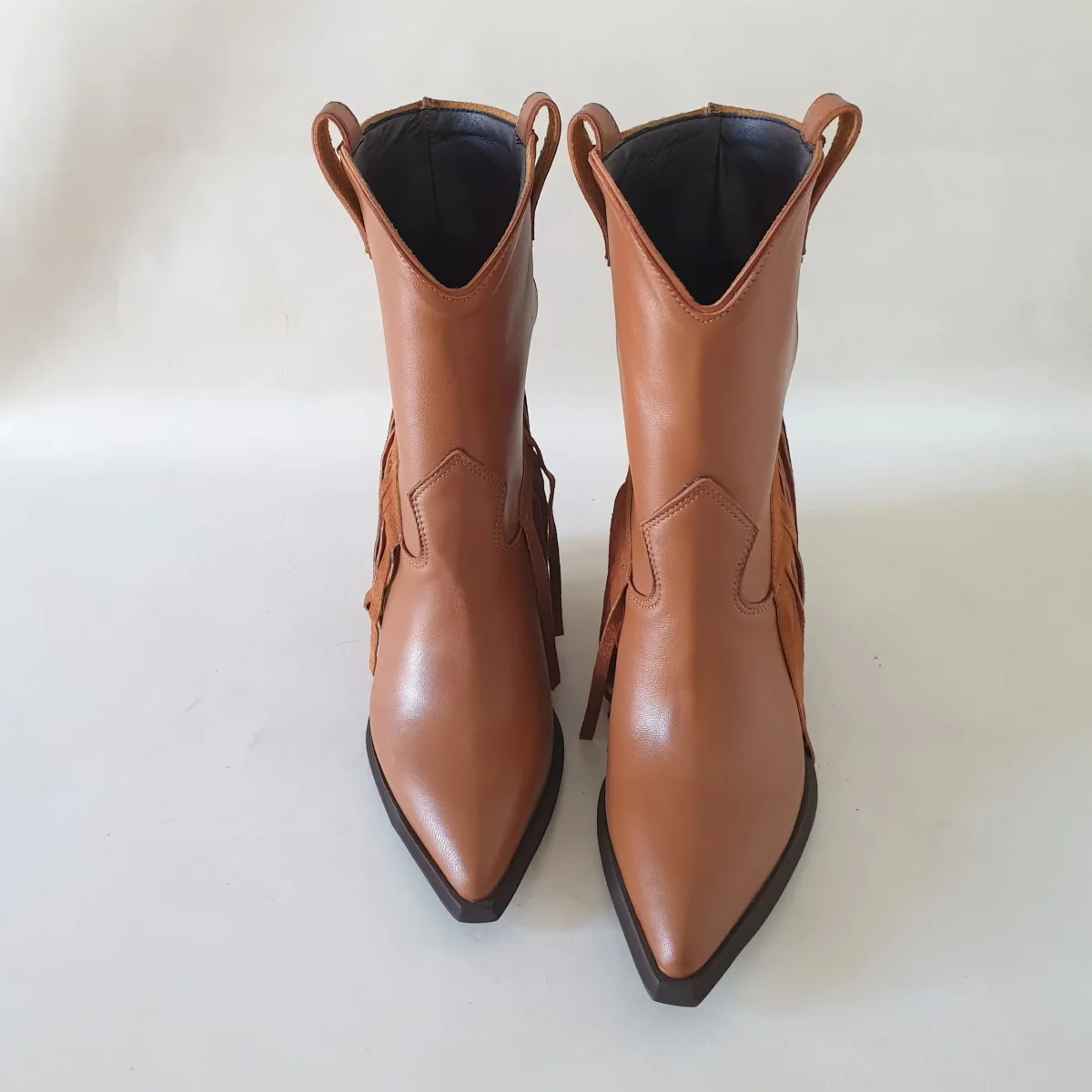 Stivaletti in pelle cuoio e frange in camoscio cuoio, spazzolato, effetto vintage, interni e sottopiede in similpelle, tacco nero altezza 8, calzano regolari, taglia italiana. Calzature realizzate artigianalmente, rigorosamente made in Italy.