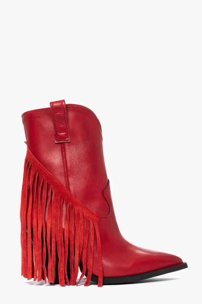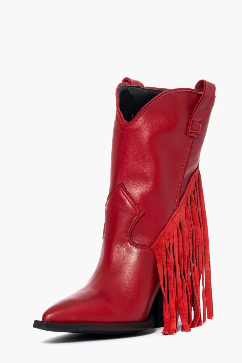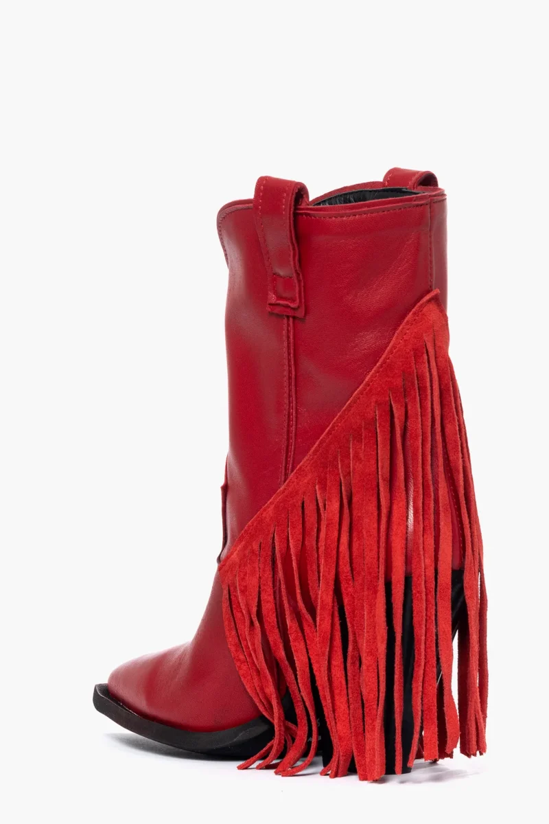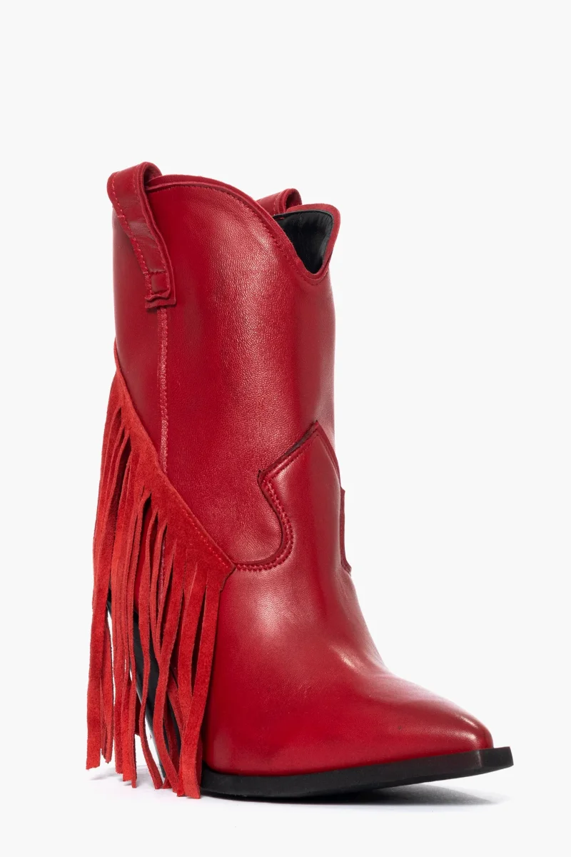 Stivaletti in pelle rosso e frange in camoscio rosso, spazzolato, effetto vintage, interni e sottopiede in similpelle, tacco nero altezza 8, calzano regolari, taglia italiana. Calzature realizzate artigianalmente, rigorosamente made in Italy.