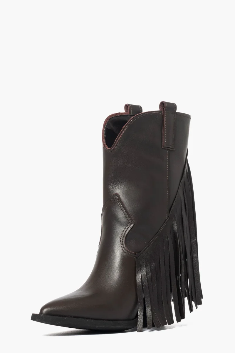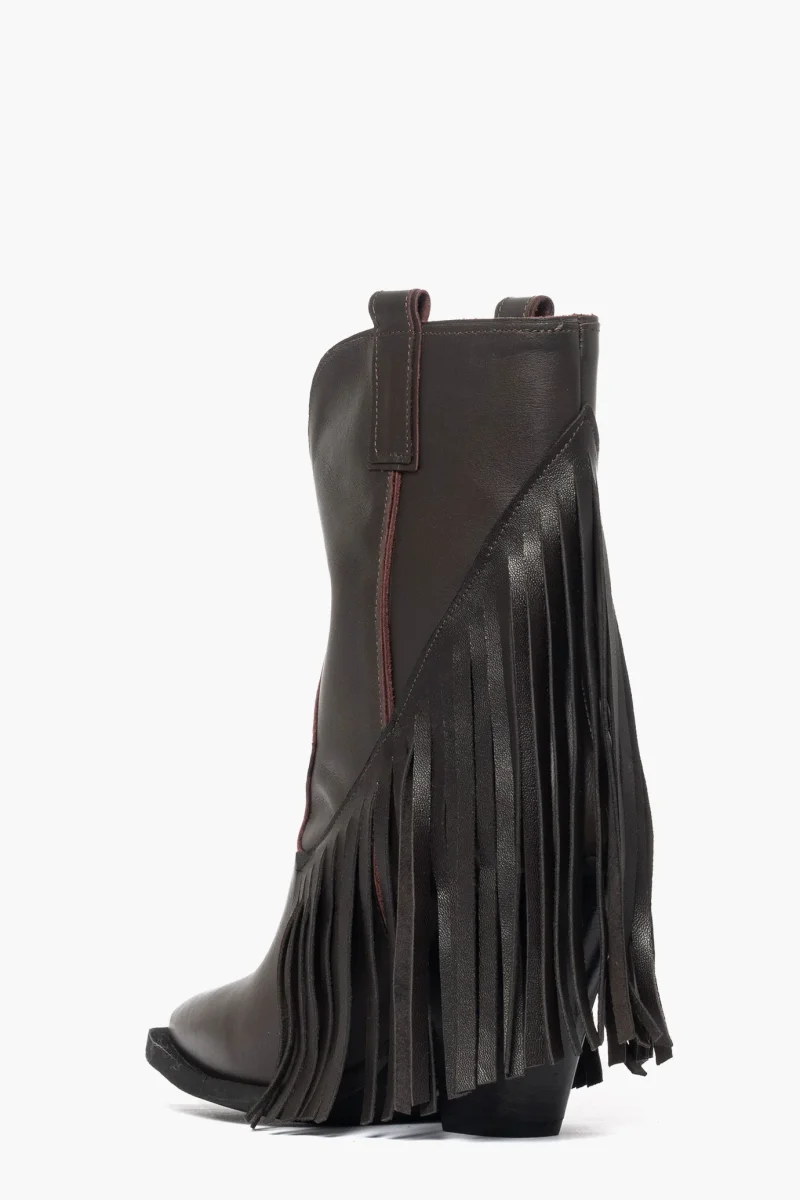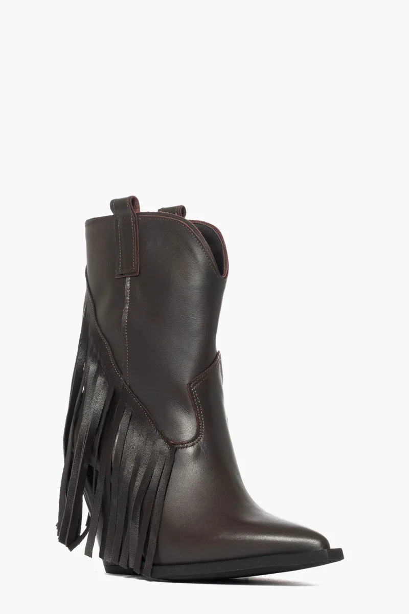 Stivaletti con frange in pelle testa di moro, interni e sottopiede in similpelle, tacco nero altezza 8, calzano regolari, taglia italiana. Calzature artigianali,made in Italy.