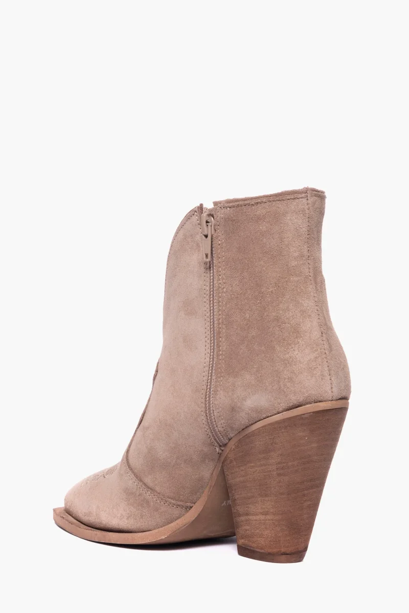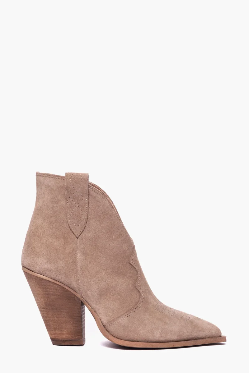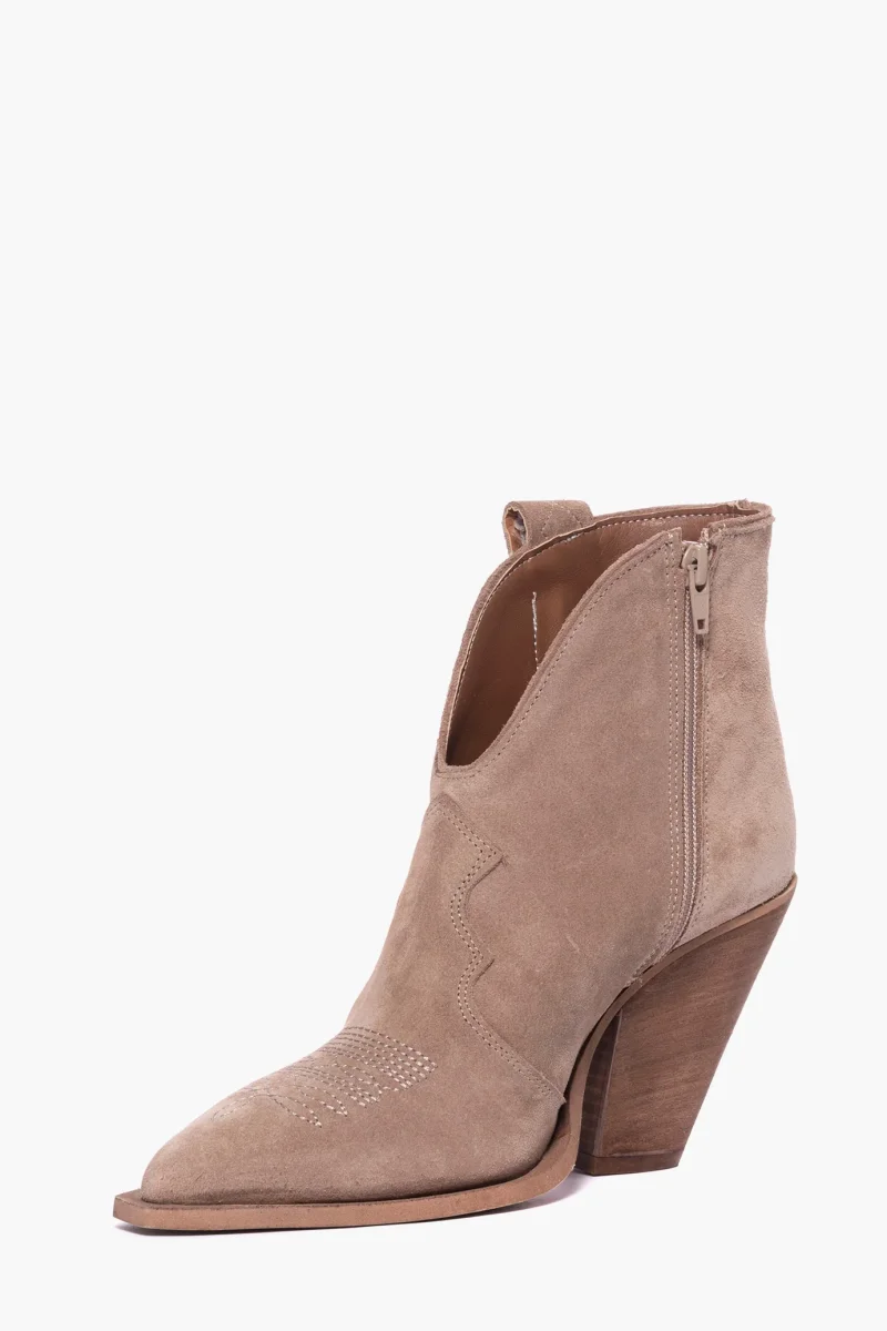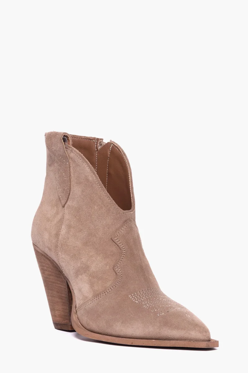 Stivaletti Gabriella Trend in camoscio taupe con scollo in avanti e ricamo in punta in tinta, zip interno piede, interni e sottopiede in similpelle, tacco neutro spazzolato, altezza 10 cm. Calzano regolari. Calzature realizzate in modo artigianale, rigorosamente made in Italy.