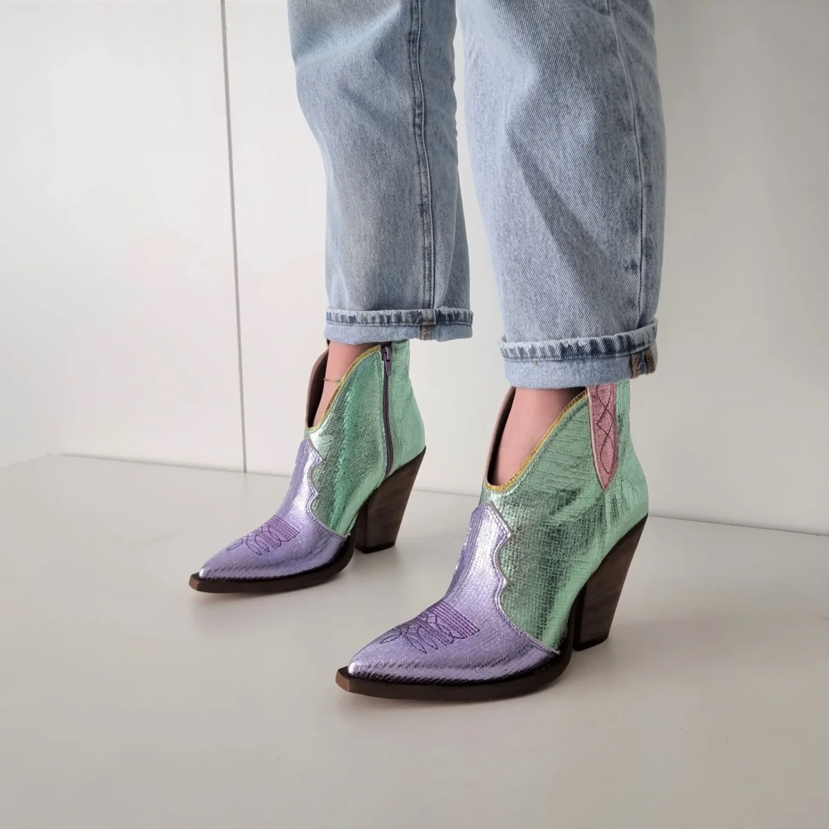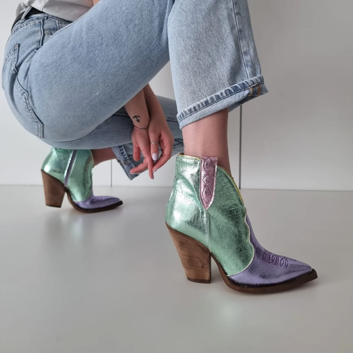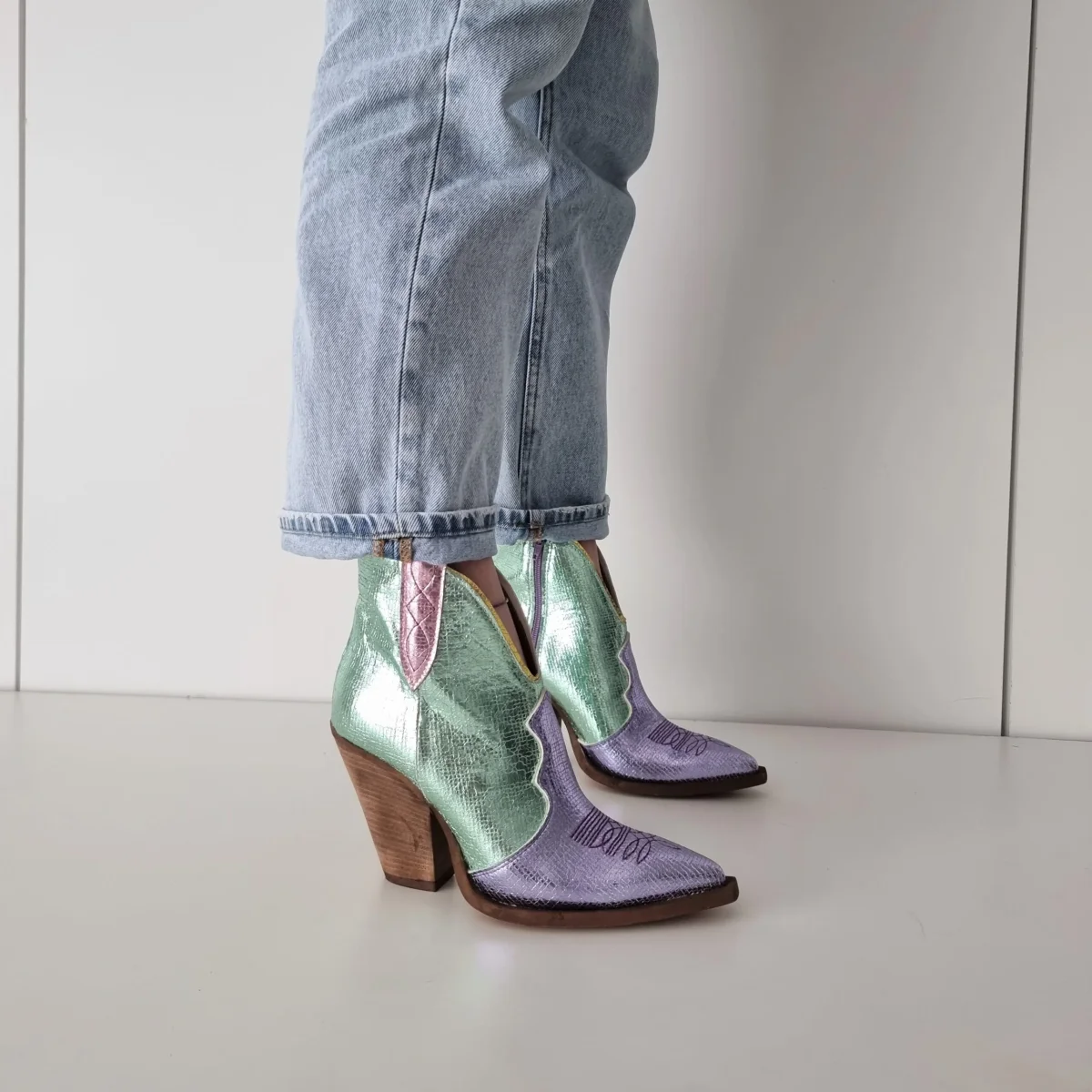 Stivaletti Gabriella Trend in tessuto crac laminato con scollo in avanti, ricamo in punta nella versione viola, verde e viola, con zip interno piede, interni e sottopiede in similpelle, tacco neutro spazzolato, altezza 10 cm. Calzano regolari. Calzature realizzate in modo artigianale, rigorosamente made in Italy.