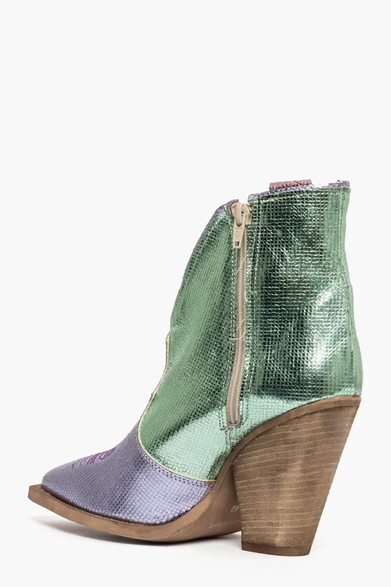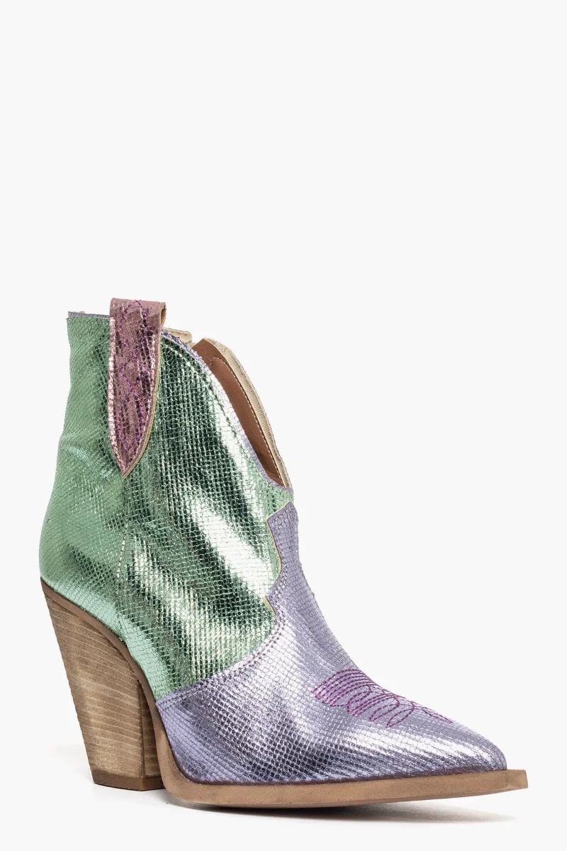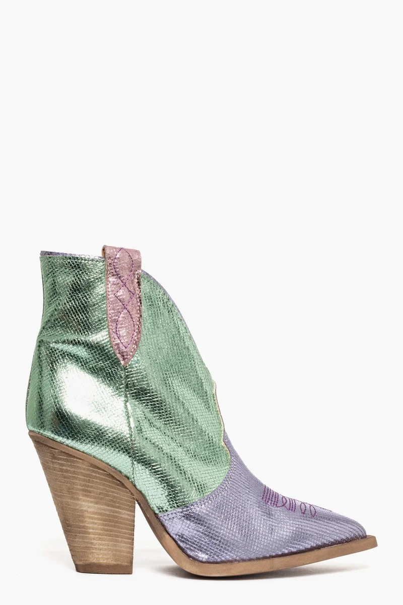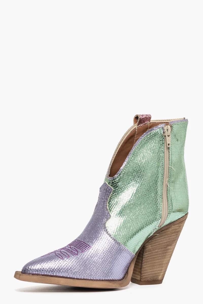 Stivaletti Gabriella Trend in tessuto crac laminato con scollo in avanti, ricamo in punta nella versione viola, verde e viola, con zip interno piede, interni e sottopiede in similpelle, tacco neutro spazzolato, altezza 10 cm. Calzano regolari. Calzature realizzate in modo artigianale, rigorosamente made in Italy.